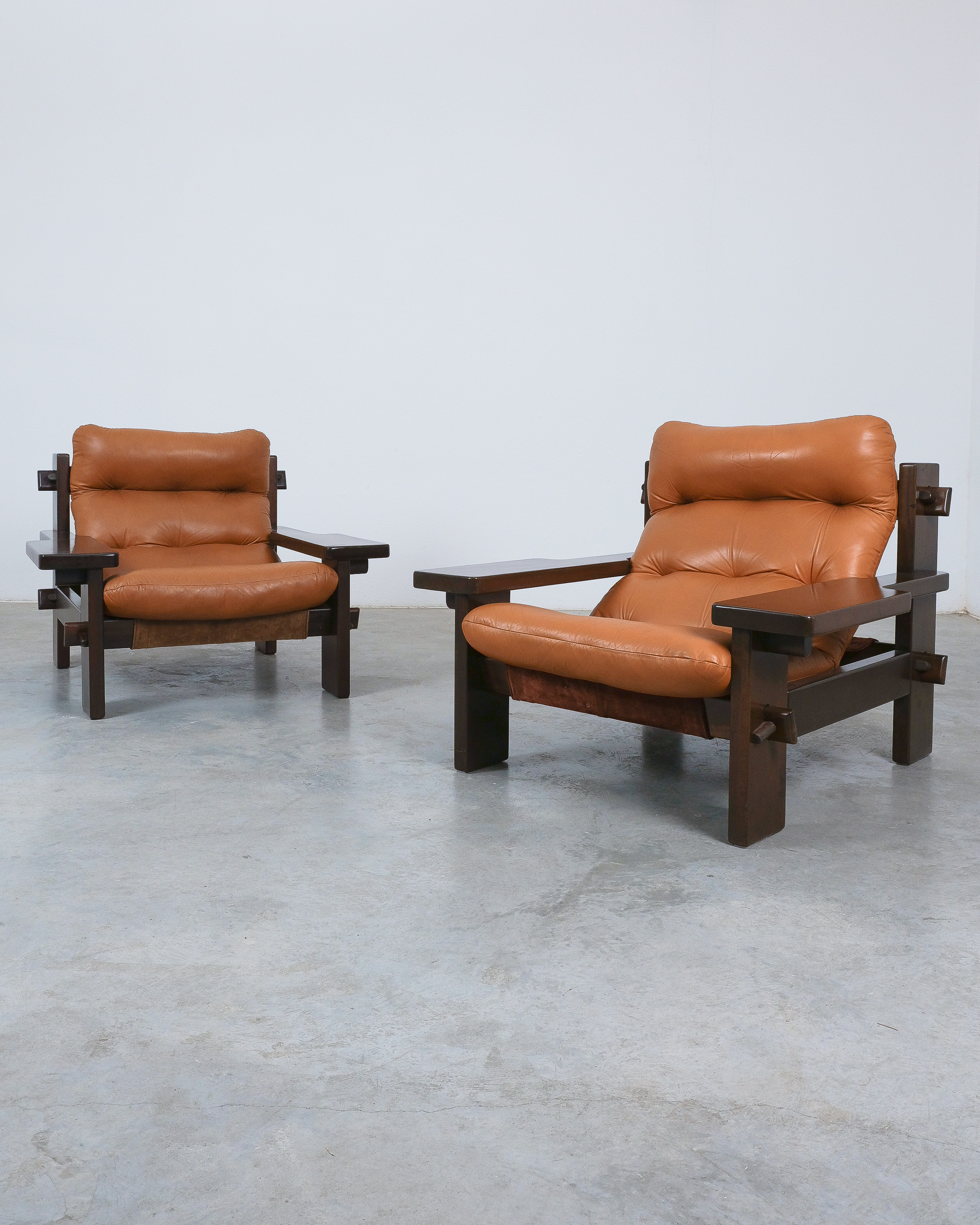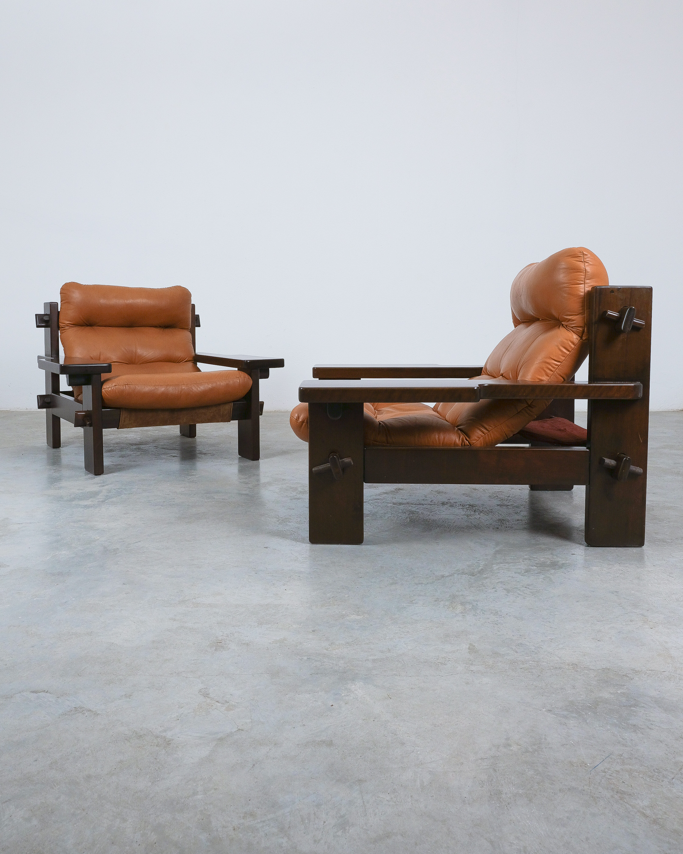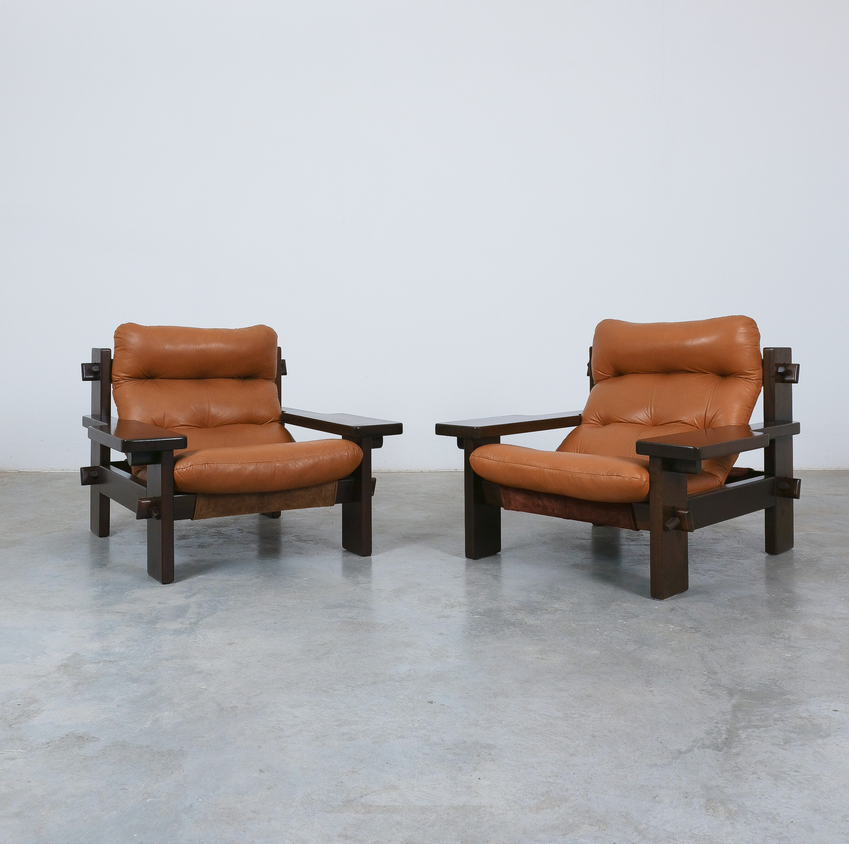 Paddel pair of chairs by Jean Gillon for Probel, in leather and wood