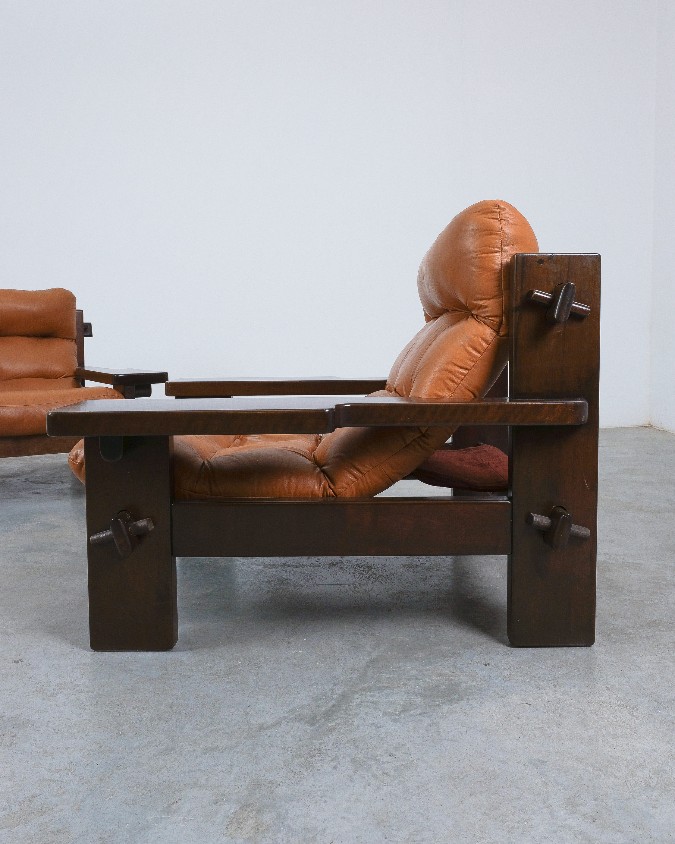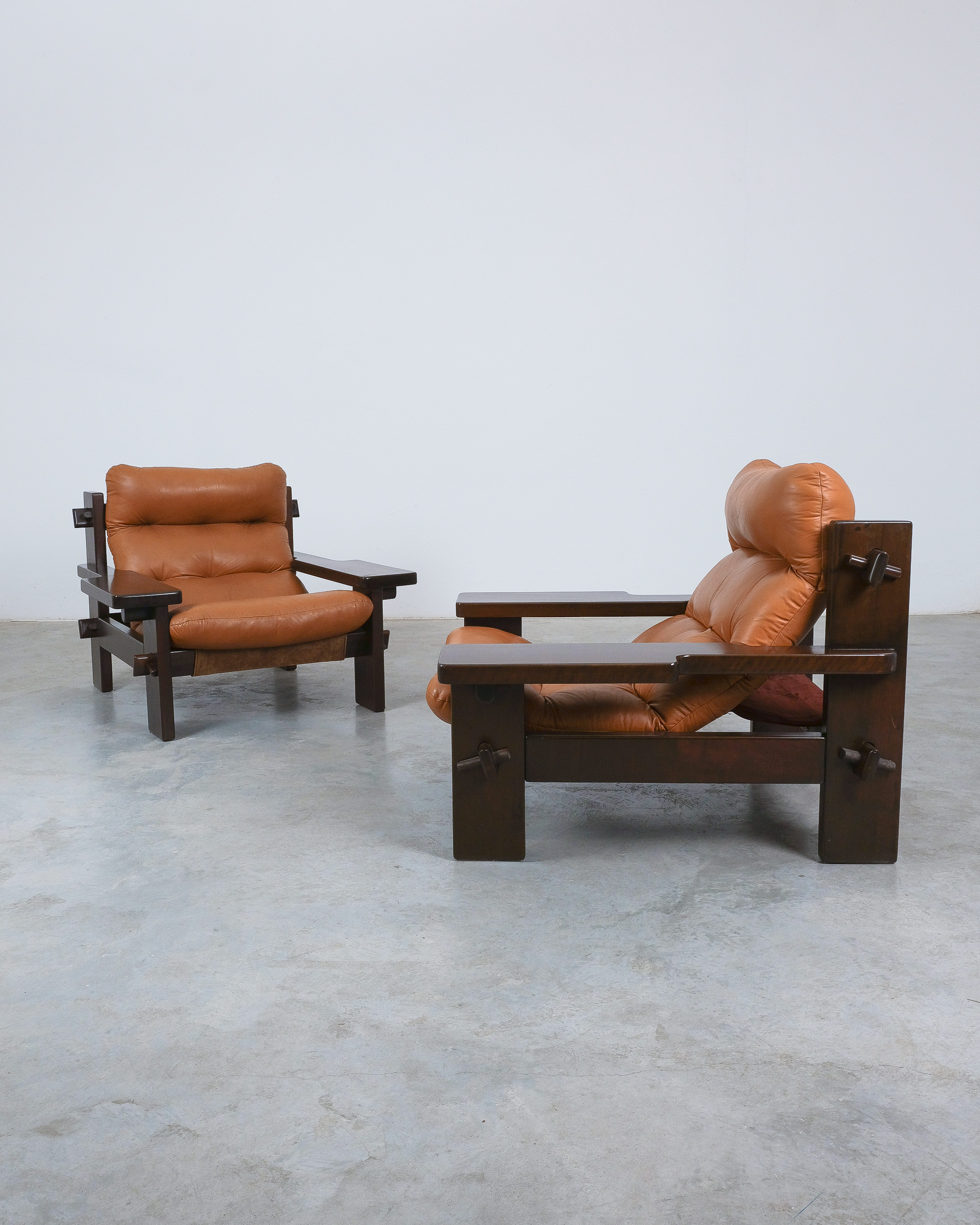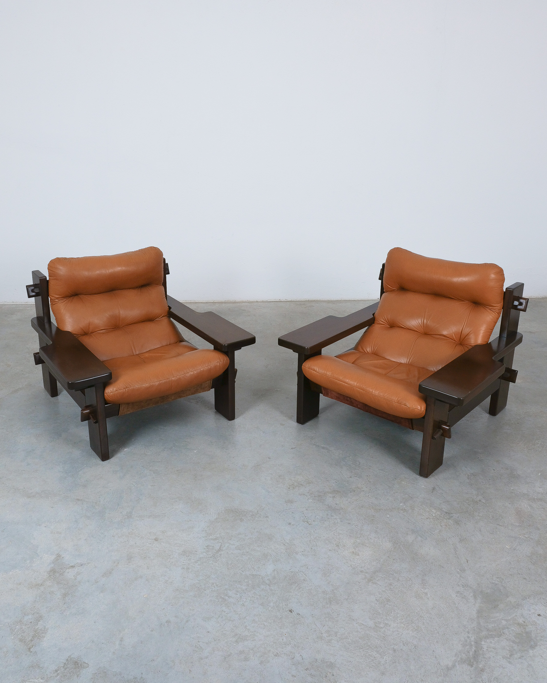 Paddel pair of chairs by Jean Gillon for Probel, in leather and wood