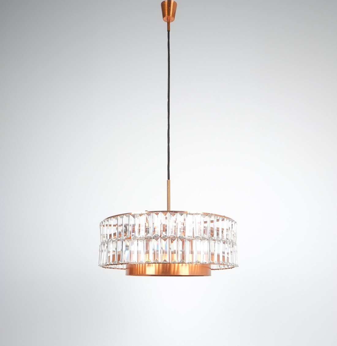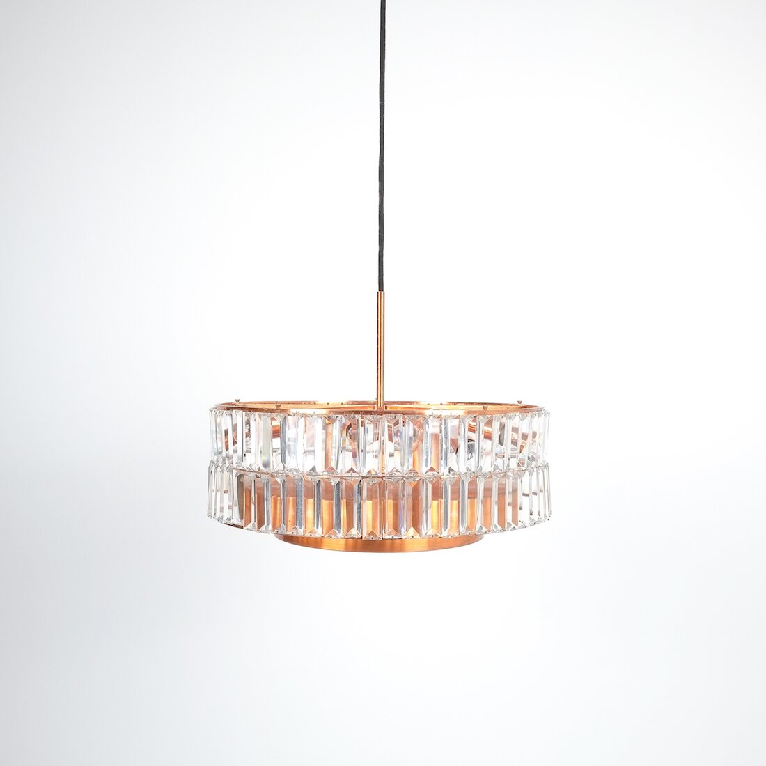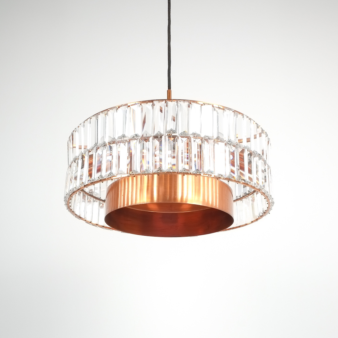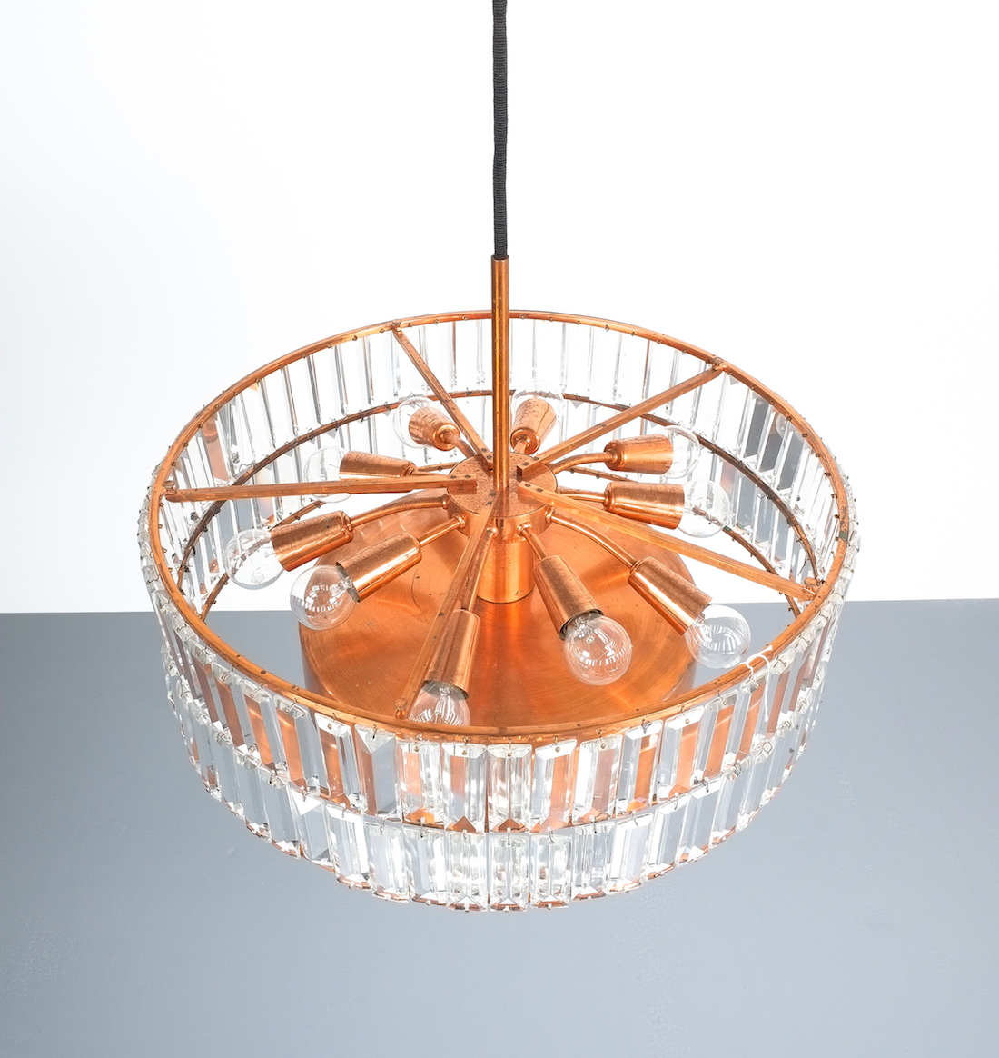 Jo Hammerborg attr. for Fog and Morup Large Chandelier Denmark Lamp, 1960. Made from copper and crystal cut glass this light illuminates beautifully with 11 bulbs in total (10x e14/1x e27) It has been refurbished and newly rewired for US and EU standards. Overall height as depicted is 39"; we can customize the drop according to our customers requirements.