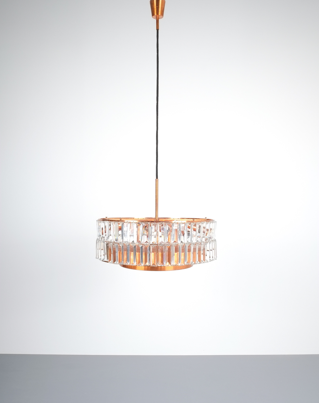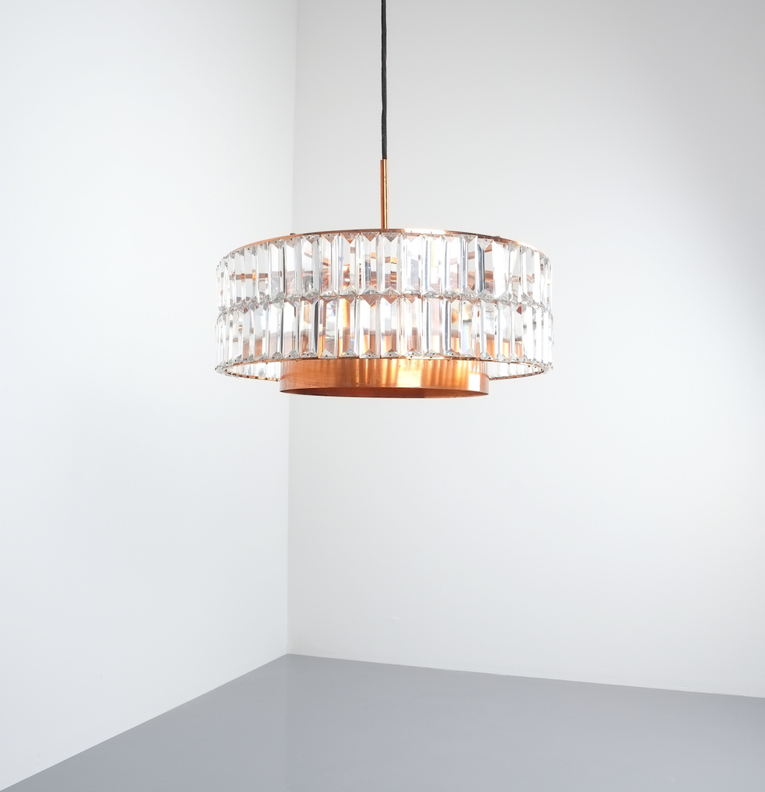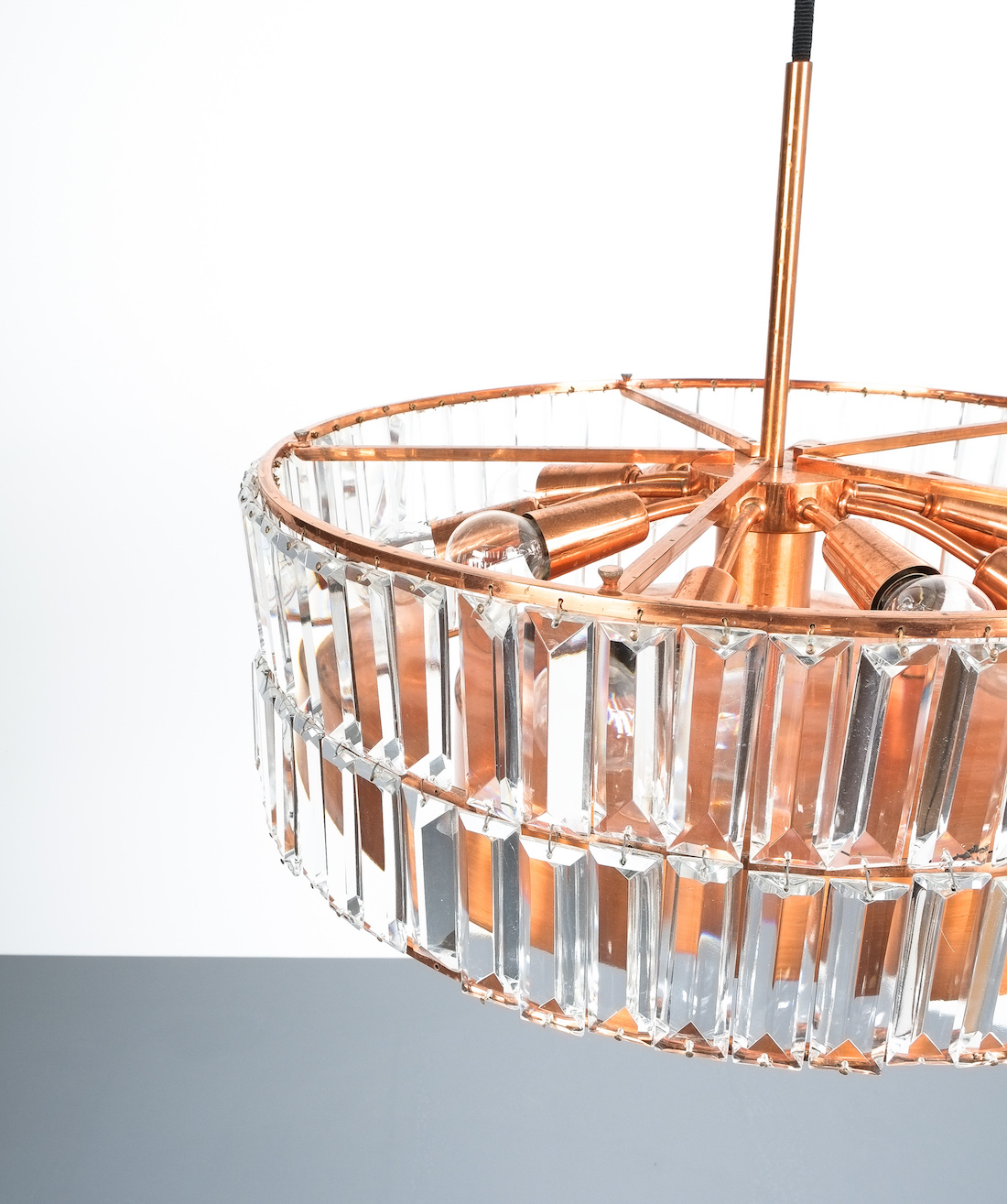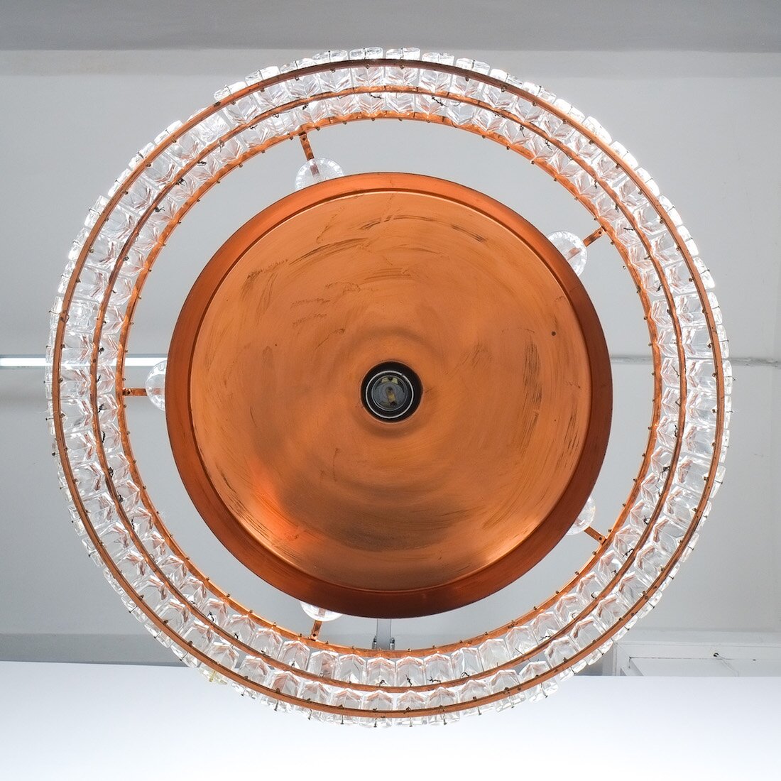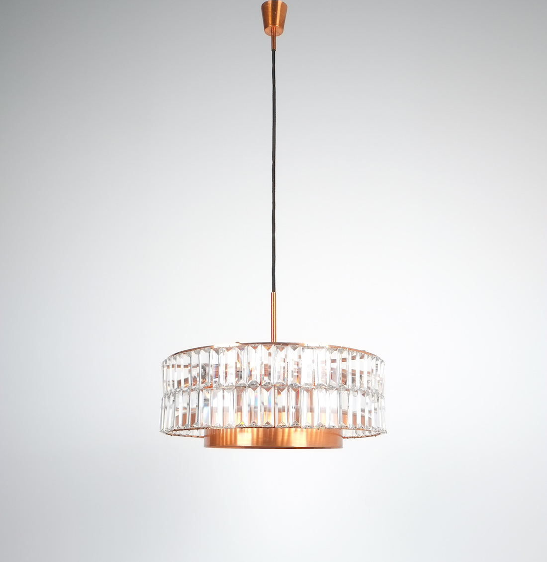Jo Hammerborg attr. for Fog and Morup Large Chandelier Denmark Lamp, 1960. Made from copper and crystal cut glass this light illuminates beautifully with 11 bulbs in total (10x e14/1x e27) It has been refurbished and newly rewired for US and EU standards. Overall height as depicted is 39"; we can customize the drop according to our customers requirements.