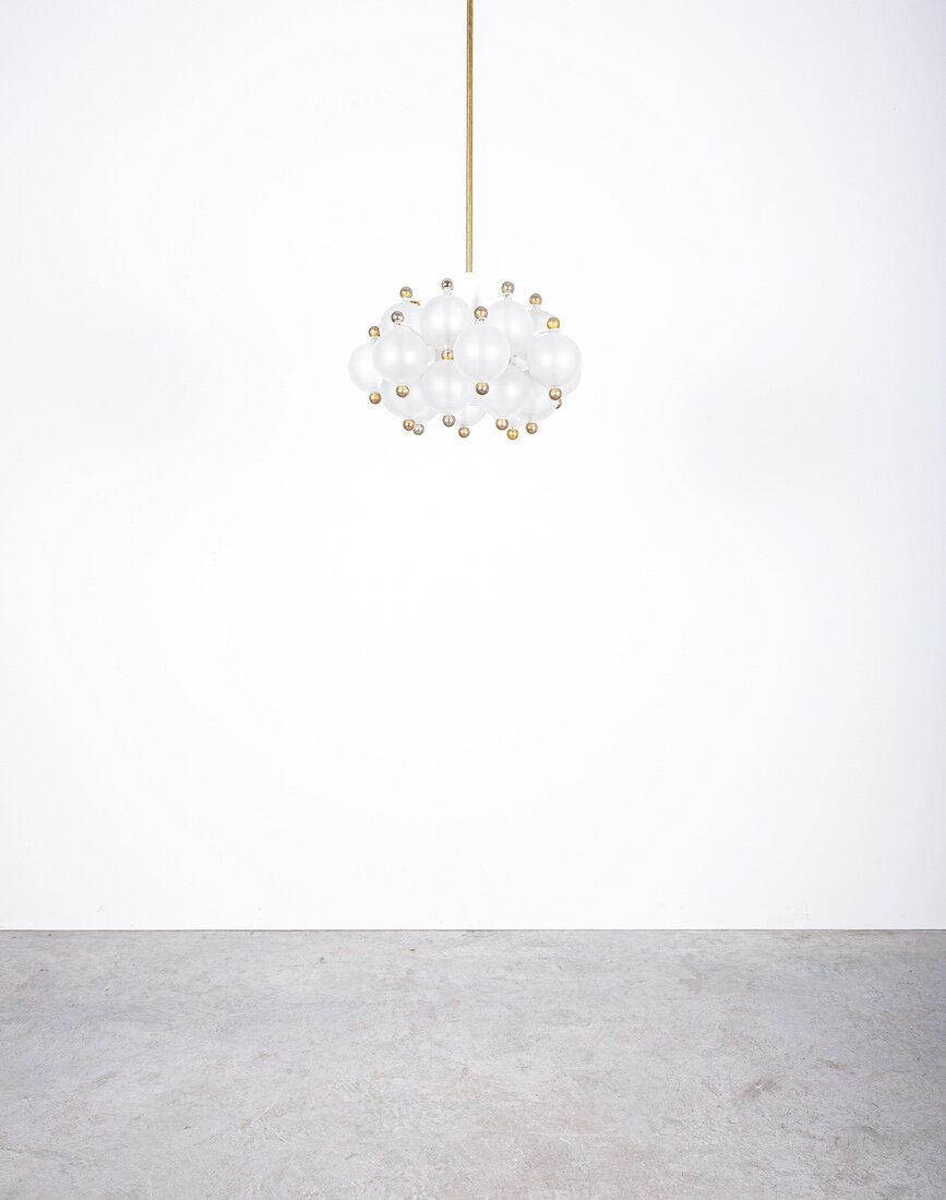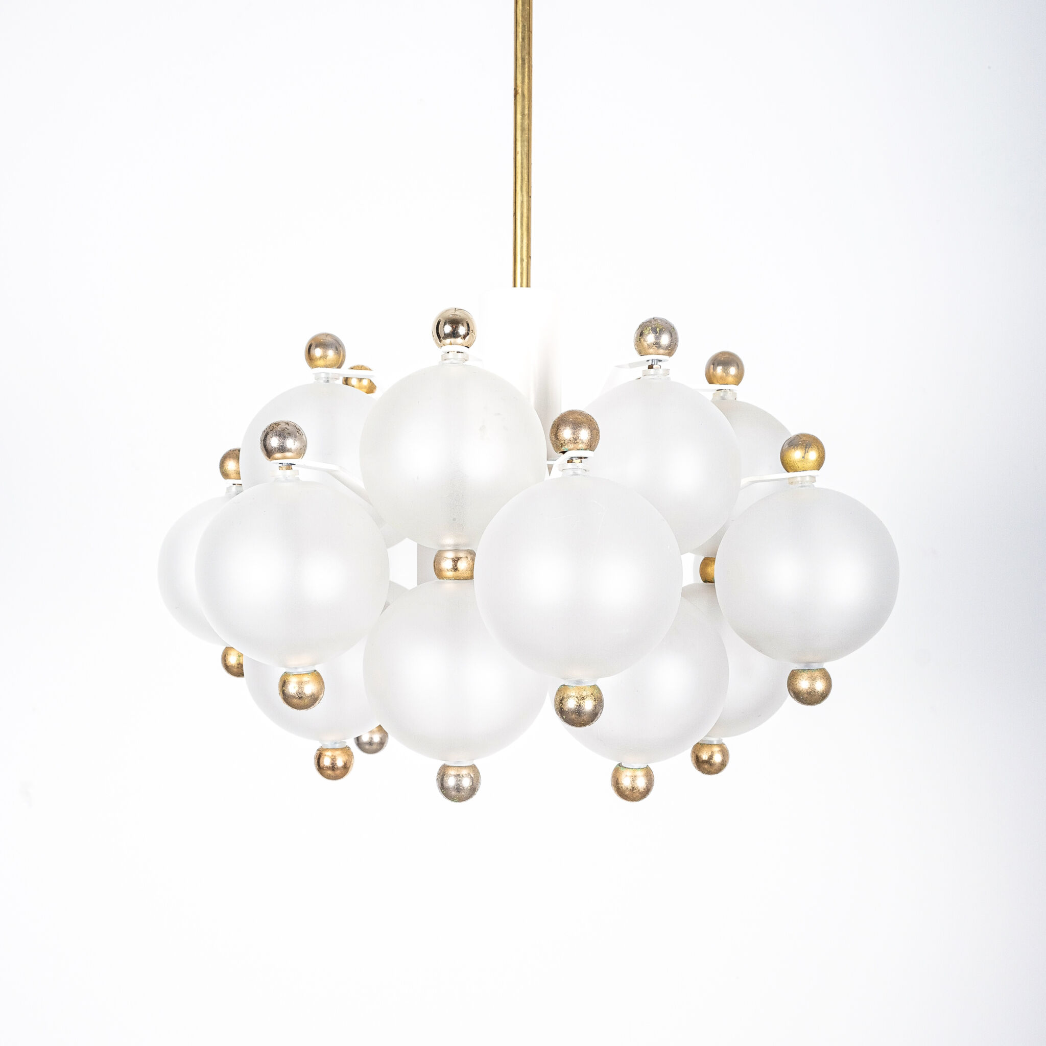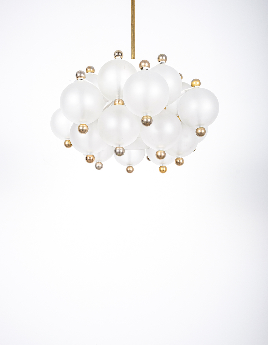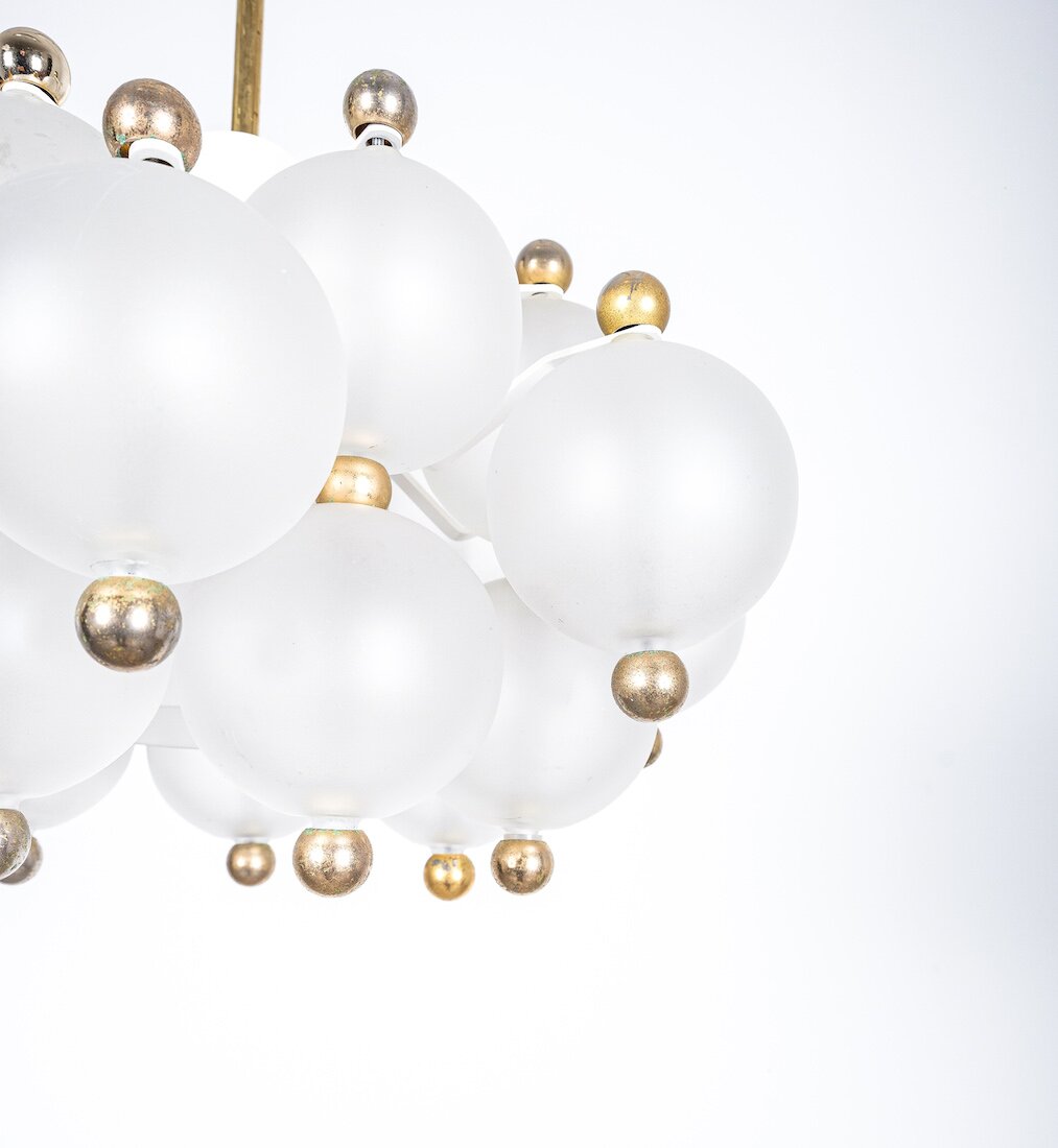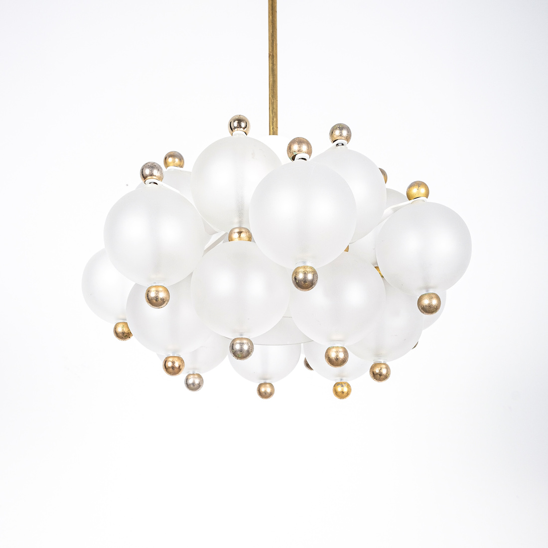 Two glass chandeliers by Kinkeldey. Great set of refurbished small chandeliers with a multitude of smooth translucent handblown glass balls with golden brass knobs.