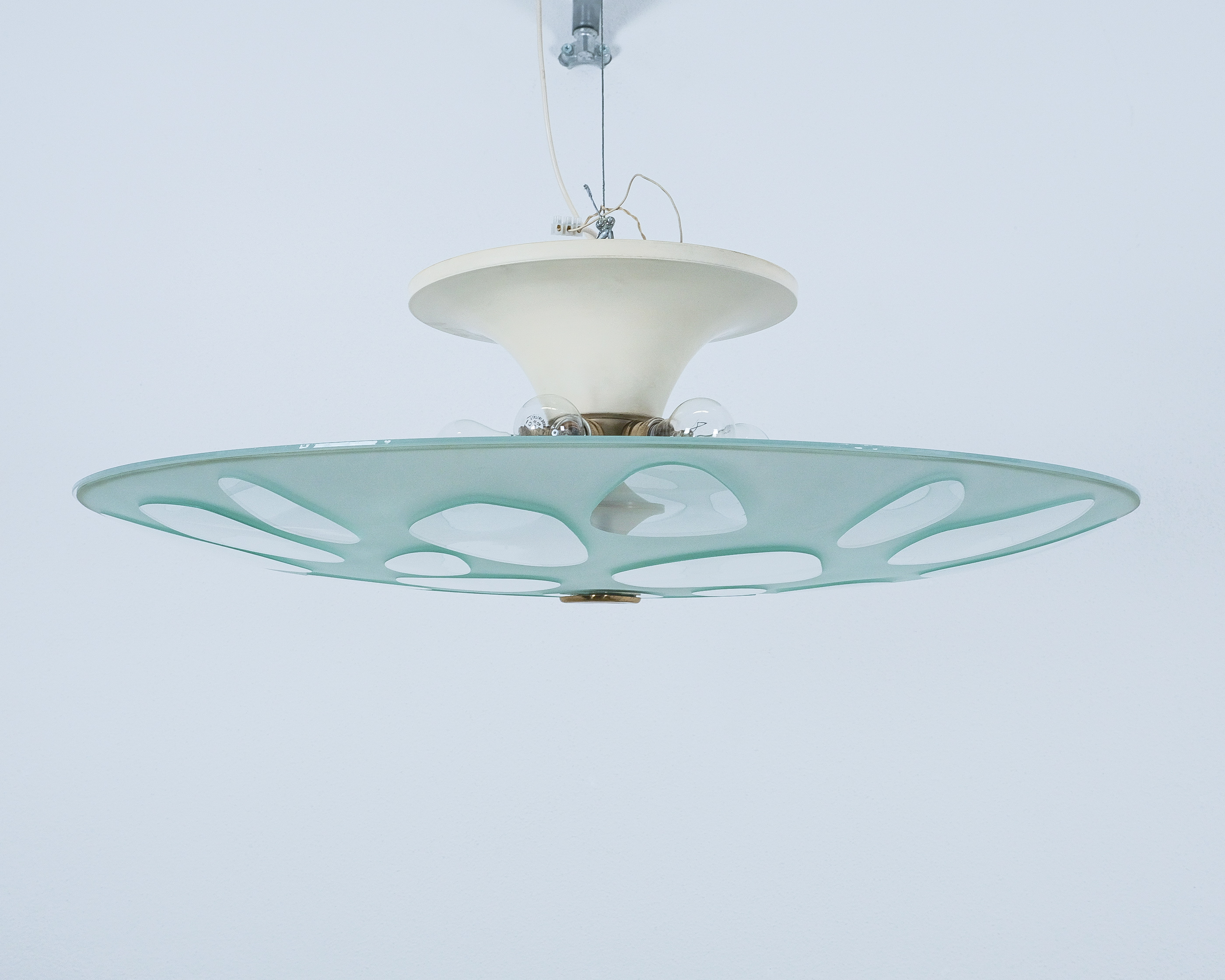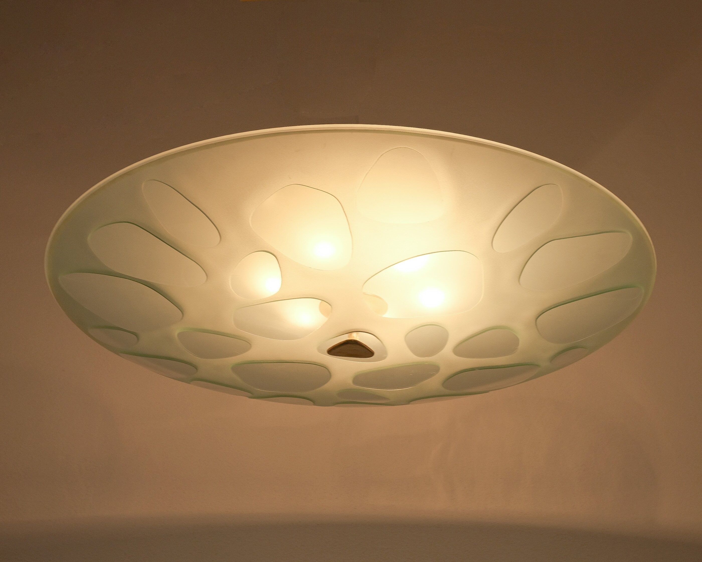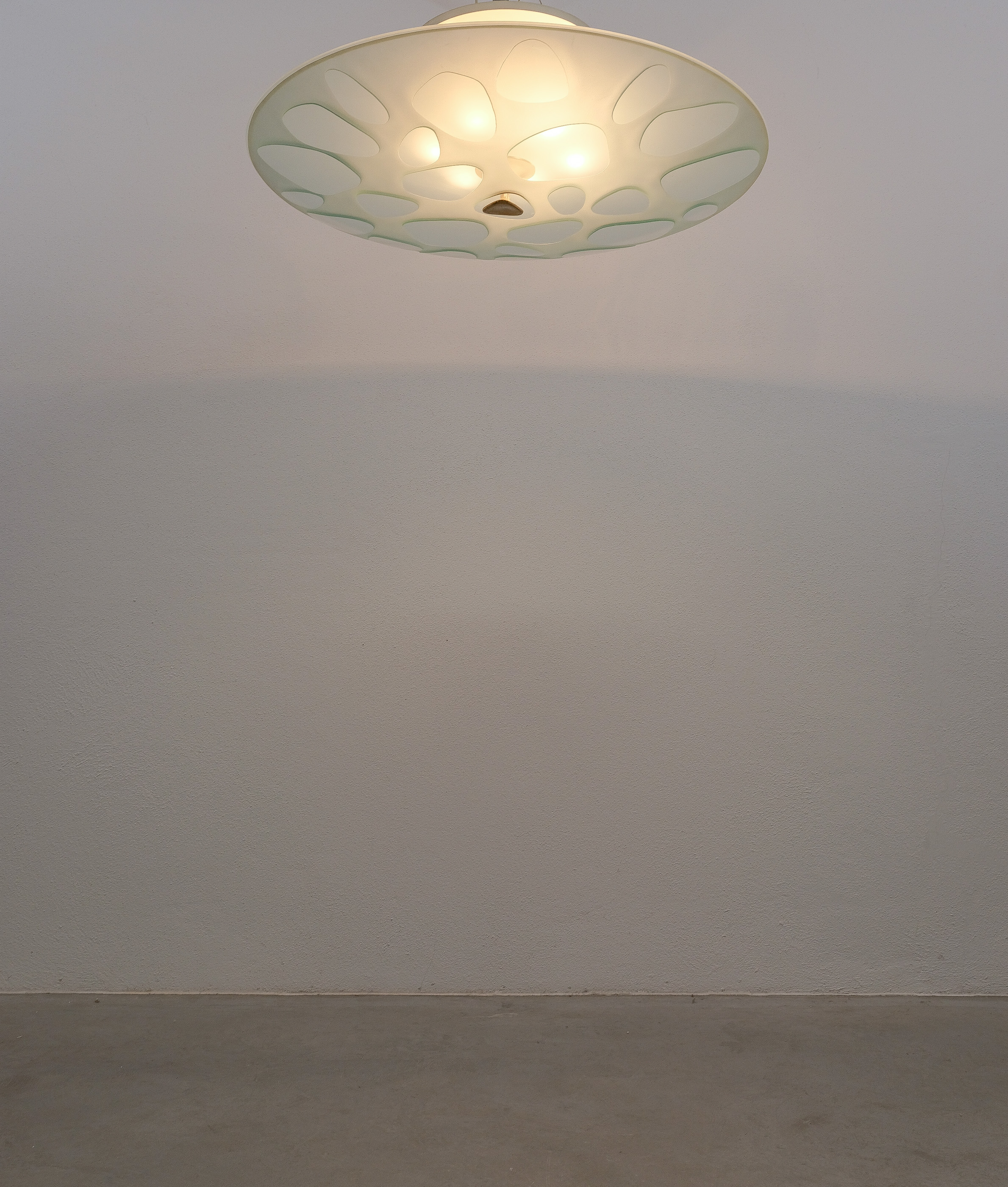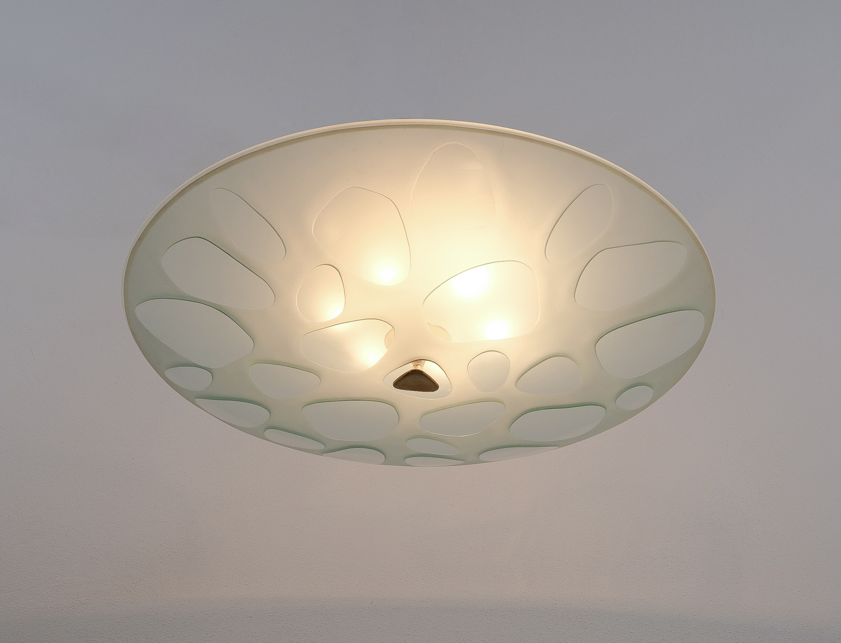 Early vintage original flush mount light by Max Ingrand. Iconic large fixture with deep sandblasted incisions leaving smaller archipelagos from clear glass, that have later been polished. It's a very delicate piece with outstanding glass work. The metal funnel has its preserved original lacquer from the 1950's. Six large e26/27 bulbs are illuminating a sandblasted large 36" glass disc-diffuser first, so the bulbs are not visible from underneath the light. It's in very good condition considering an age of 65 years. The glass shows no chips or cracks. The original lacquered aluminum parts we left untouched. It shows smaller sections of color-loss. The brass shows an even and golden patina.