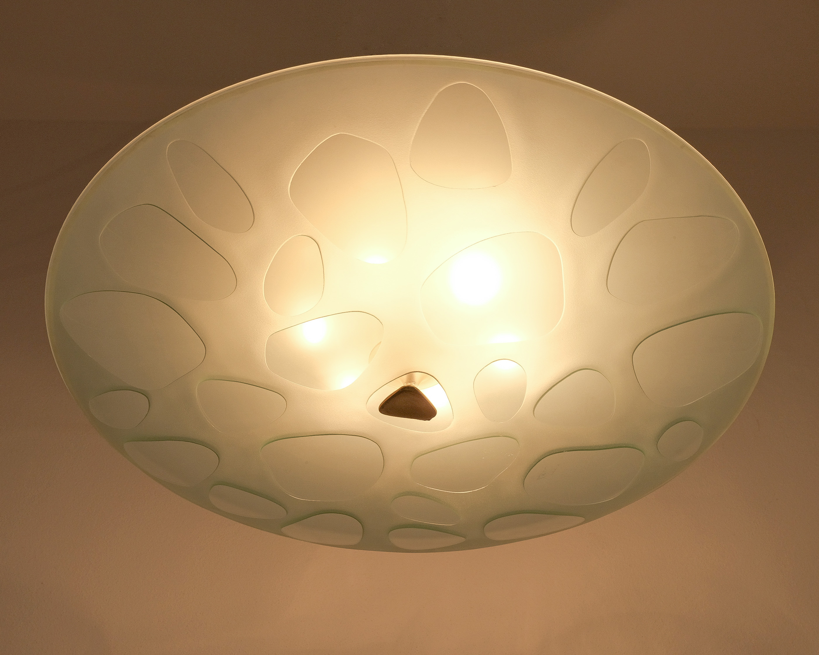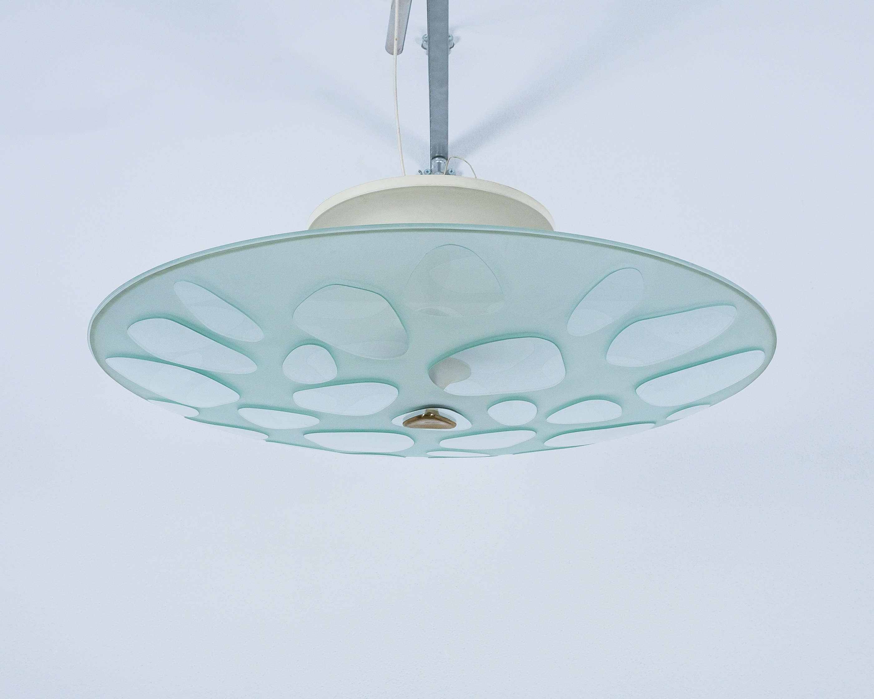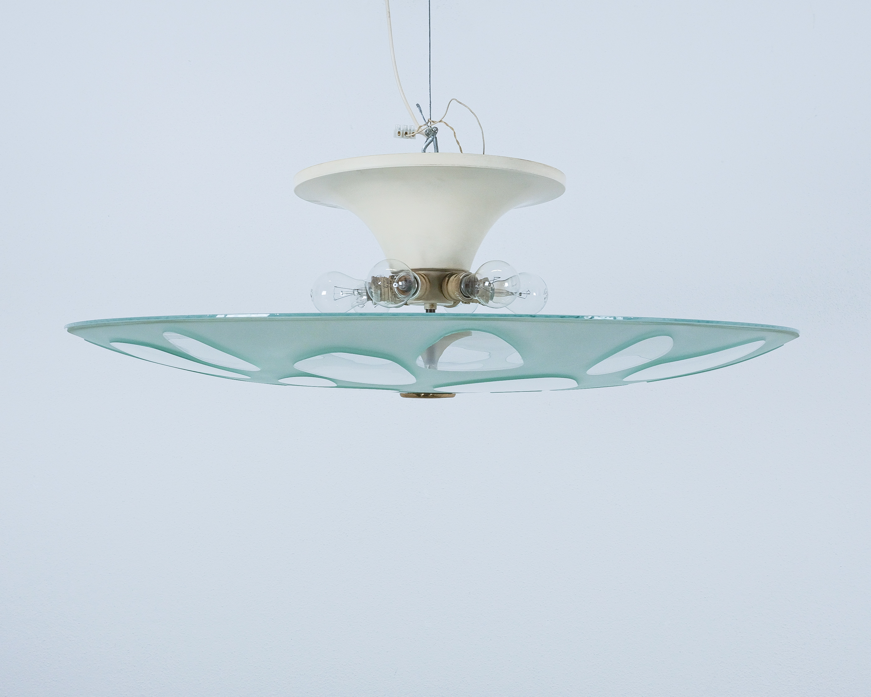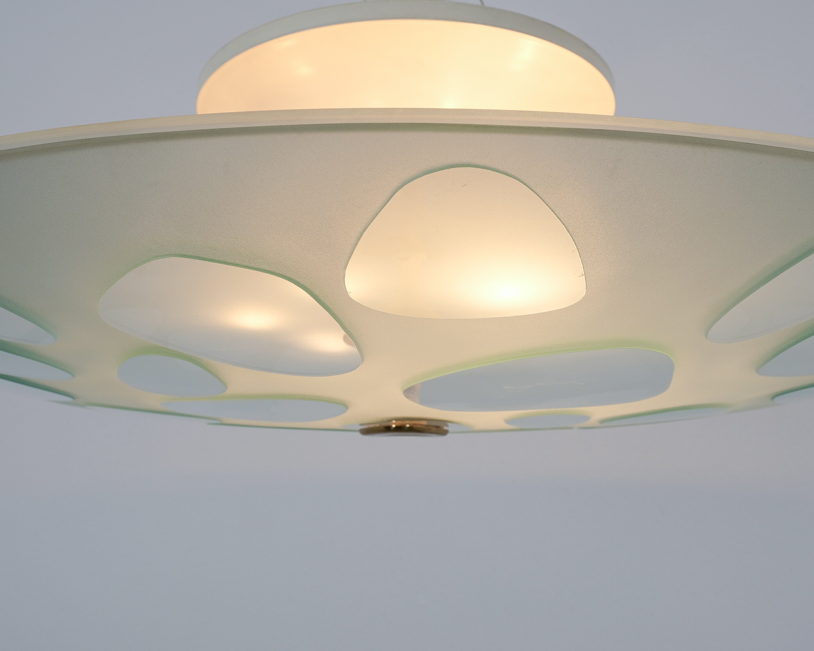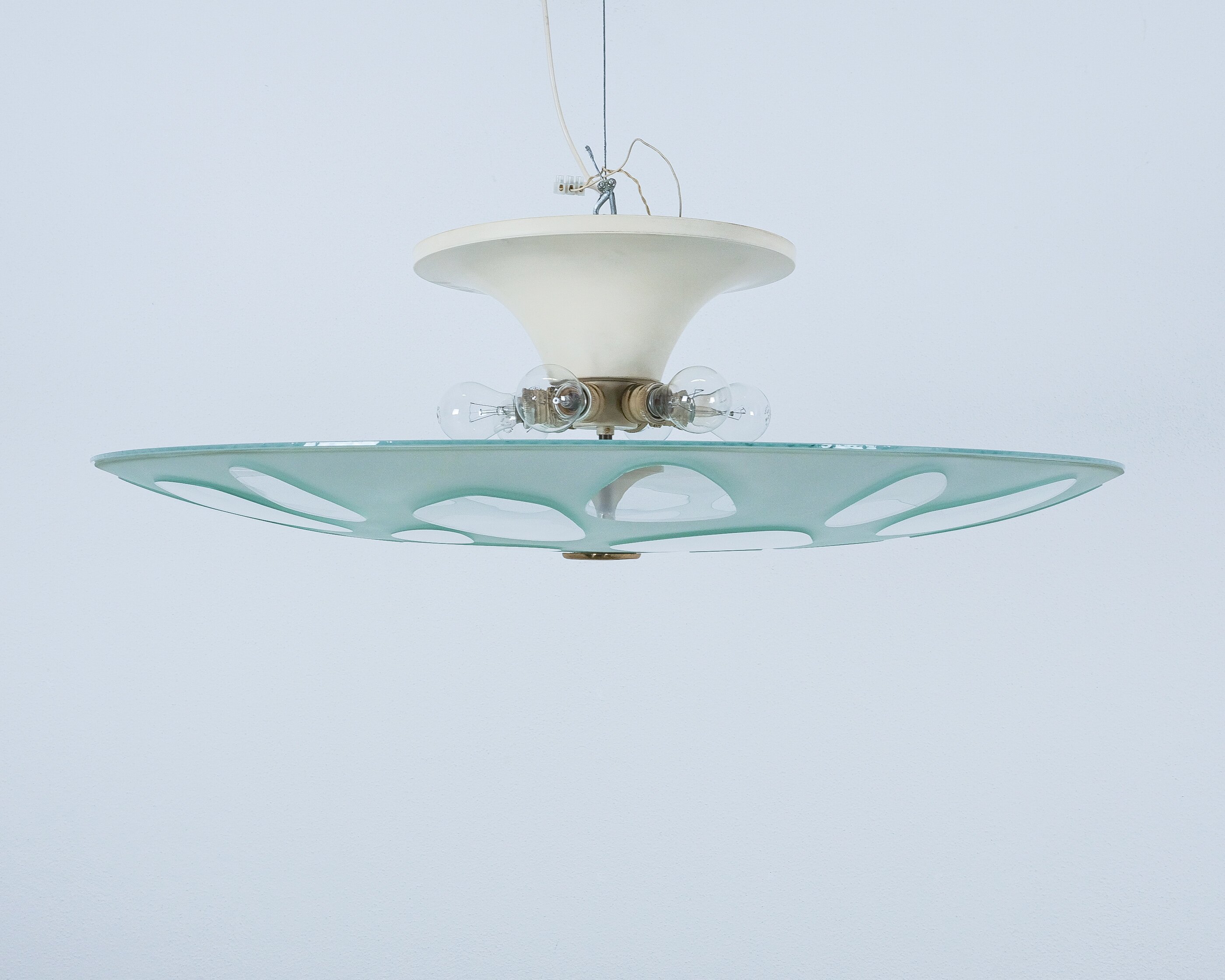 Early vintage original flush mount light by Max Ingrand. Iconic large fixture with deep sandblasted incisions leaving smaller archipelagos from clear glass, that have later been polished. It's a very delicate piece with outstanding glass work. The metal funnel has its preserved original lacquer from the 1950's. Six large e26/27 bulbs are illuminating a sandblasted large 36" glass disc-diffuser first, so the bulbs are not visible from underneath the light. It's in very good condition considering an age of 65 years. The glass shows no chips or cracks. The original lacquered aluminum parts we left untouched. It shows smaller sections of color-loss. The brass shows an even and golden patina.