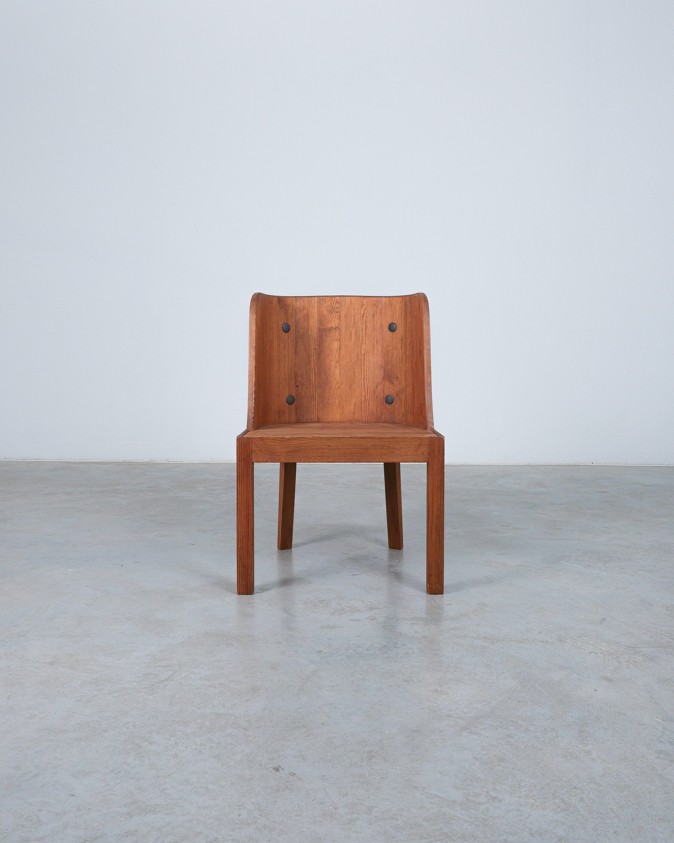 Two pairs of “Lovö” easy chairs by Axel Einar Hjorth, executed in solid pine and defined by a robust, deliberately rustic character. The expressive construction is complemented by wrought-iron details integrated into the backrests.