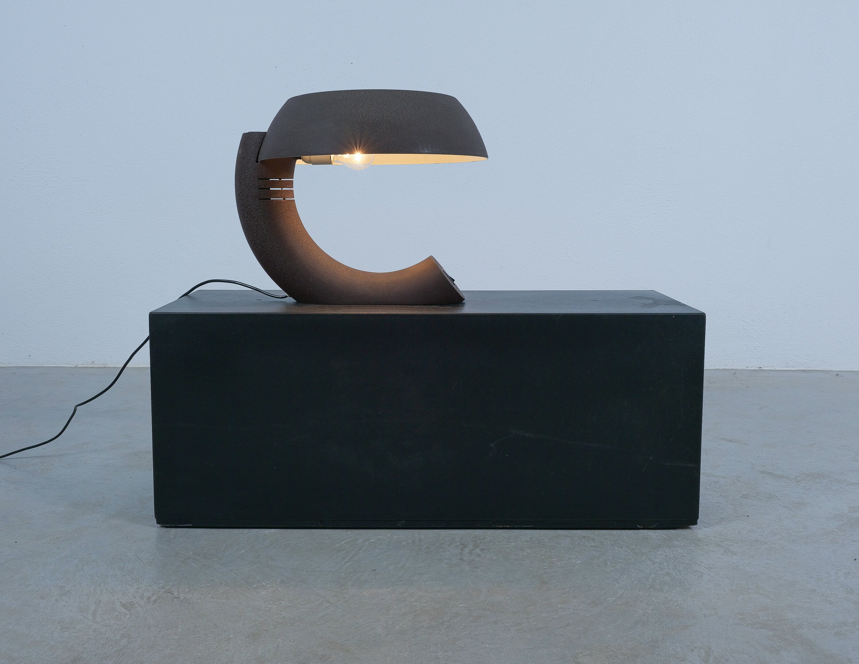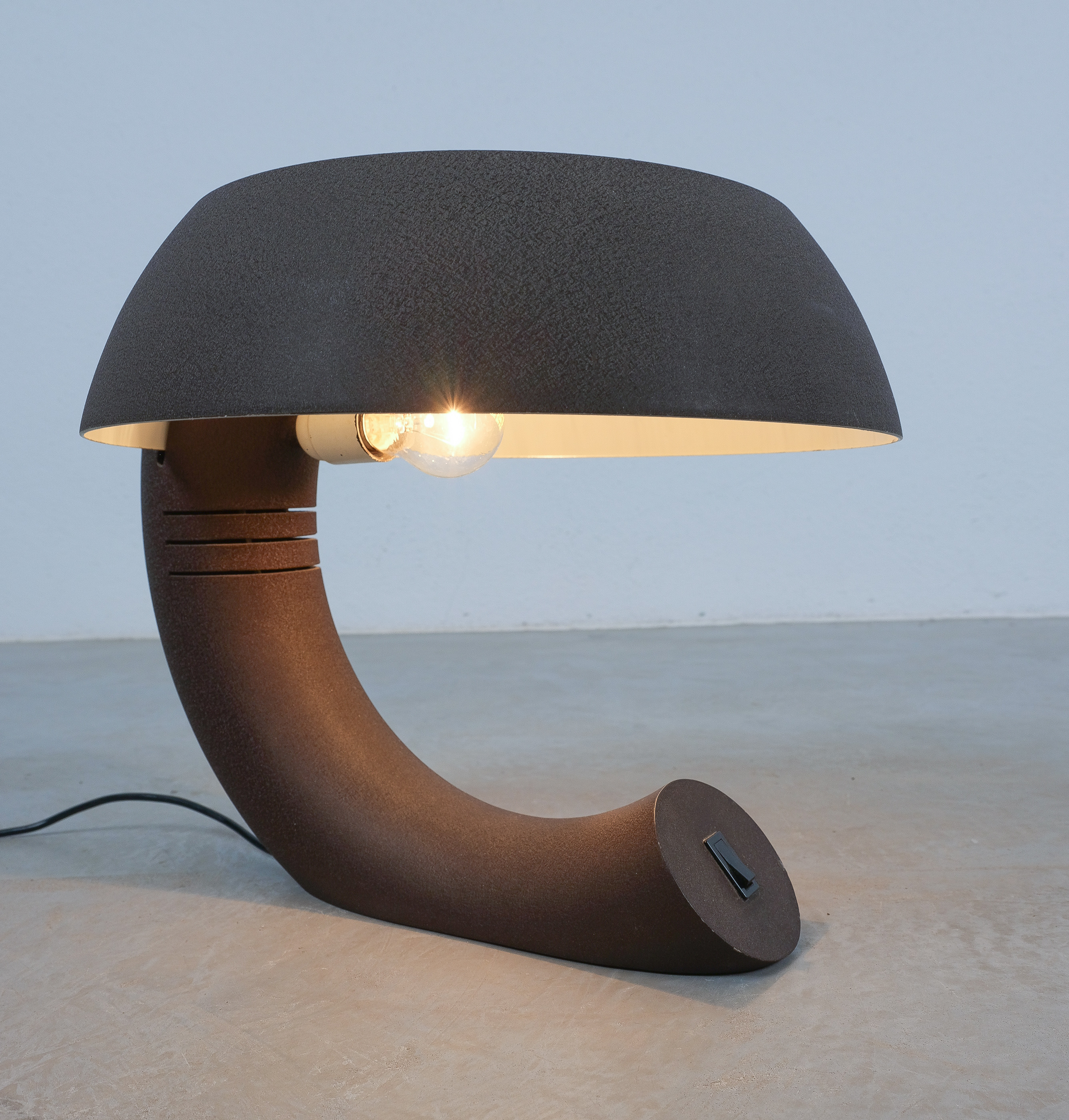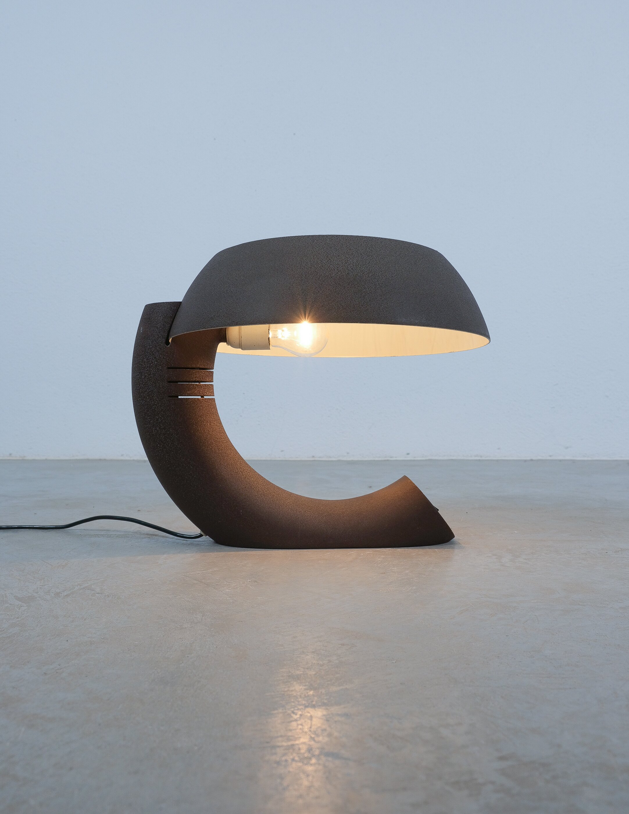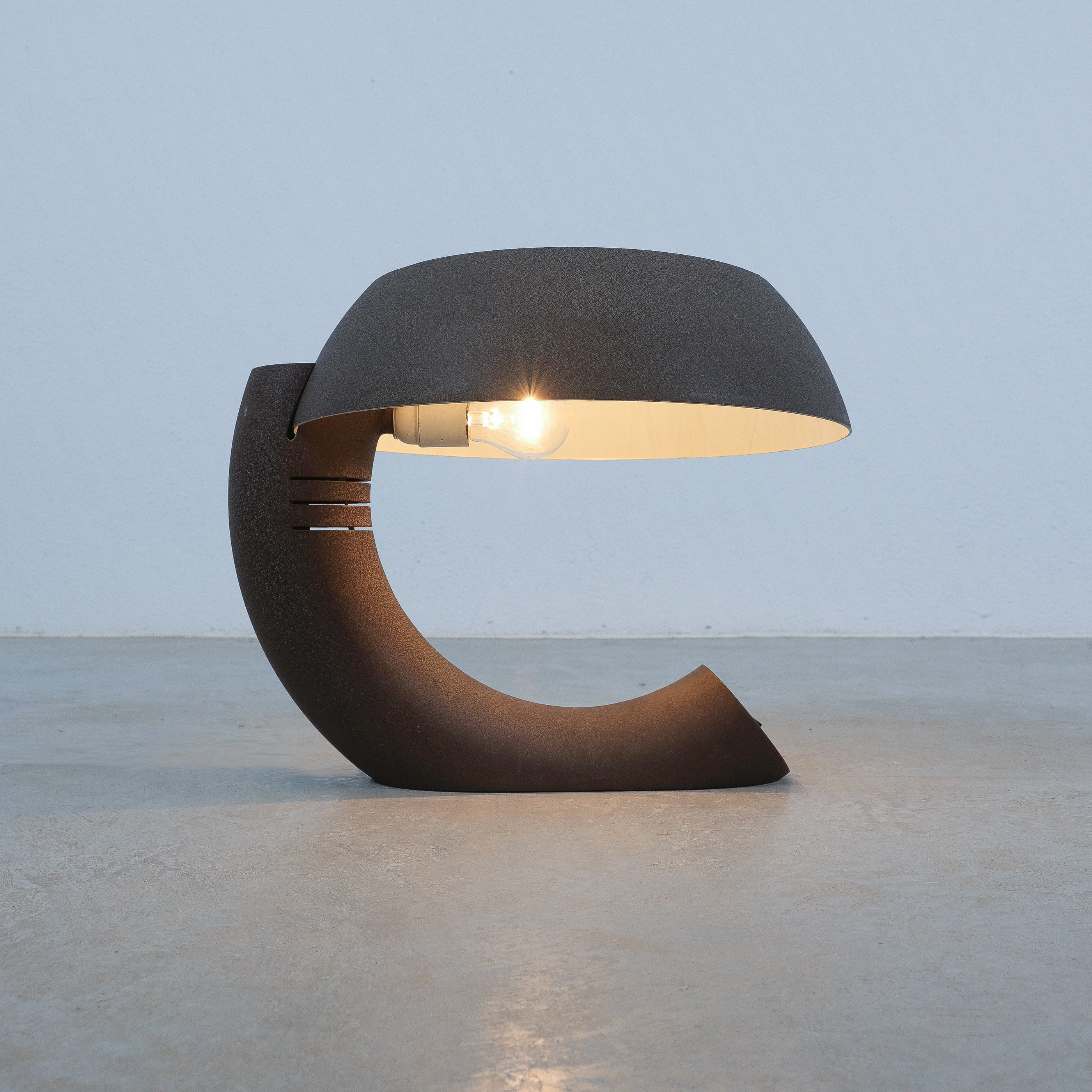 This rare graphic and sculptural table lamp was realized circa 1970. It's rationalistic approach showcases geometric quasi-functional geometrics bestowing its unique character. The metal base and the shade are made from dark-brown lacquered aluminum, that shows a shrinking texture effect which was popular in this time-period. The brutalistic appearance is much owed to this raw look. The piece is in good condition with no major flaws or damages. Some minimal lacquer loss. Typical wear to the socket and expressiv sculptural shape. The light takes one e27 bulb with 100W max. We recommend Led's due to lesser heat emission. Dimensions are 16.92" W x 14.56" H X 15.74" D