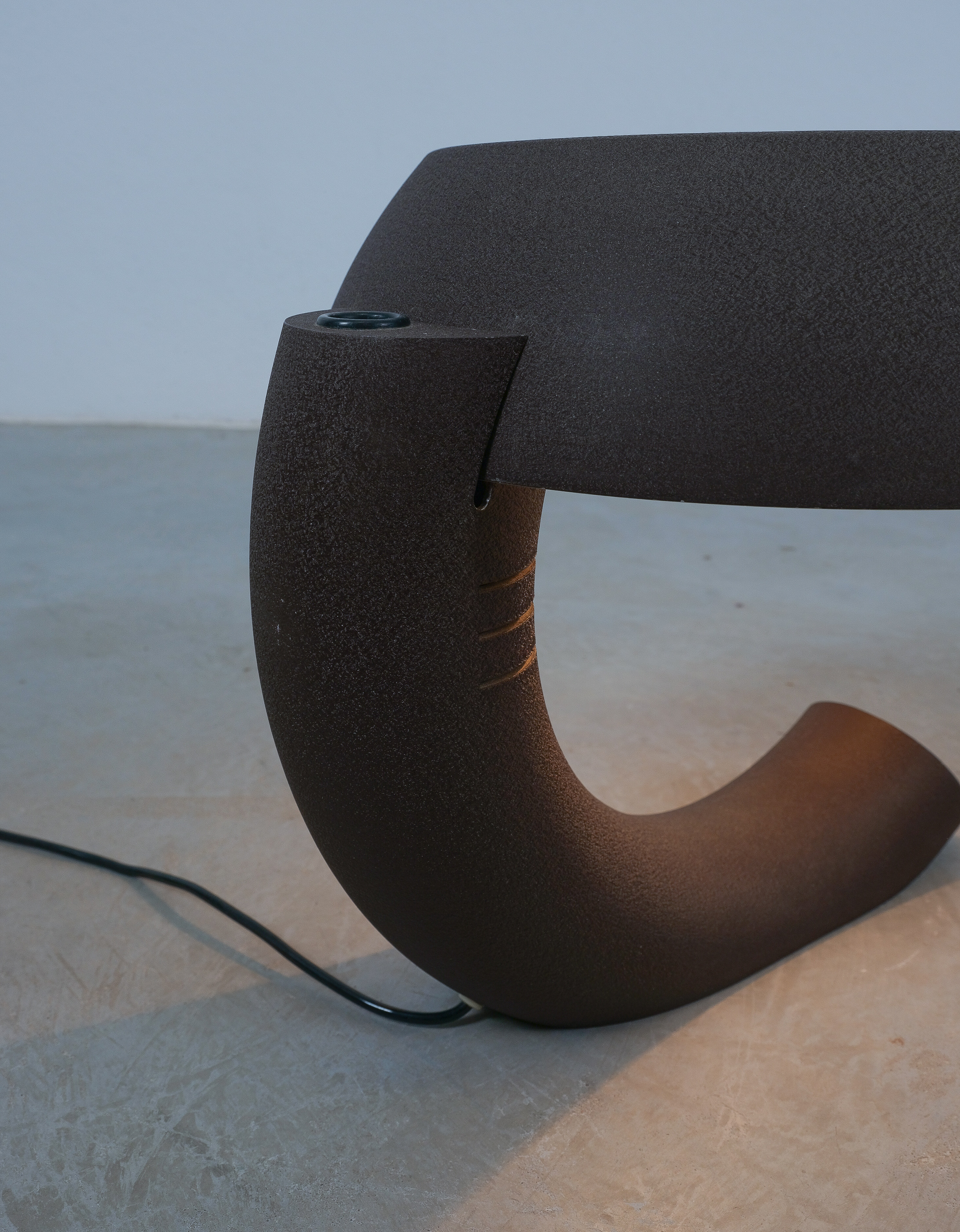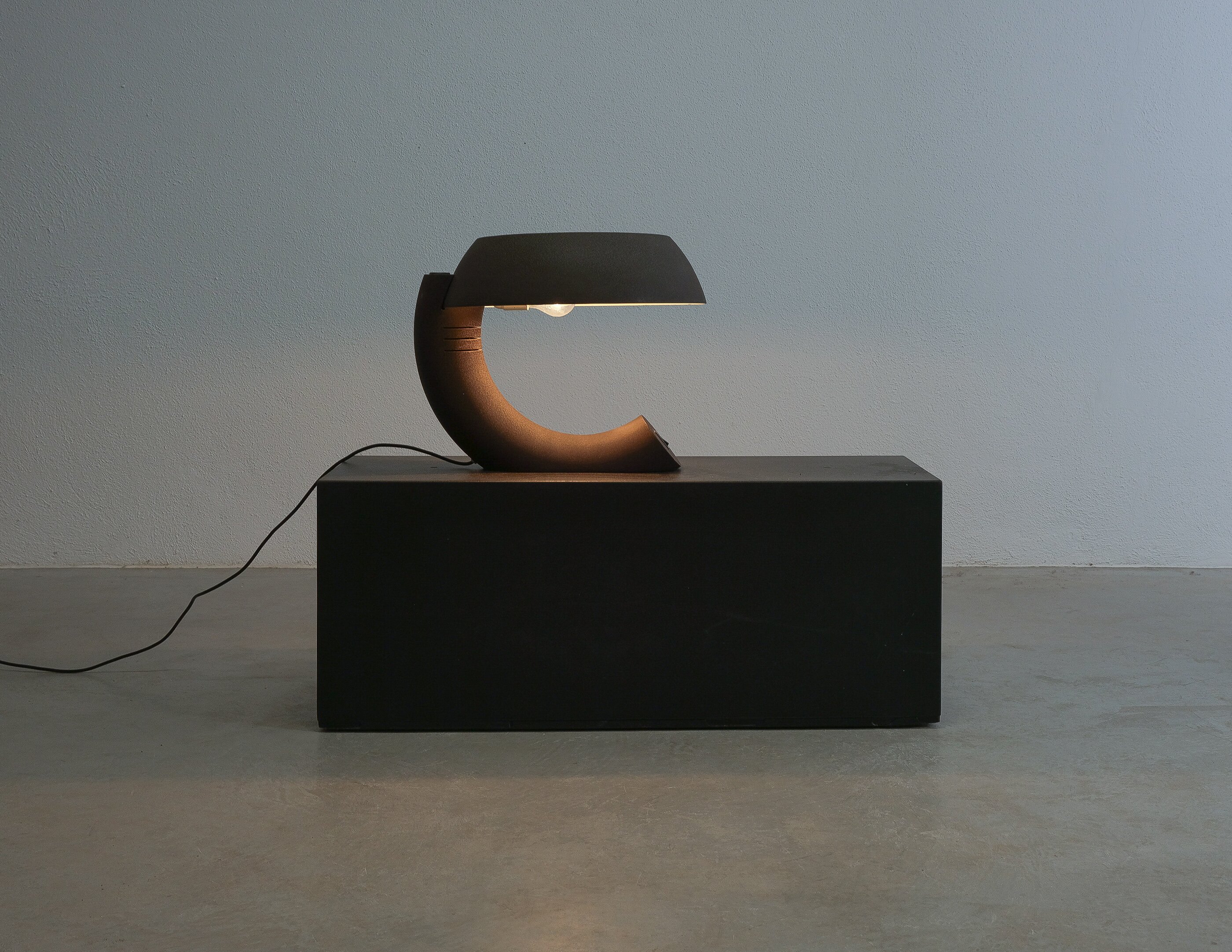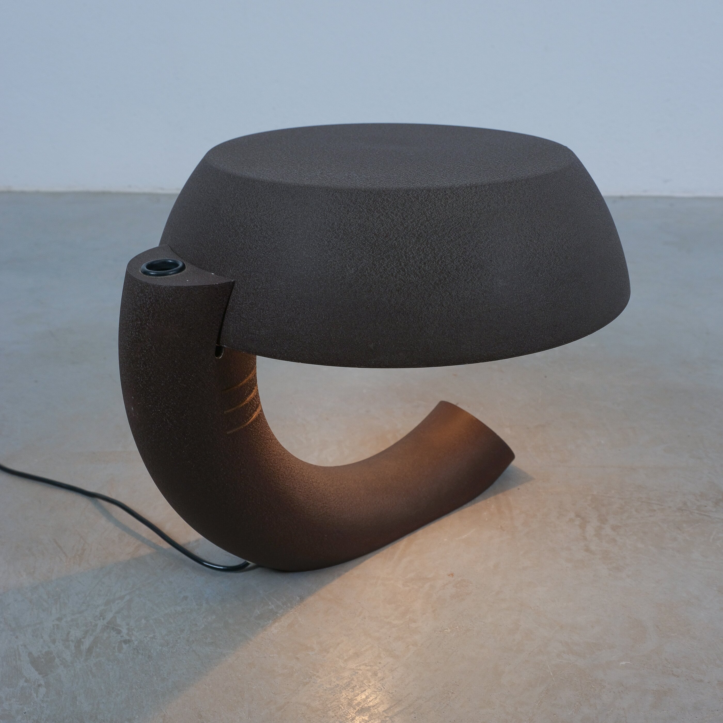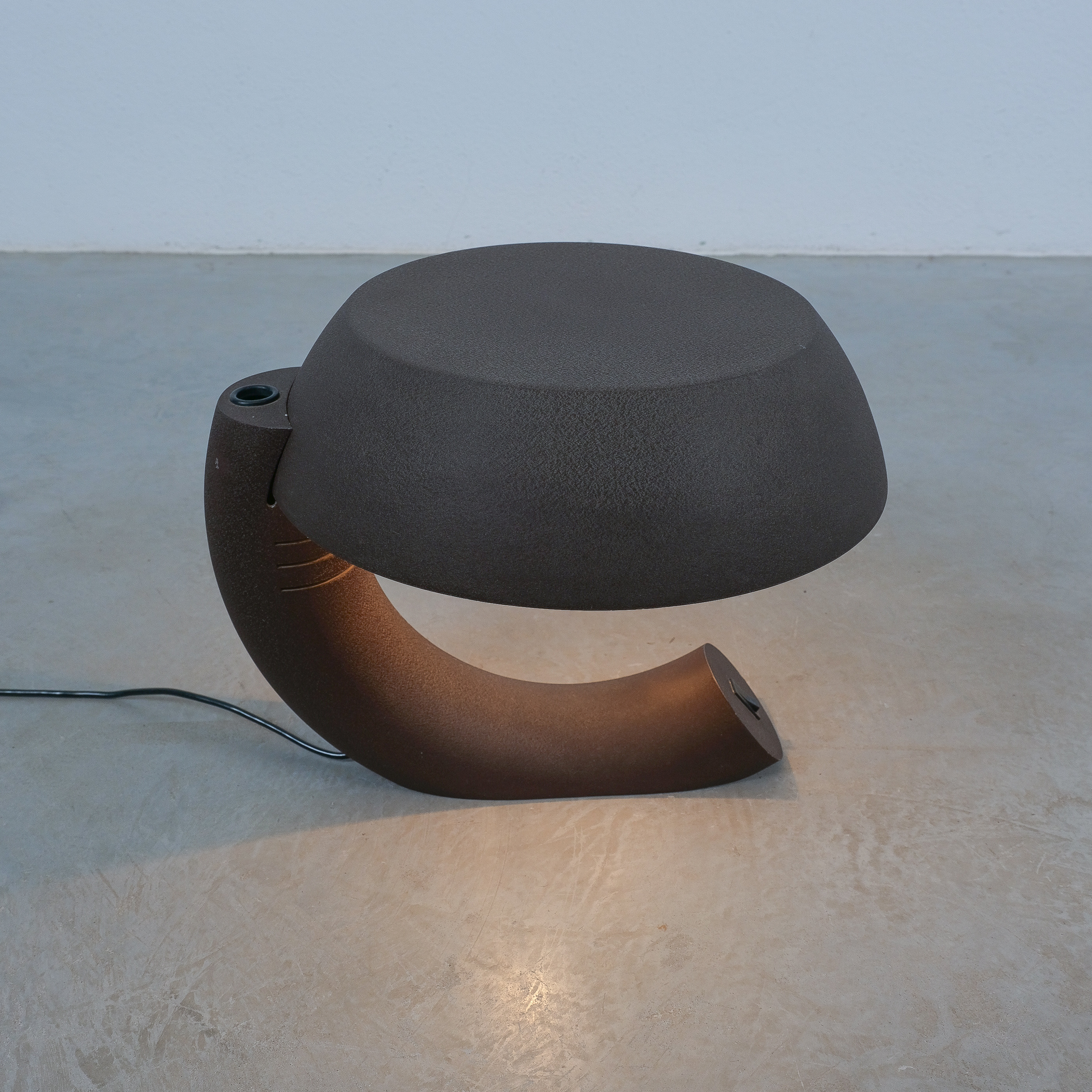 This rare graphic and sculptural table lamp was realized circa 1970. It's rationalistic approach showcases geometric quasi-functional geometrics bestowing its unique character. The metal base and the shade are made from dark-brown lacquered aluminum, that shows a shrinking texture effect which was popular in this time-period. The brutalistic appearance is much owed to this raw look. The piece is in good condition with no major flaws or damages. Some minimal lacquer loss. Typical wear to the socket and expressiv sculptural shape. The light takes one e27 bulb with 100W max. We recommend Led's due to lesser heat emission. Dimensions are 16.92" W x 14.56" H X 15.74" D