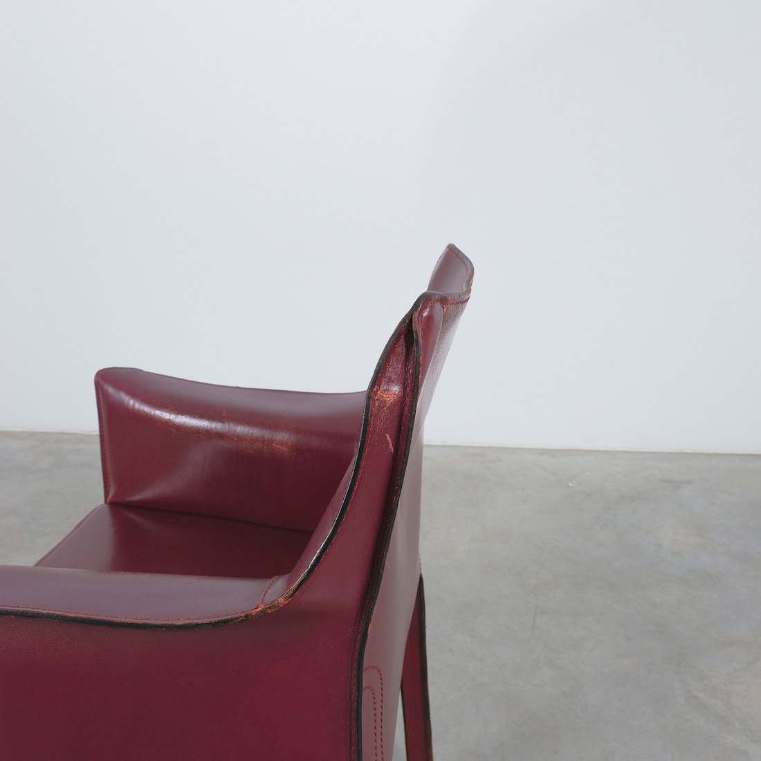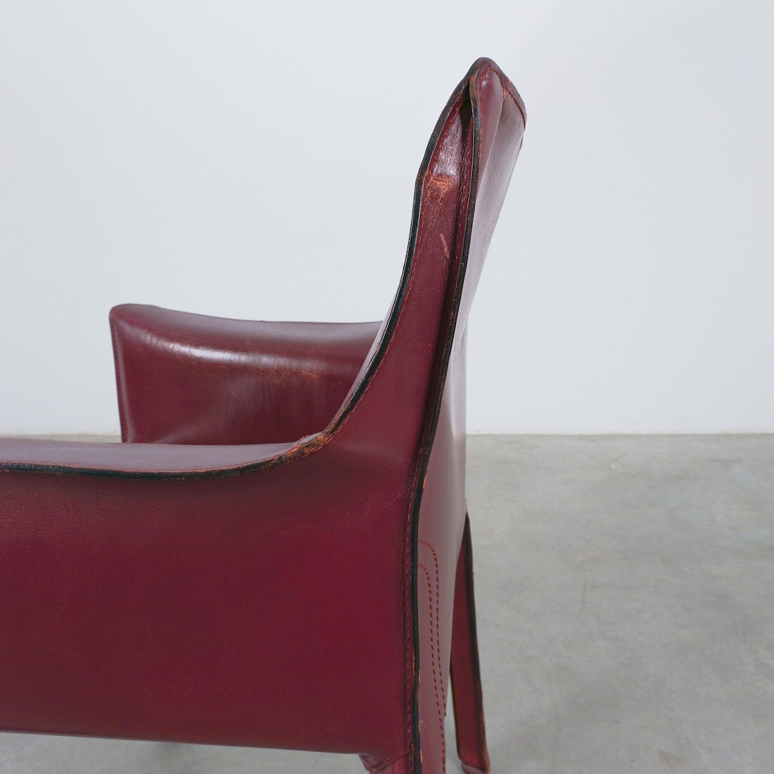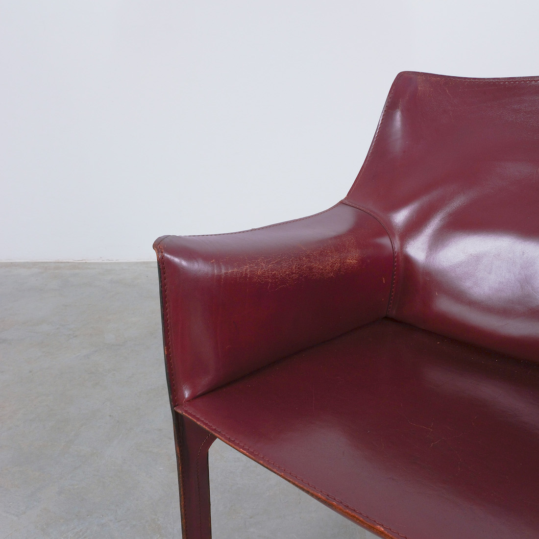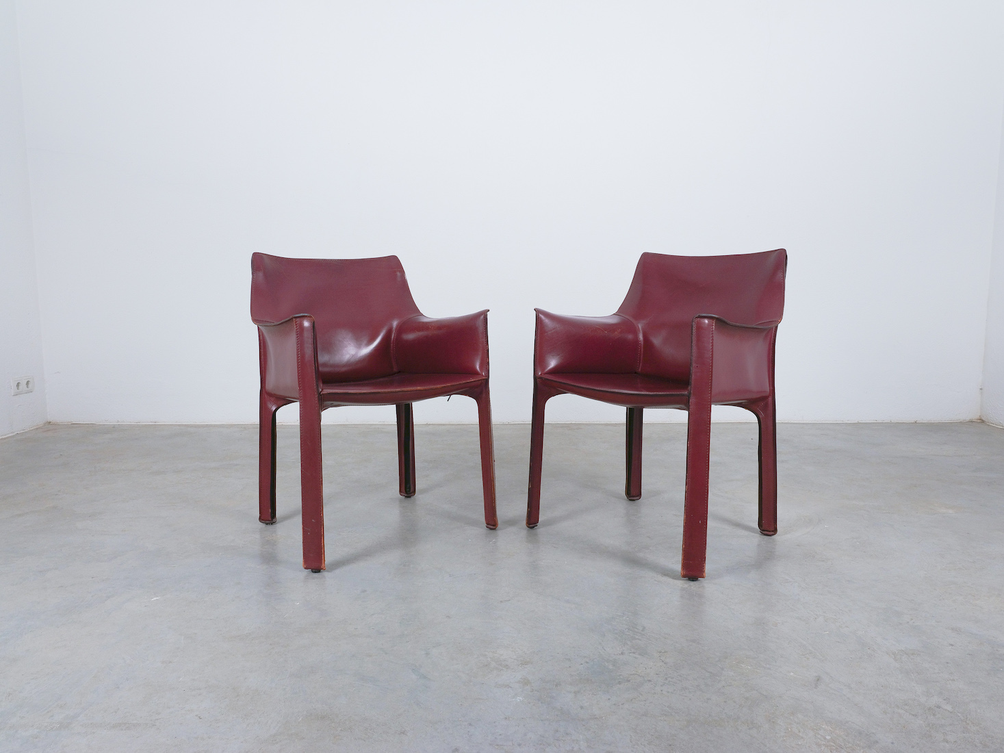 Two chairs available and sold as a pair. A nice pair of Italian design icons in red burgundy saddle leather. When first produced in 1977, the CAB was the first chair to feature a free-standing leather structure, inspired by how human skin fits over our skeleton. The leather upholstery is constructed from sixteen pieces of saddle leather, which are individually die-cut and sewn together. The leather is then zippered over the tubular steel frame and the polyurethane foam padded seat. Both chairs show wear, one a bit more than the other. Overall in good condition, ready to use. Each chair is labelled at the bottom, Cassina.