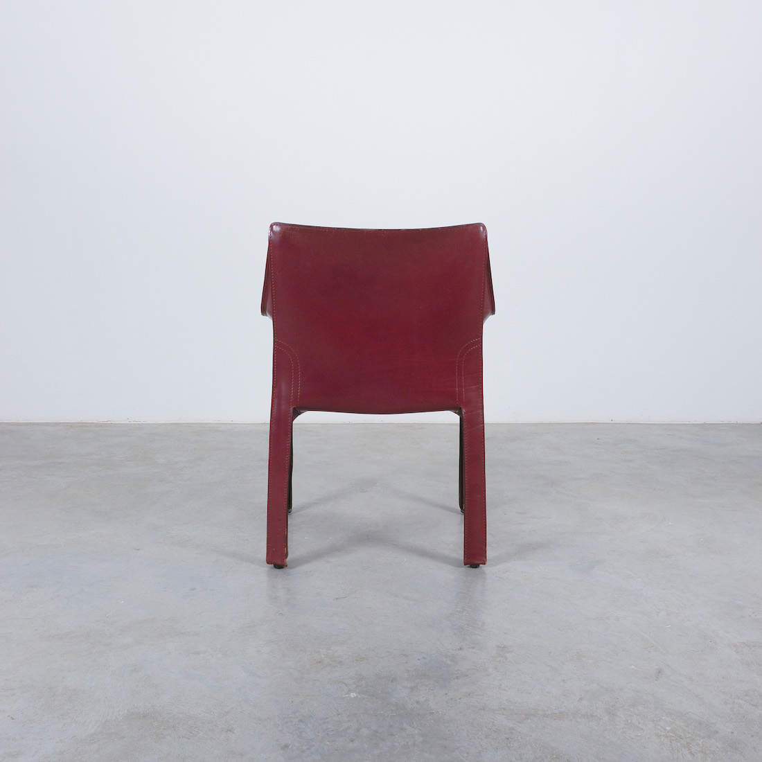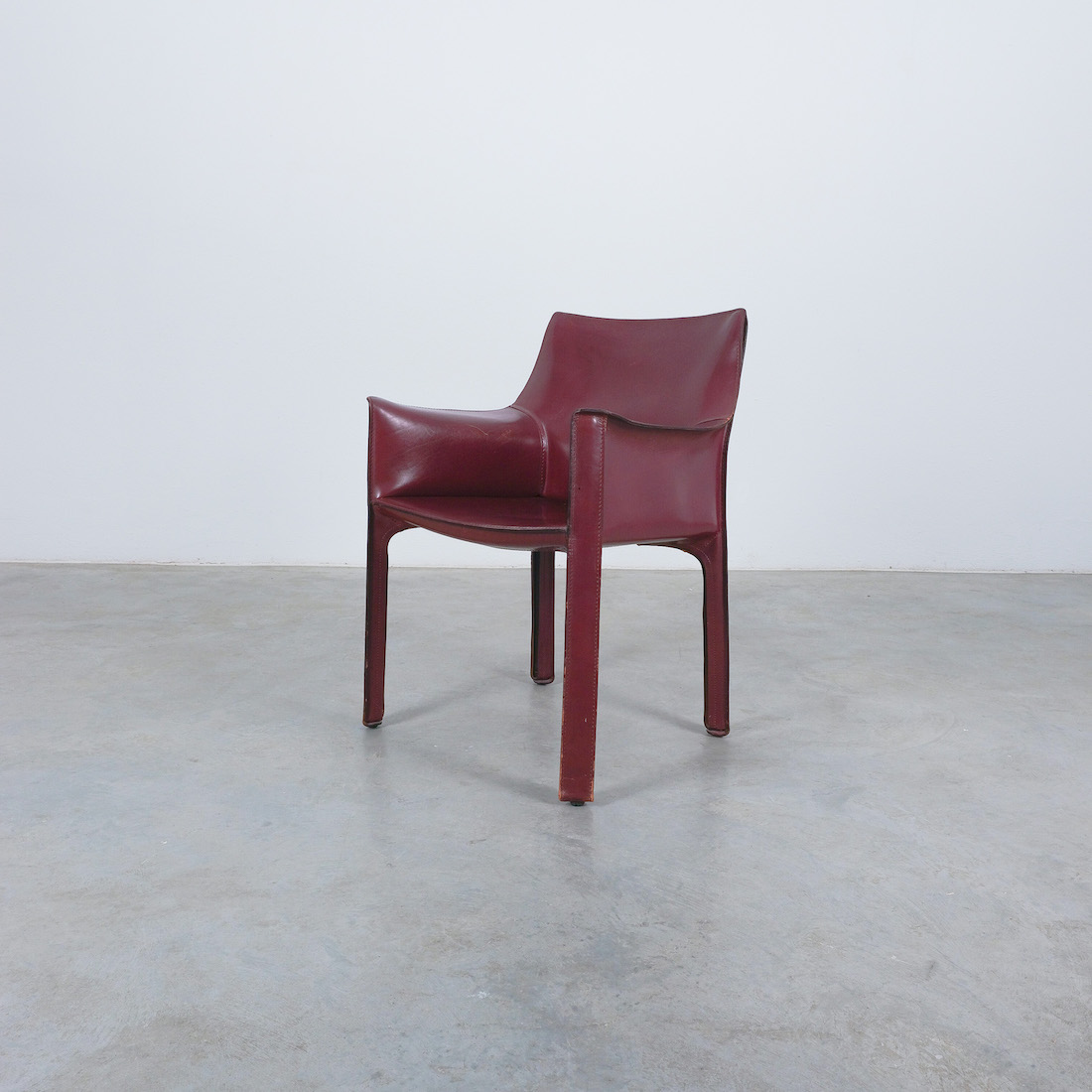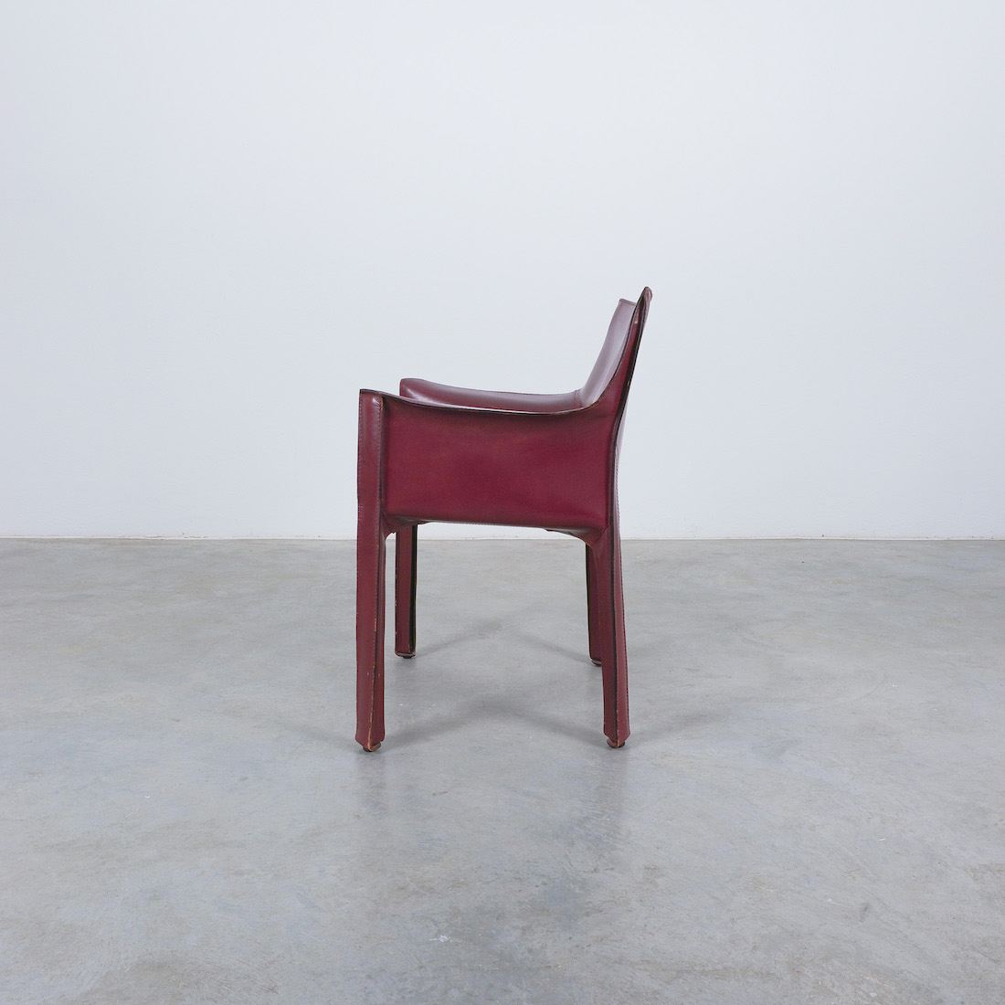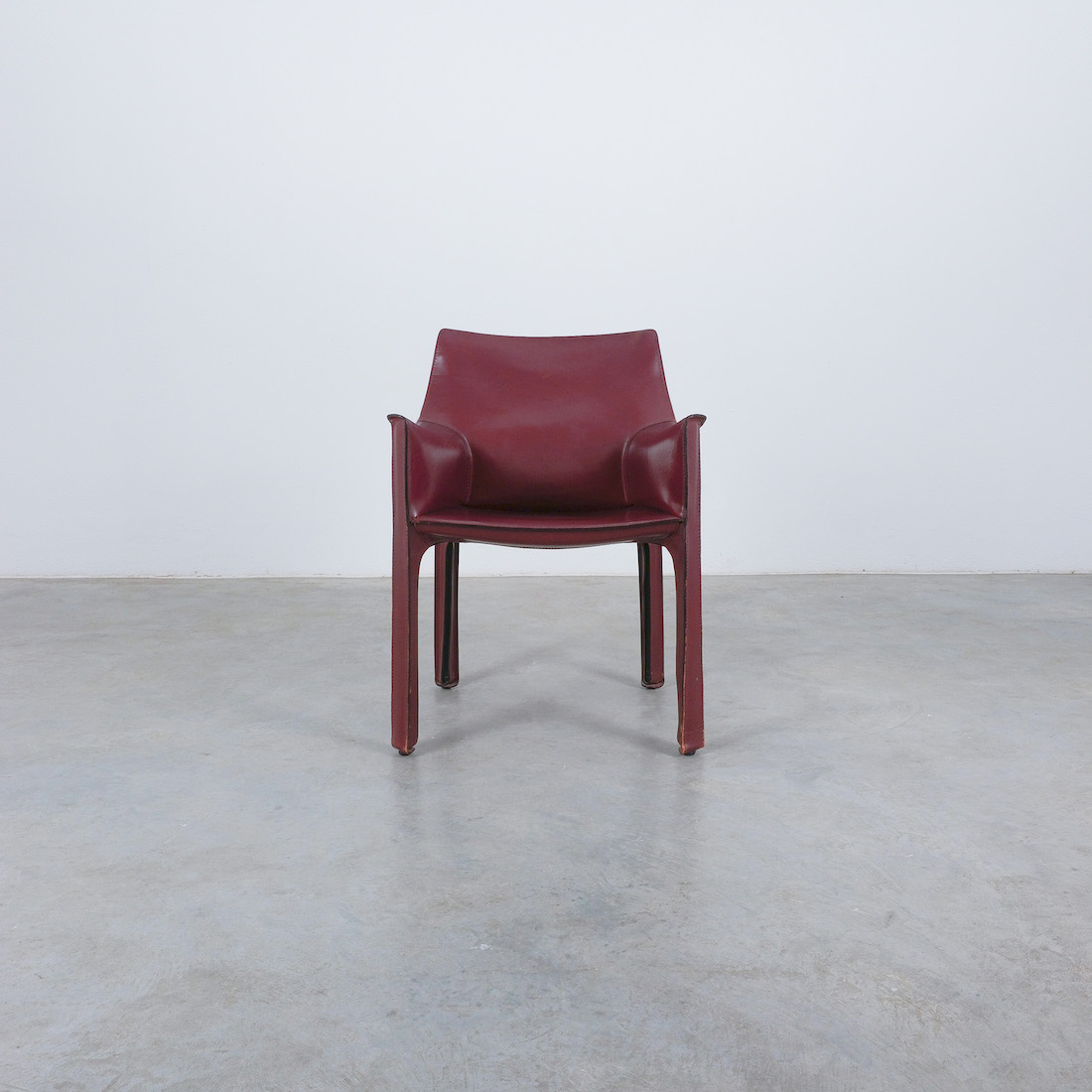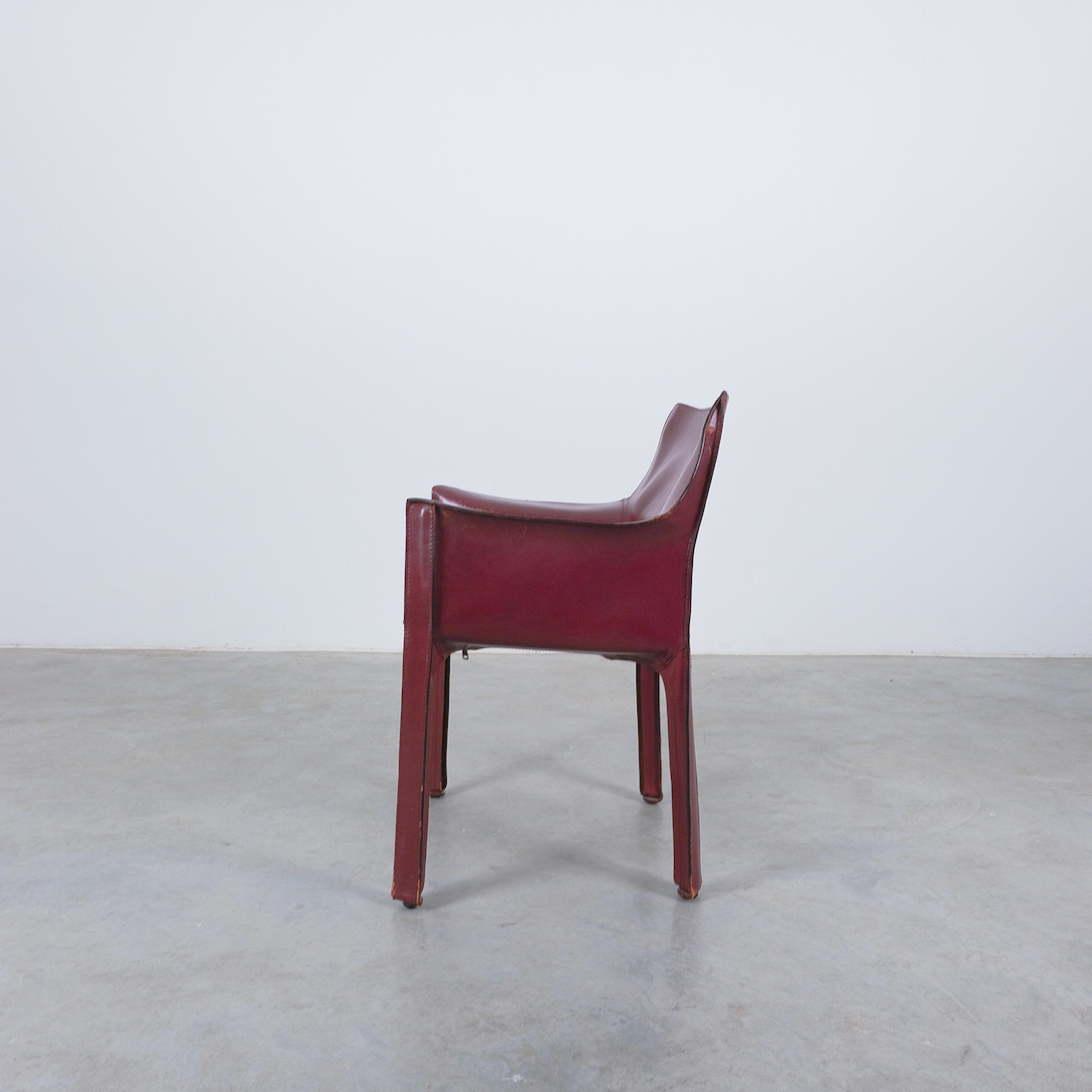 Two chairs available and sold as a pair. A nice pair of Italian design icons in red burgundy saddle leather. When first produced in 1977, the CAB was the first chair to feature a free-standing leather structure, inspired by how human skin fits over our skeleton. The leather upholstery is constructed from sixteen pieces of saddle leather, which are individually die-cut and sewn together. The leather is then zippered over the tubular steel frame and the polyurethane foam padded seat. Both chairs show wear, one a bit more than the other. Overall in good condition, ready to use. Each chair is labelled at the bottom, Cassina.