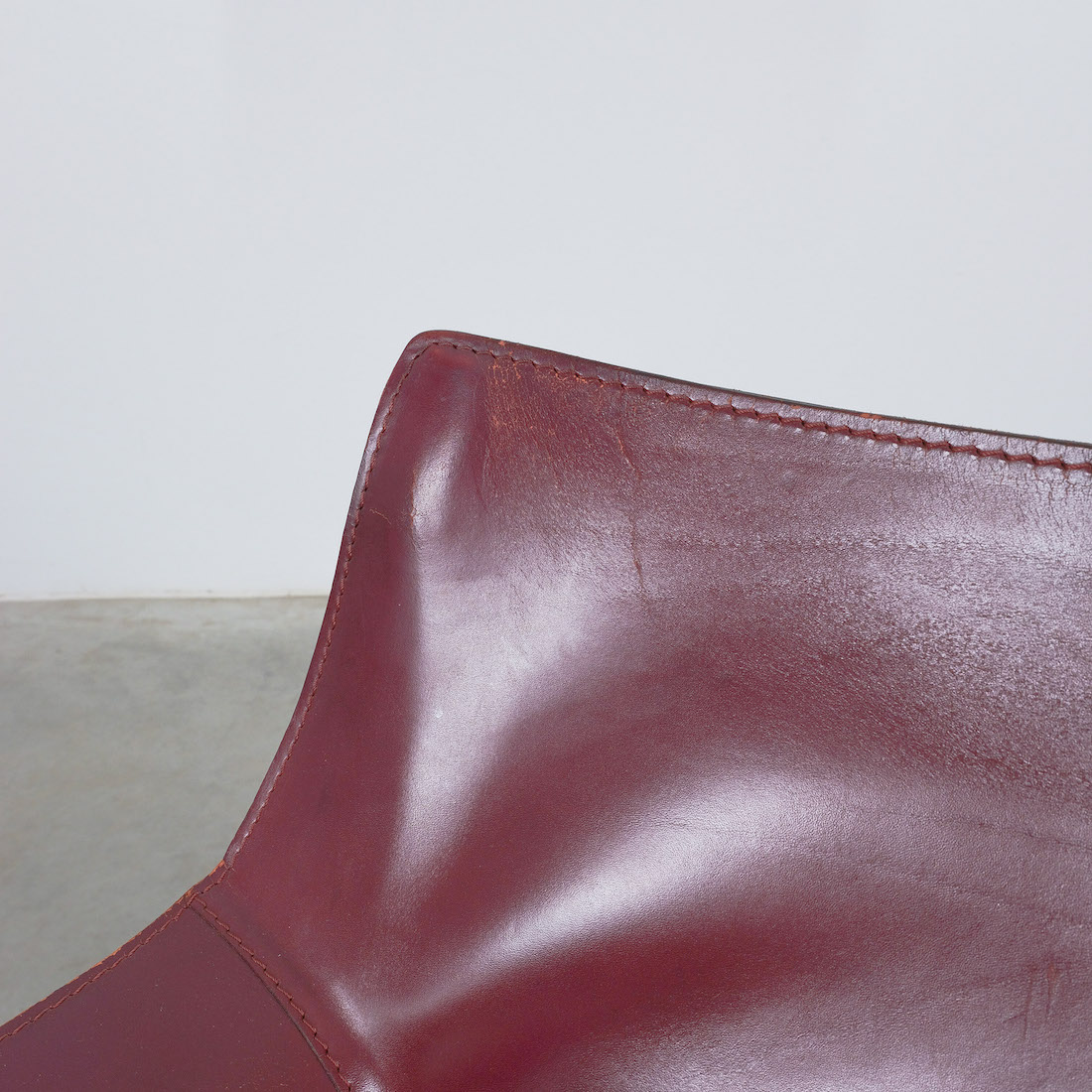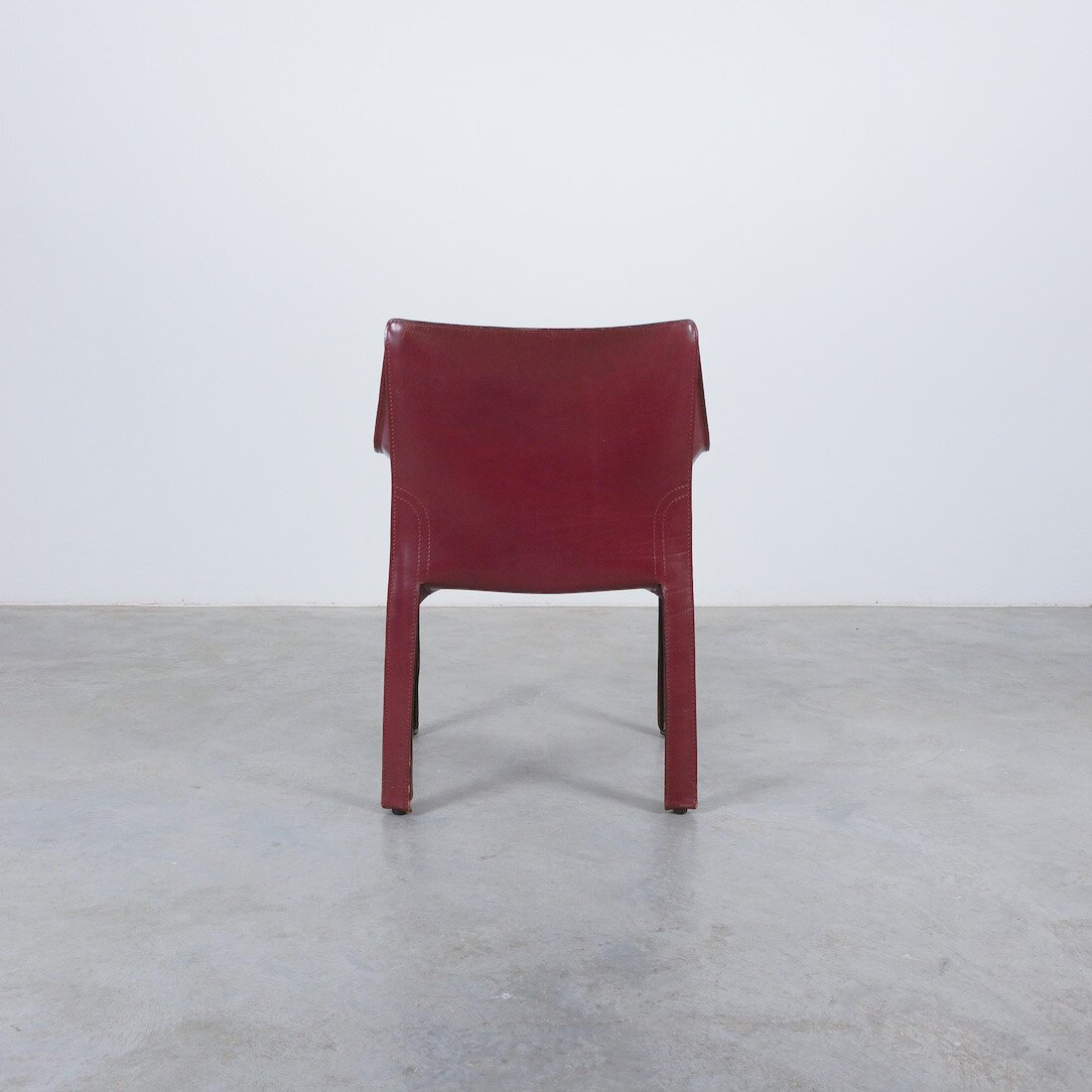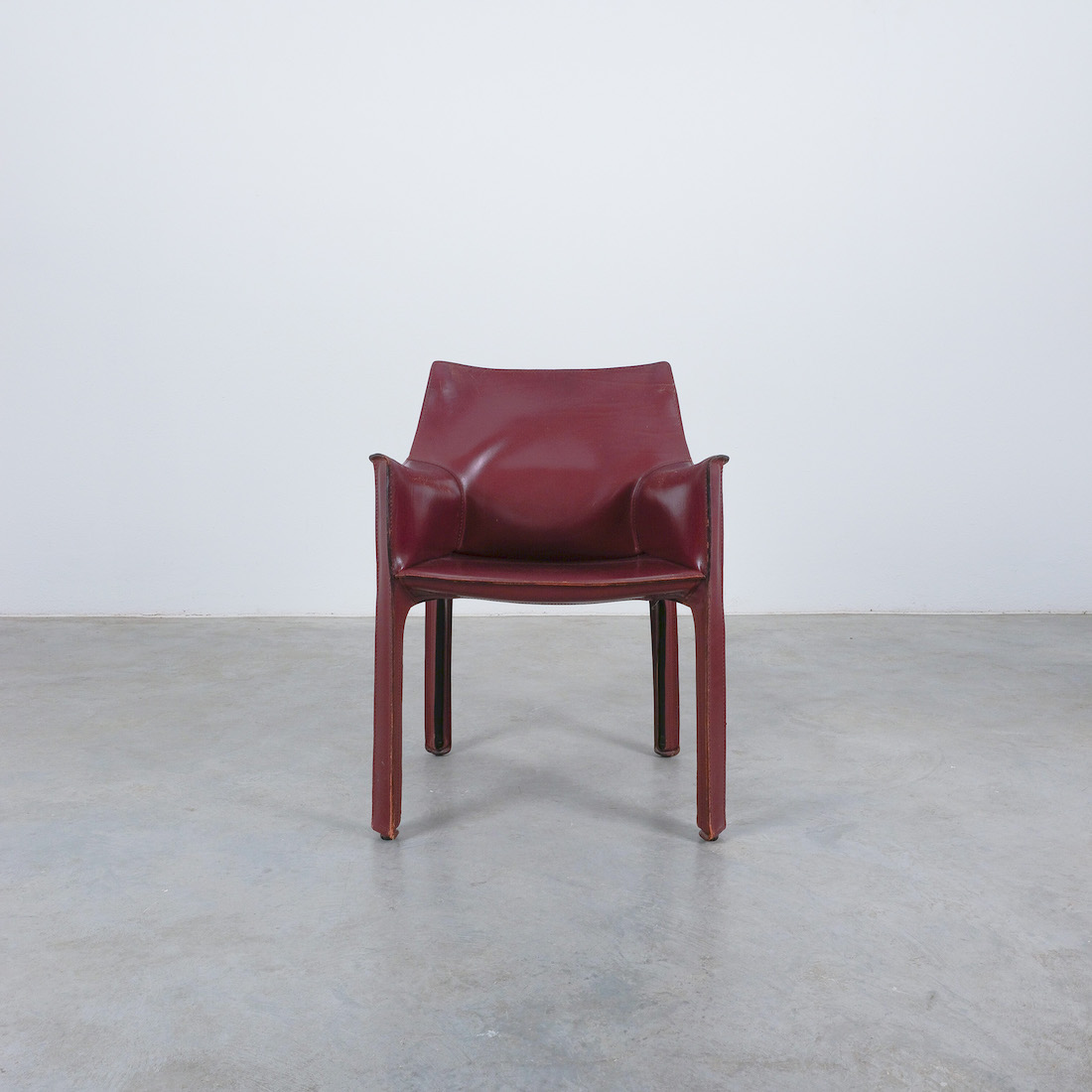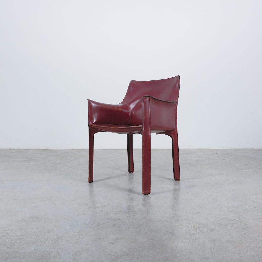Two chairs available and sold as a pair. A nice pair of Italian design icons in red burgundy saddle leather. When first produced in 1977, the CAB was the first chair to feature a free-standing leather structure, inspired by how human skin fits over our skeleton. The leather upholstery is constructed from sixteen pieces of saddle leather, which are individually die-cut and sewn together. The leather is then zippered over the tubular steel frame and the polyurethane foam padded seat. Both chairs show wear, one a bit more than the other. Overall in good condition, ready to use. Each chair is labelled at the bottom, Cassina.