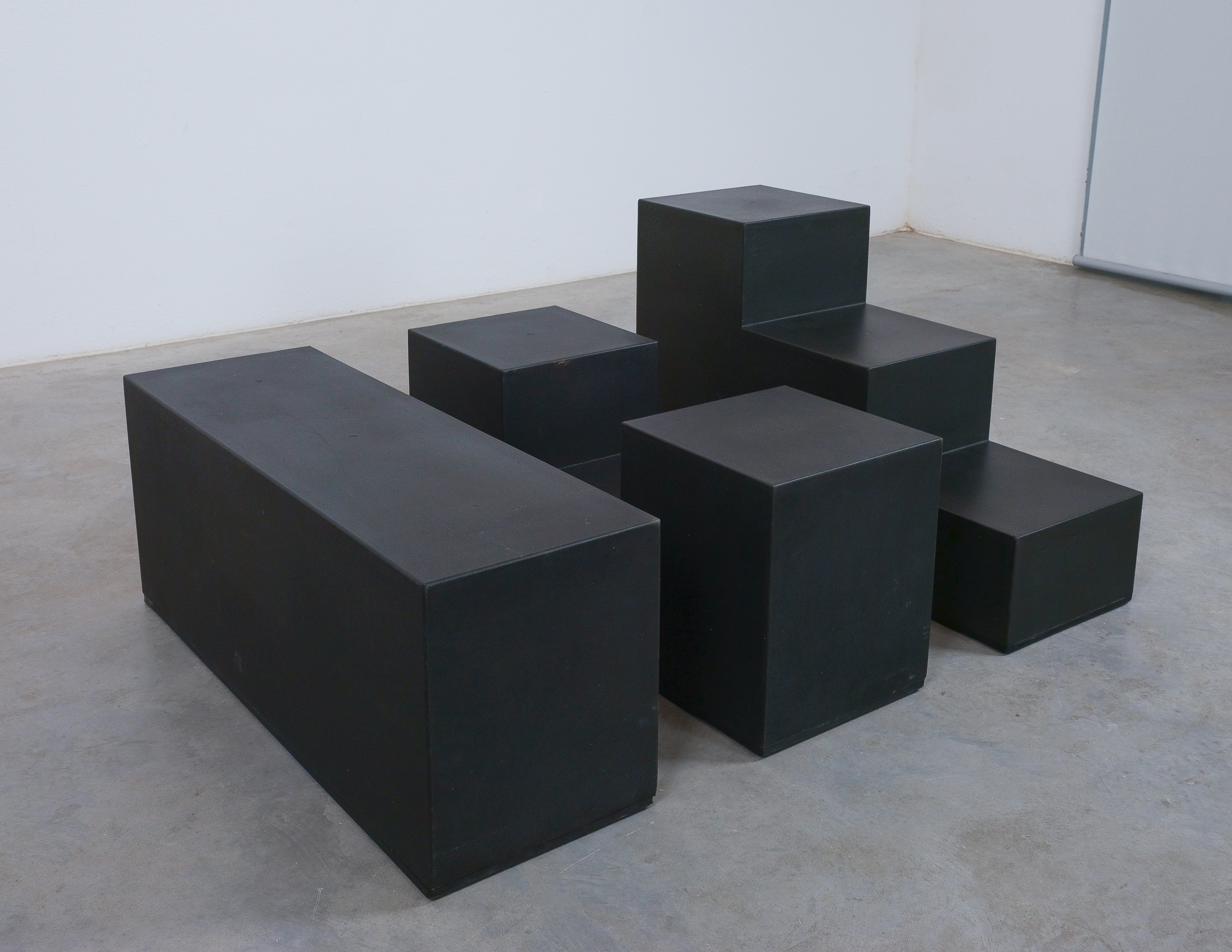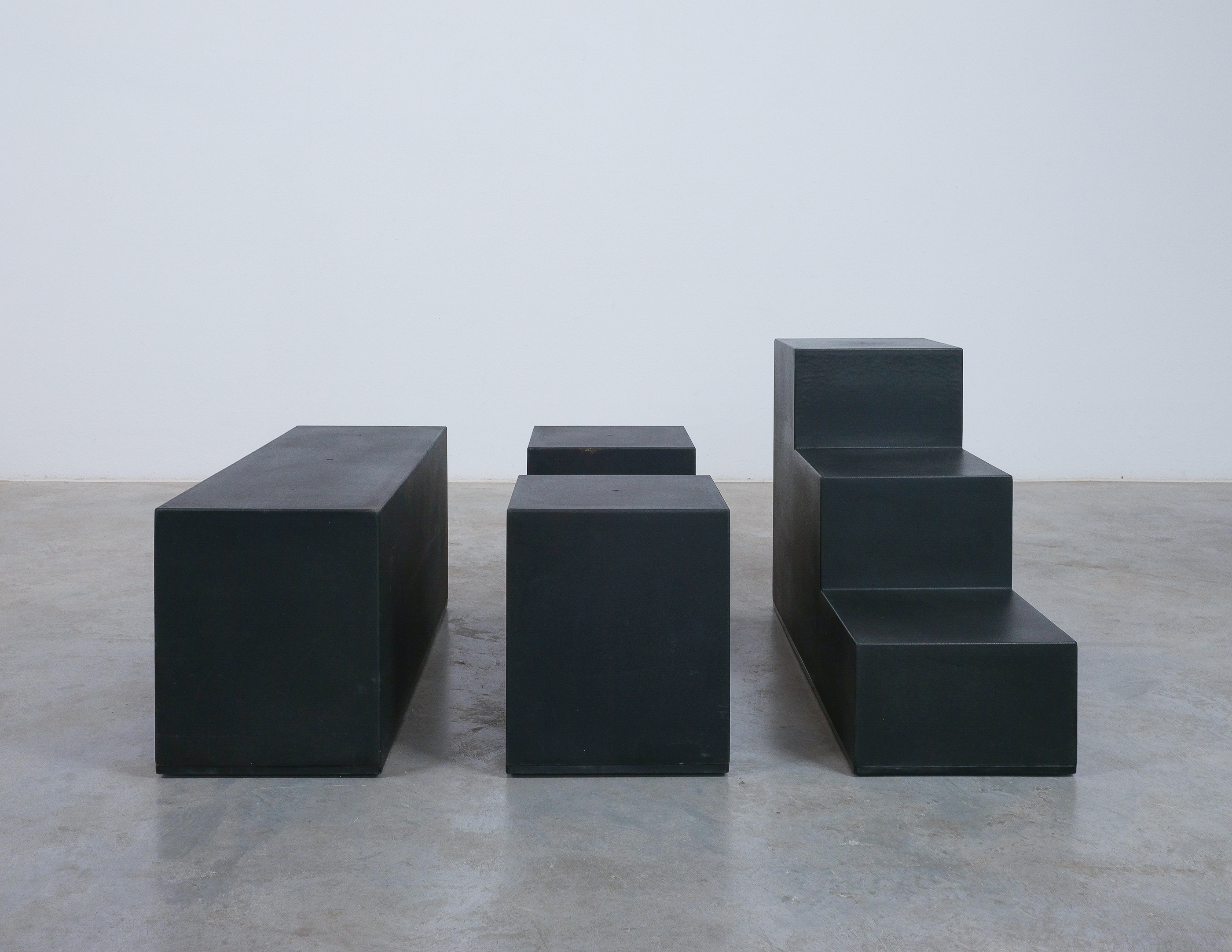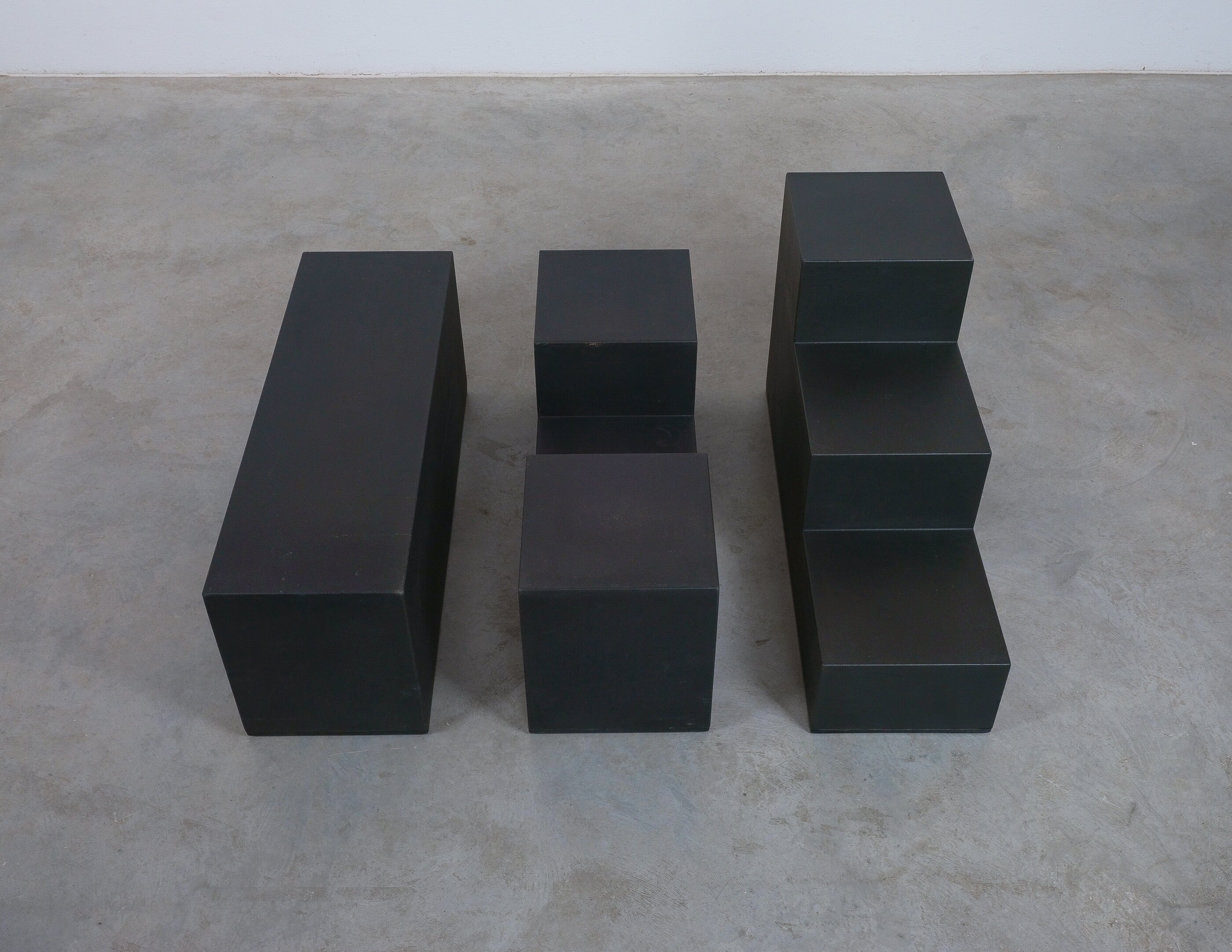 3 black polyurethane elements by Mario Bellini that can either be used as table or seats or presentoirs displays and combined with other elements of the same series. The condition is good with minor rub-offs. Wear to the plastic base and rim with minor losses. The material used is very durable and stable. All pieces are marked.