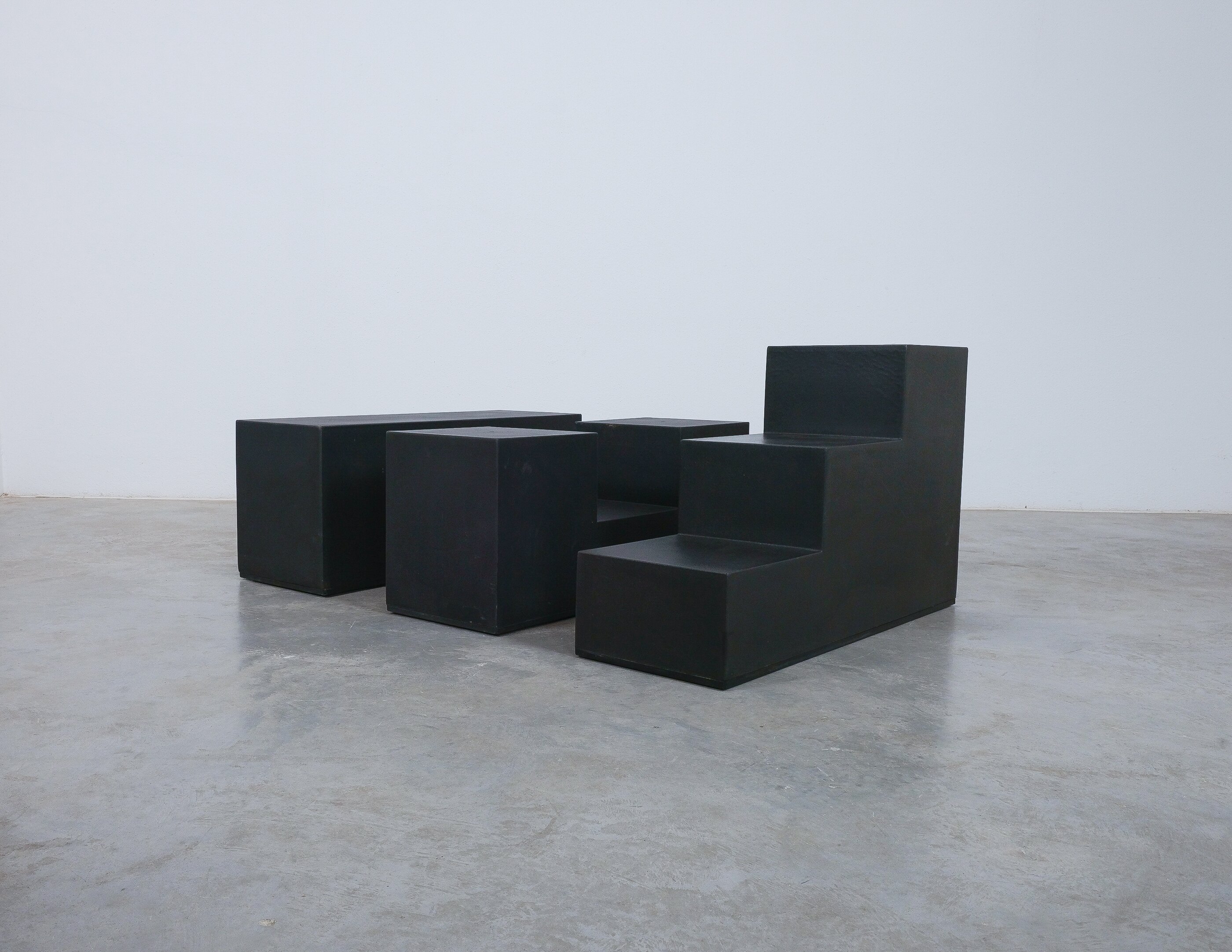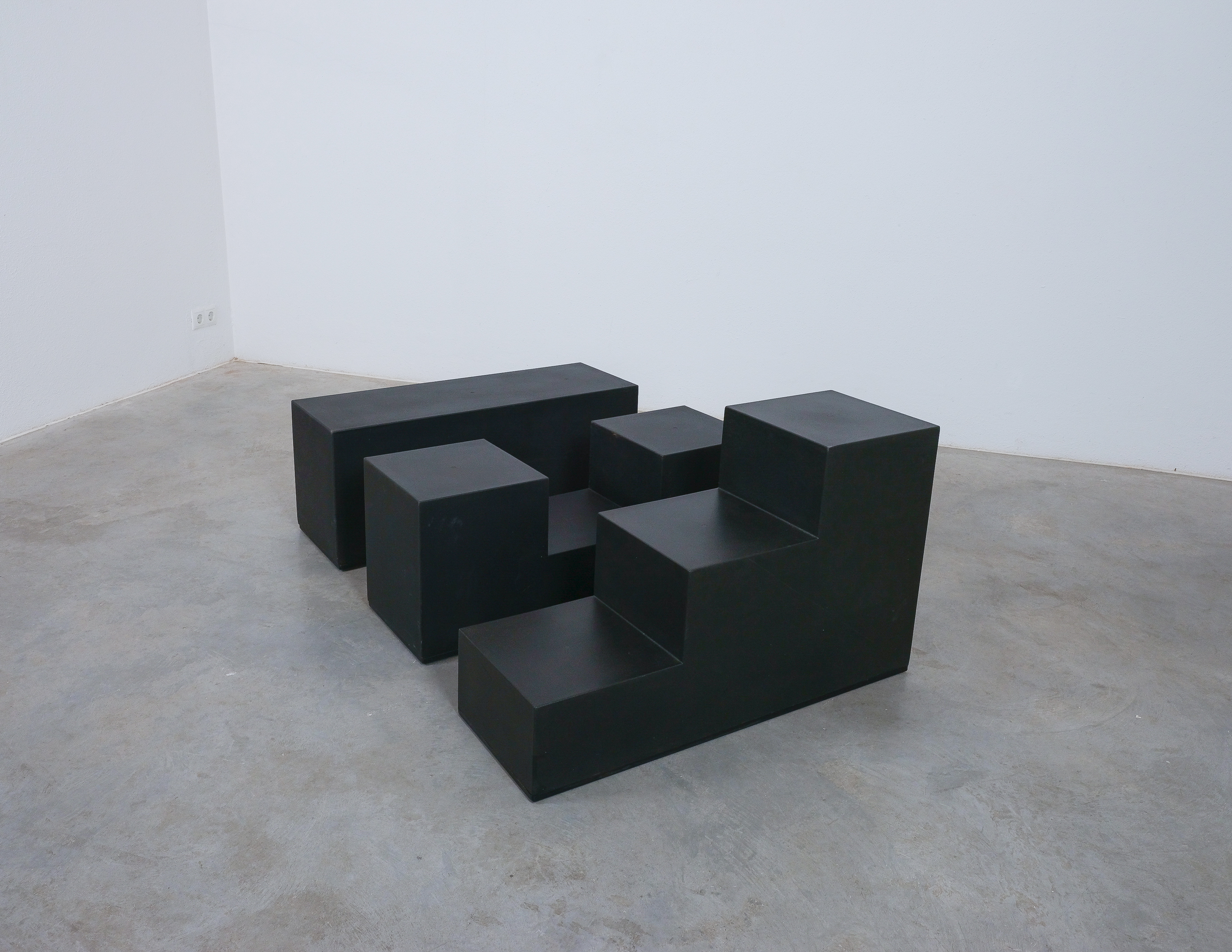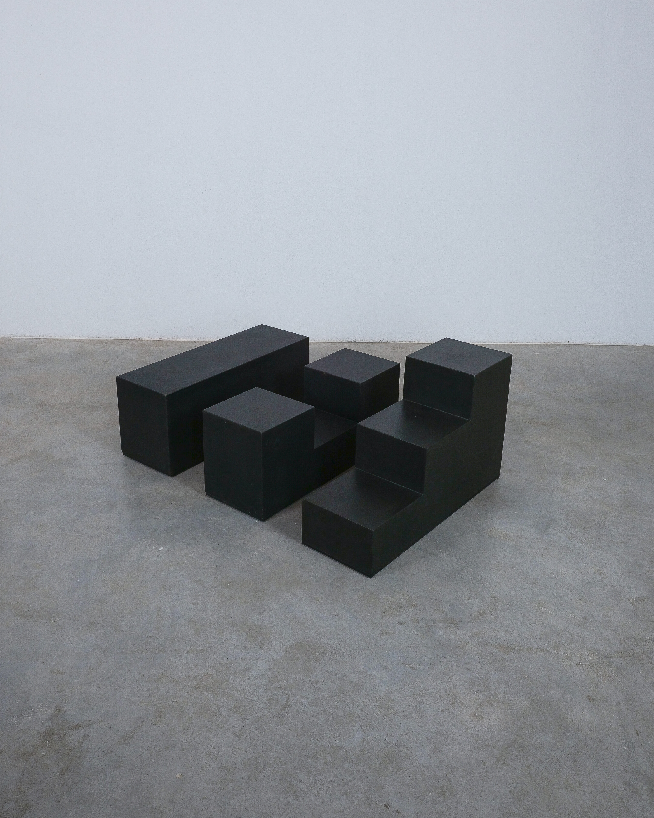 3 black polyurethane elements by Mario Bellini that can either be used as table or seats or presentoirs displays and combined with other elements of the same series. The condition is good with minor rub-offs. Wear to the plastic base and rim with minor losses. The material used is very durable and stable. All pieces are marked.