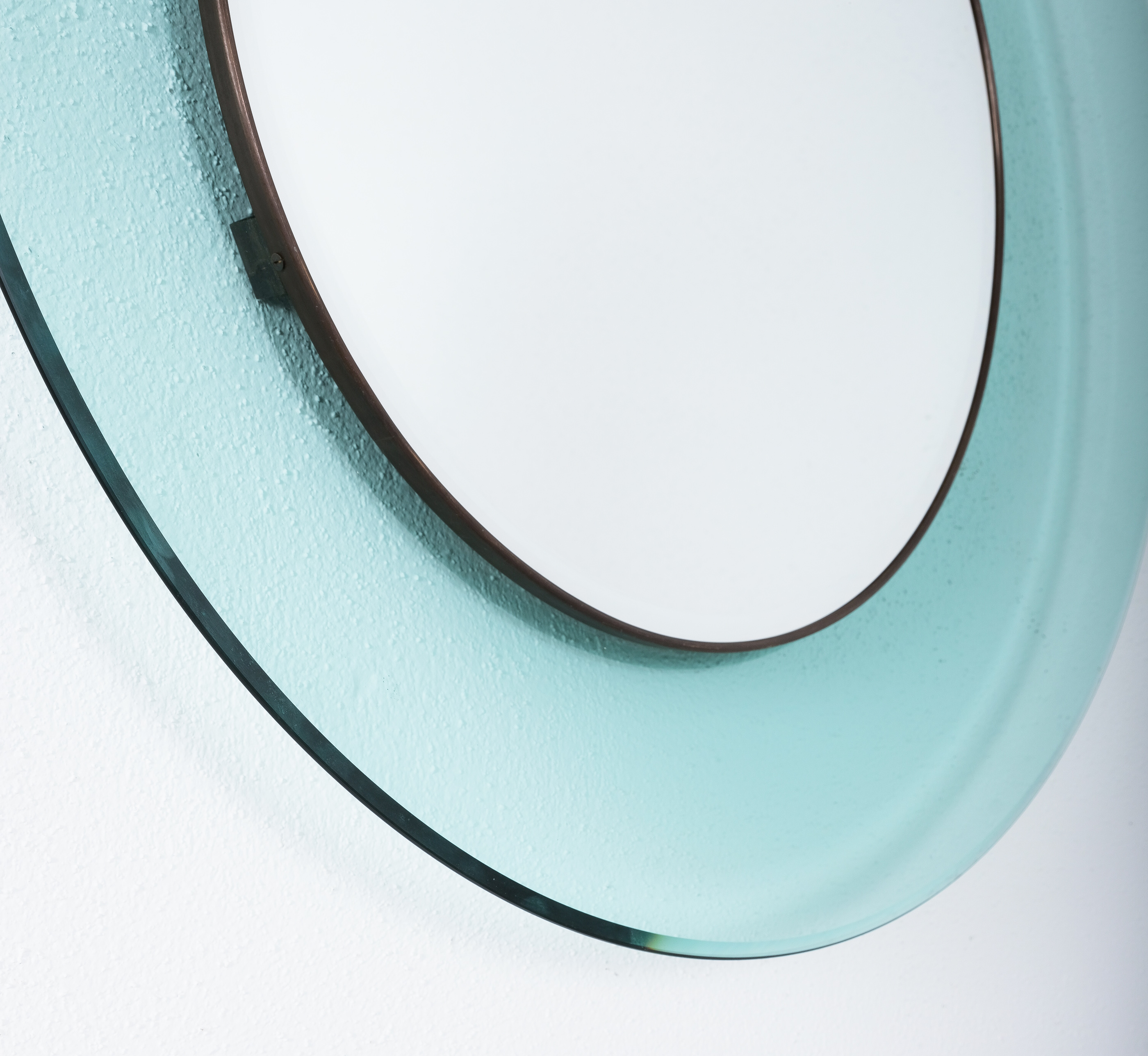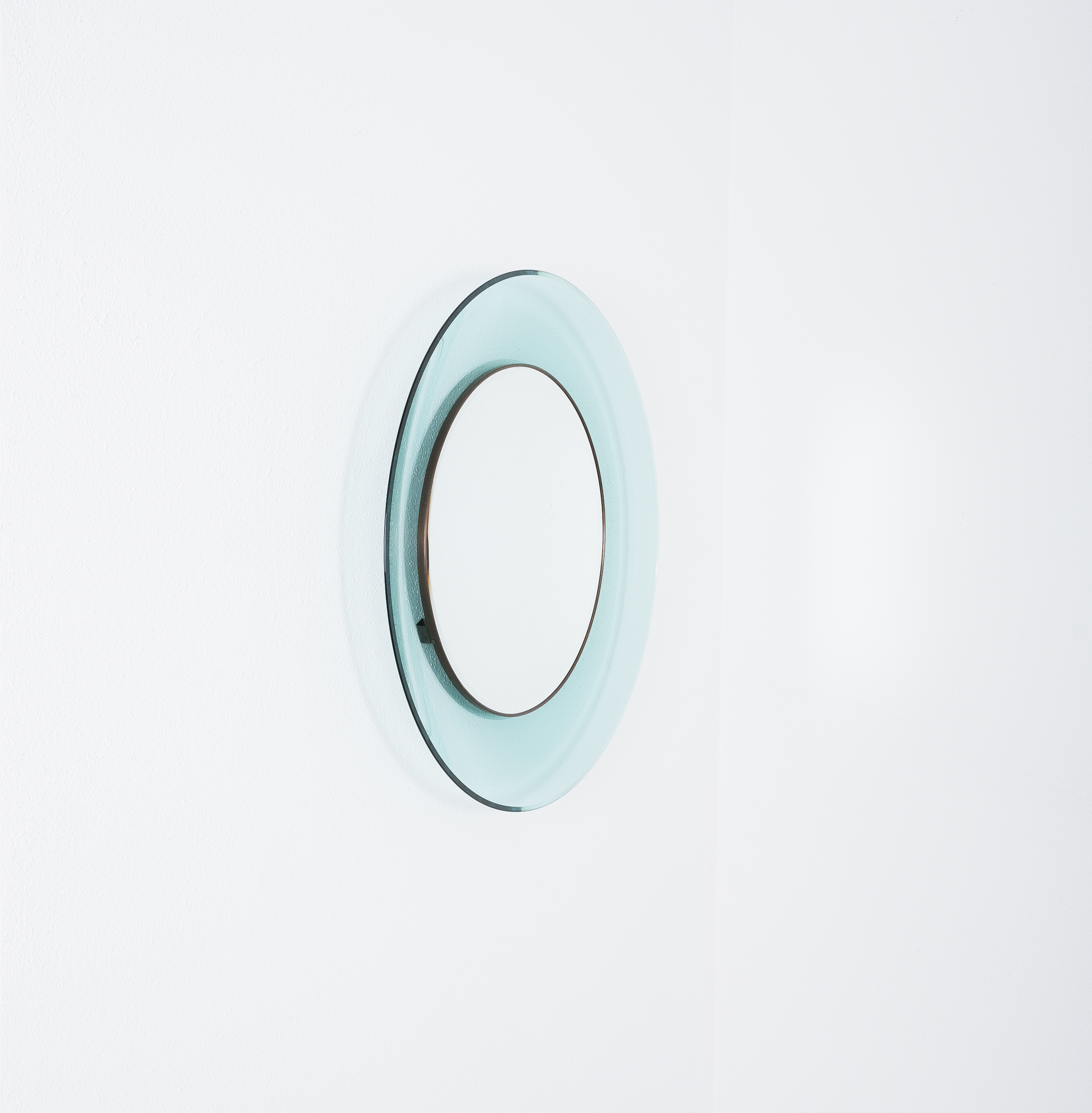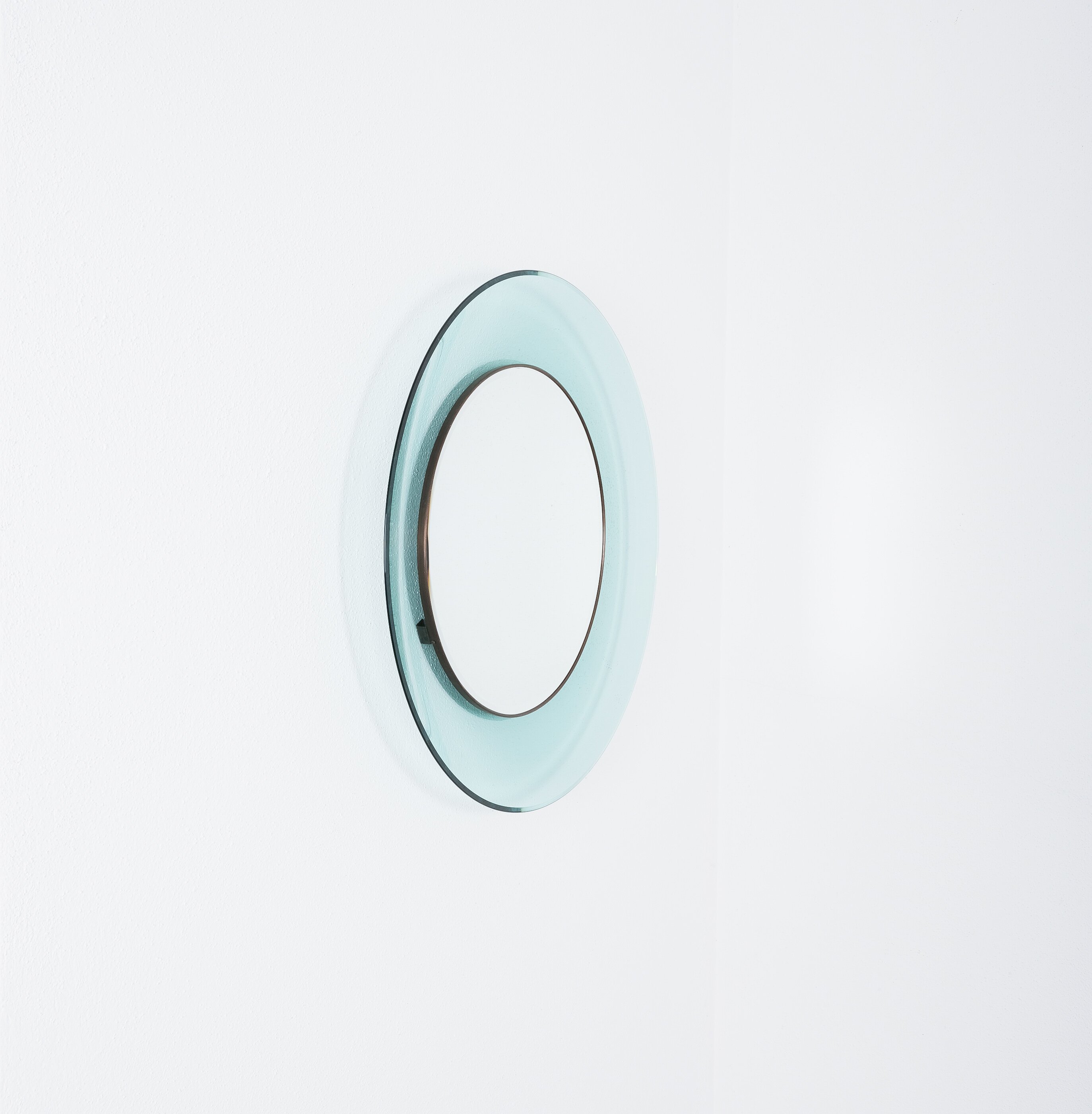 Max Ingrand round blue mirror Fontana Arte Model 1699, Italy, circa 1968. Elegant light blue-turquoise curved and beveled glass framing mirrored glass encased in brass trim. Very good condition with no chips. Measures: Diameter is 29.9". Literature: Quaderni Fontana Arte 2, 1962 Domus, no. 424, March 1965