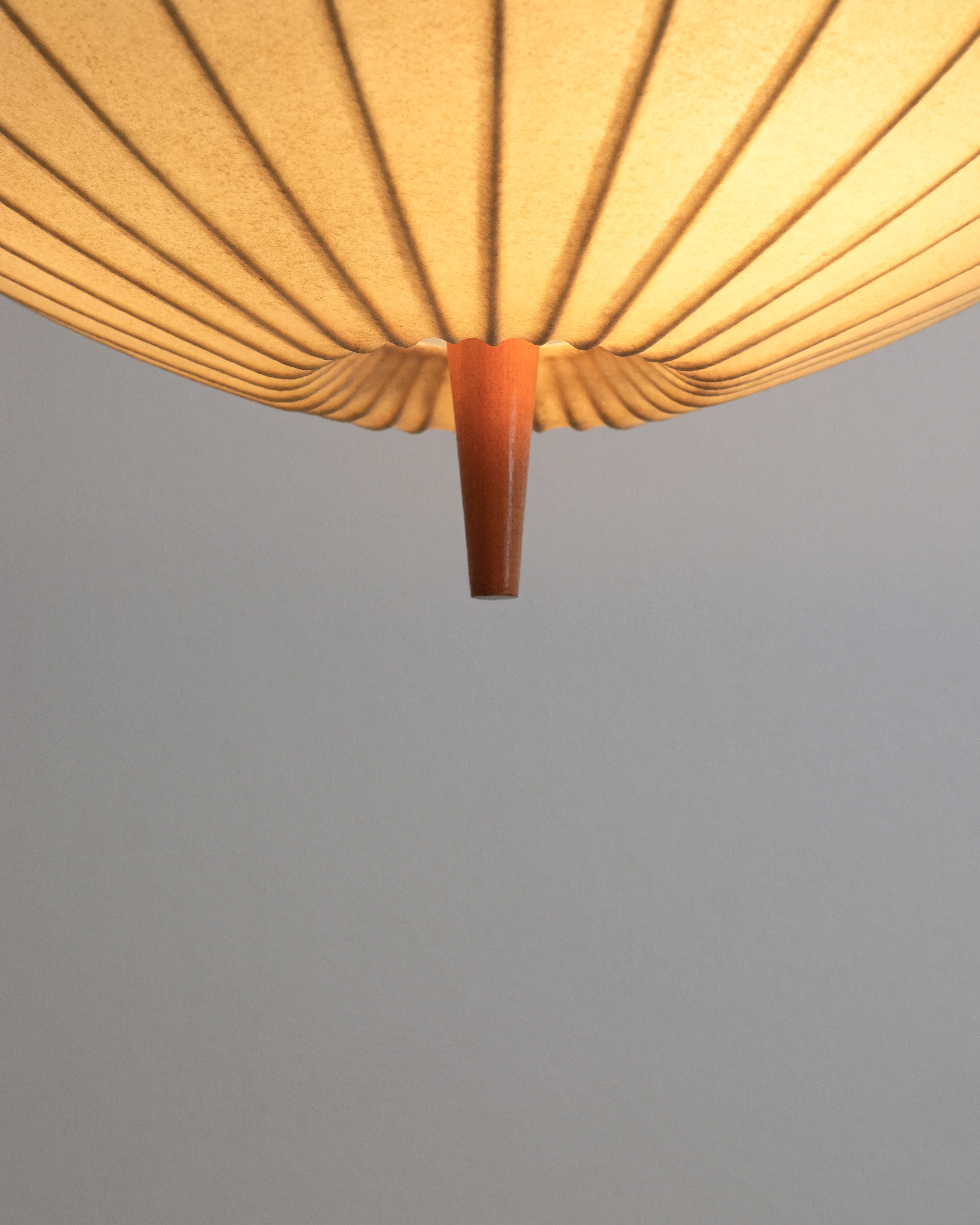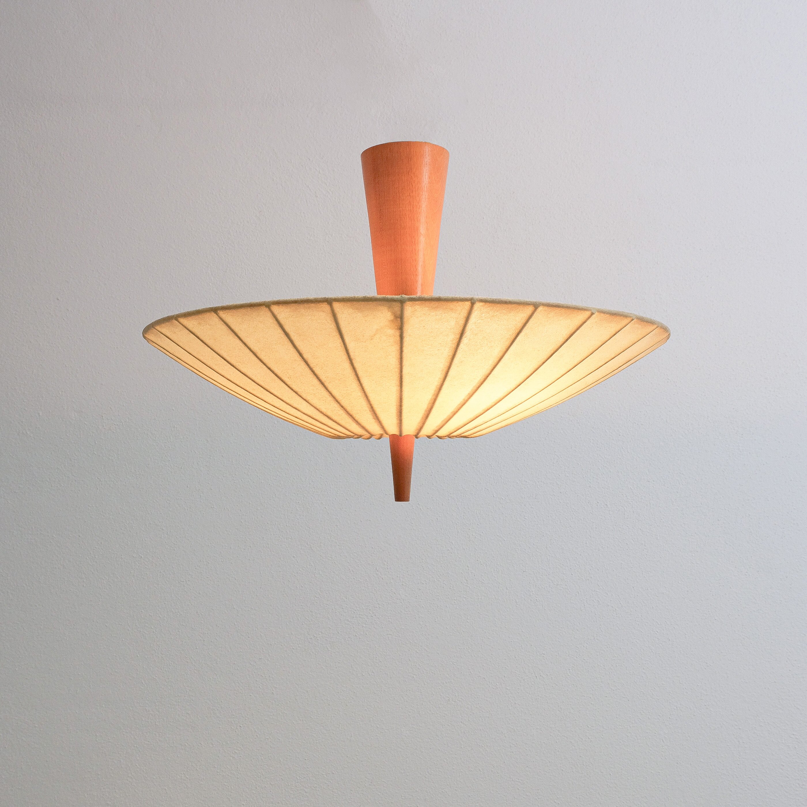 Very well preserved flush mount lamp with a 19.5" shade. The lampshade is made of a cocoon type fabric and the rack is made of metal. A wooden stem is visibly penetrating the light which makes one think of designs by Max Ingrand f.e. Very good vintage condition with no damages to the shade or wood. It holds 3x e27 bulbs with 60W each max. Led's will work as well. Dimensions are 19.5” x 13.4".