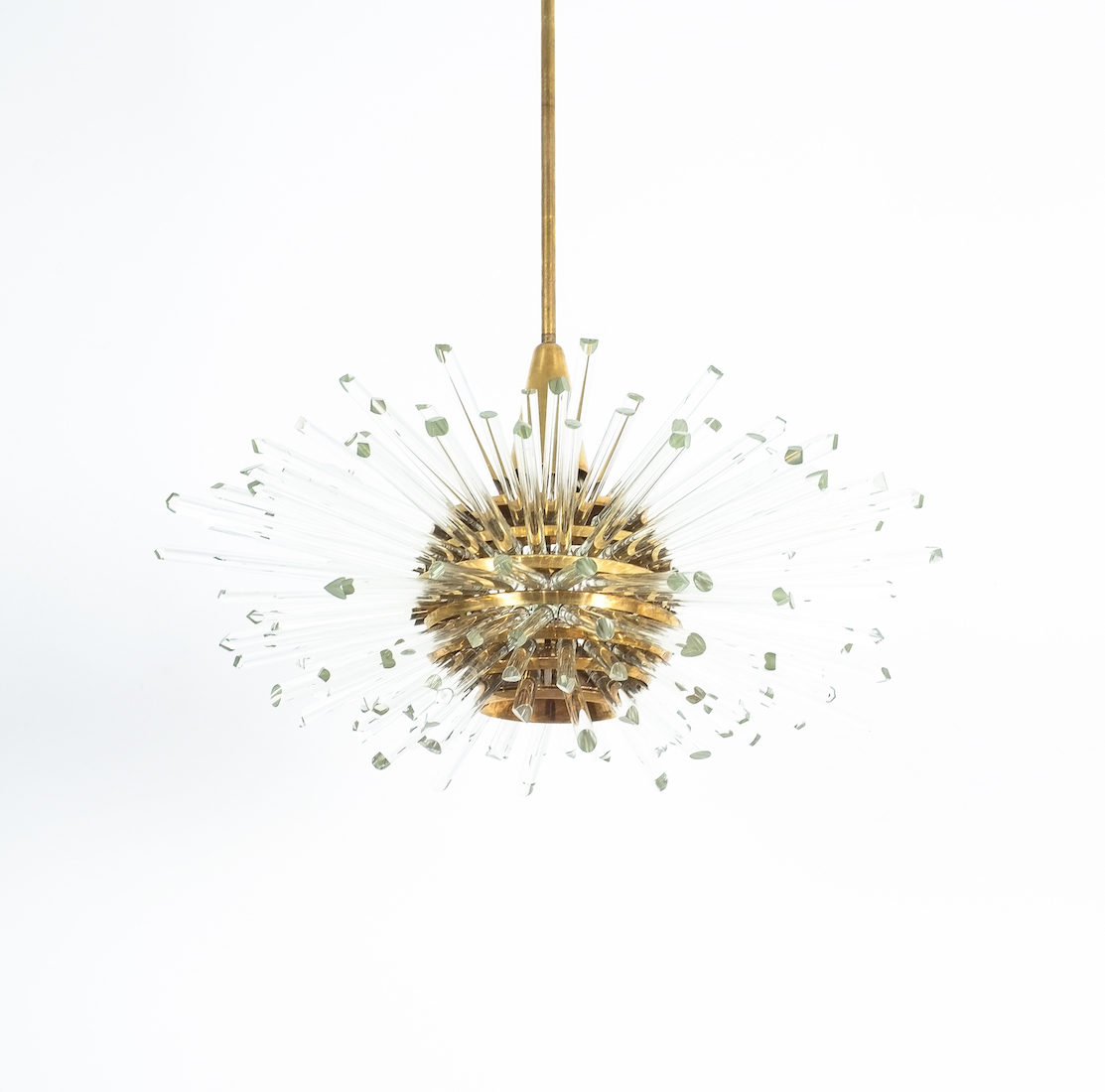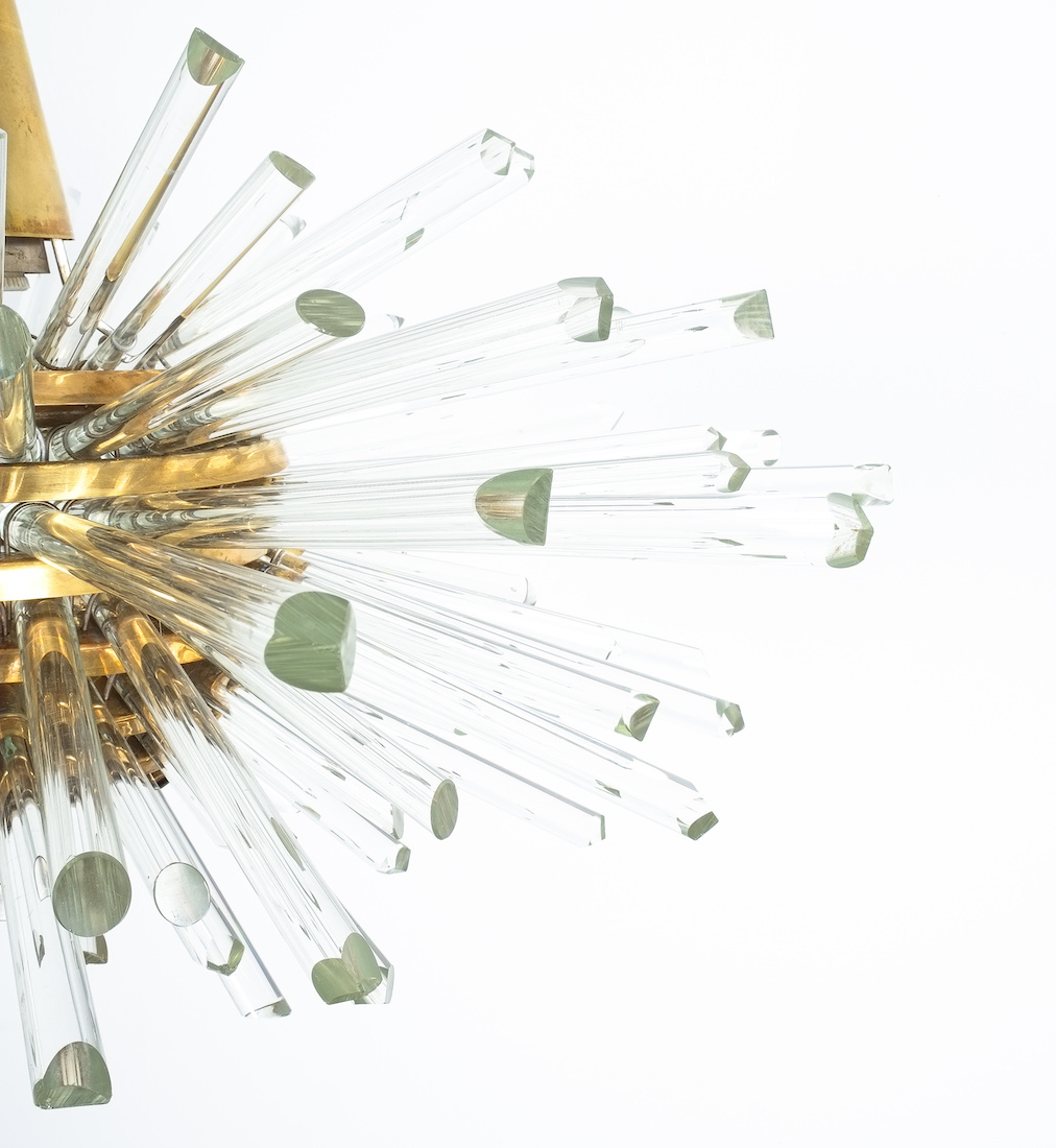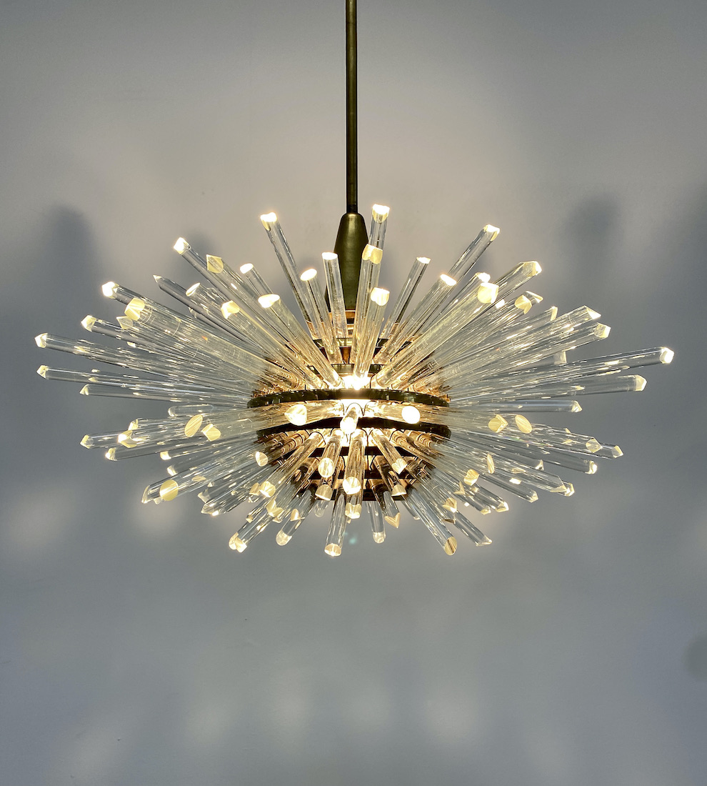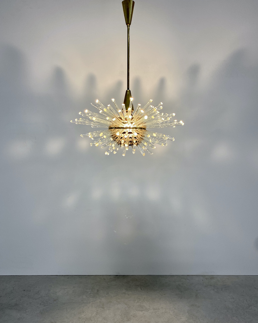 Original vintage light with a multitude of radiant handmade glass rods pointing and carrying the light outwards to the tips.