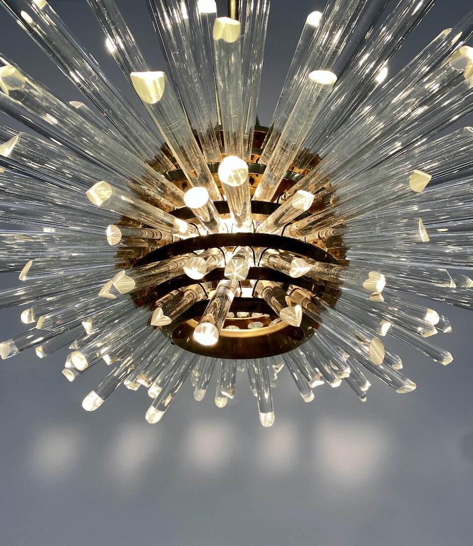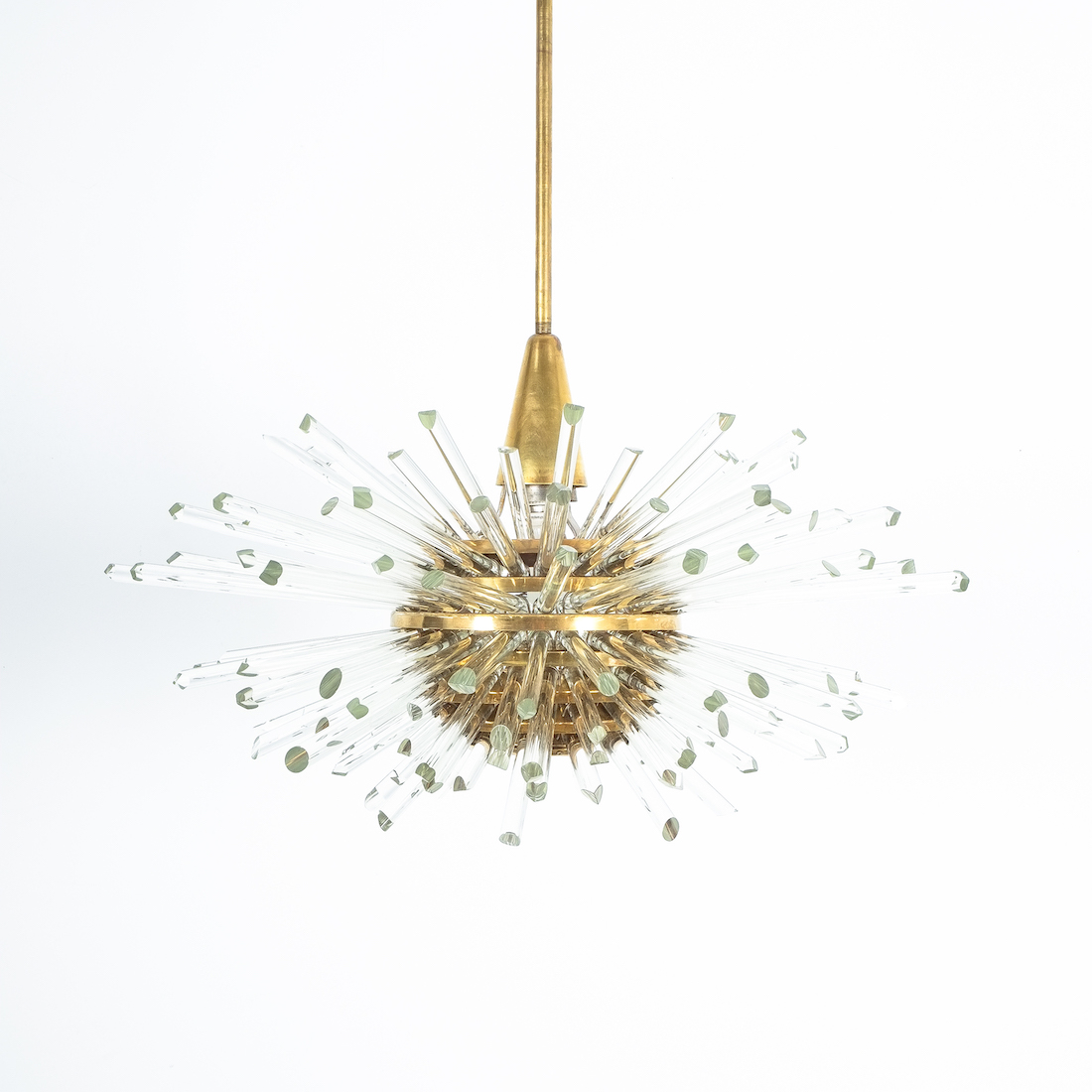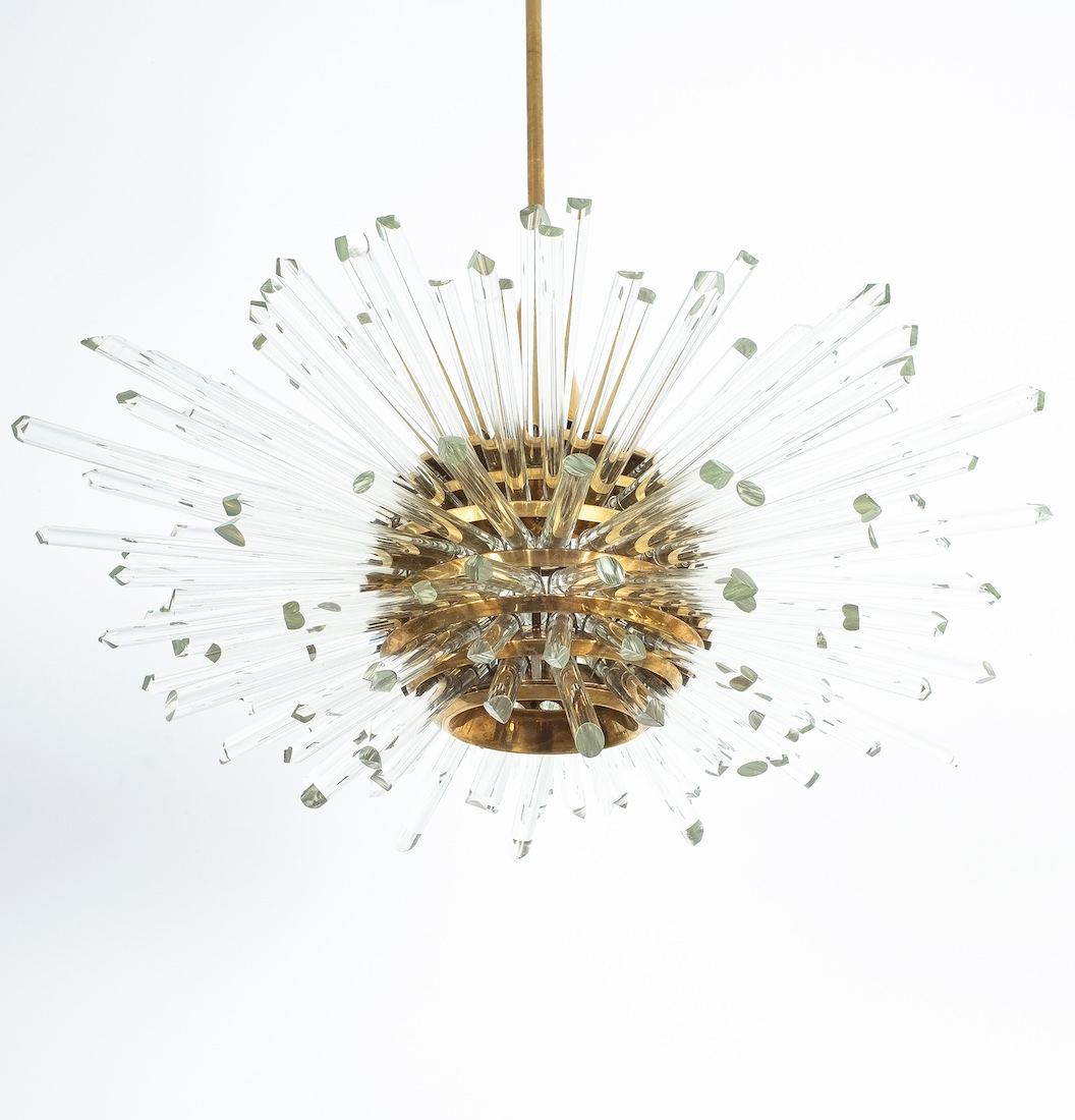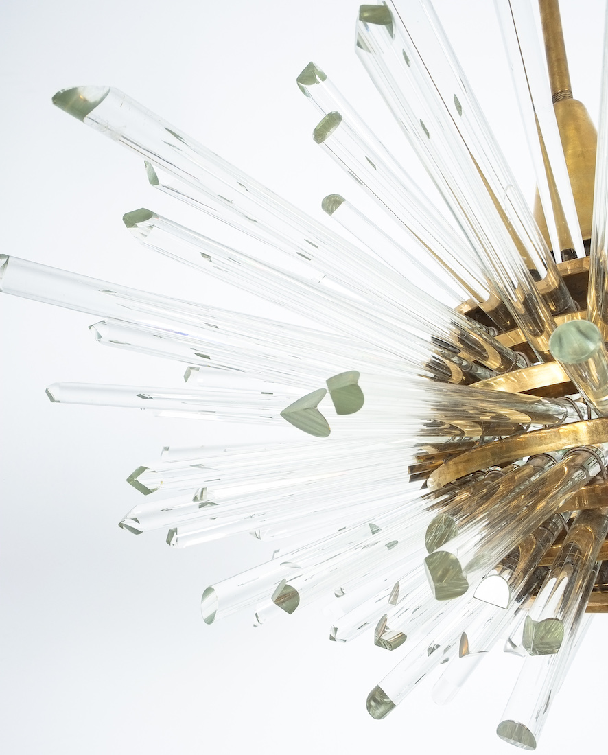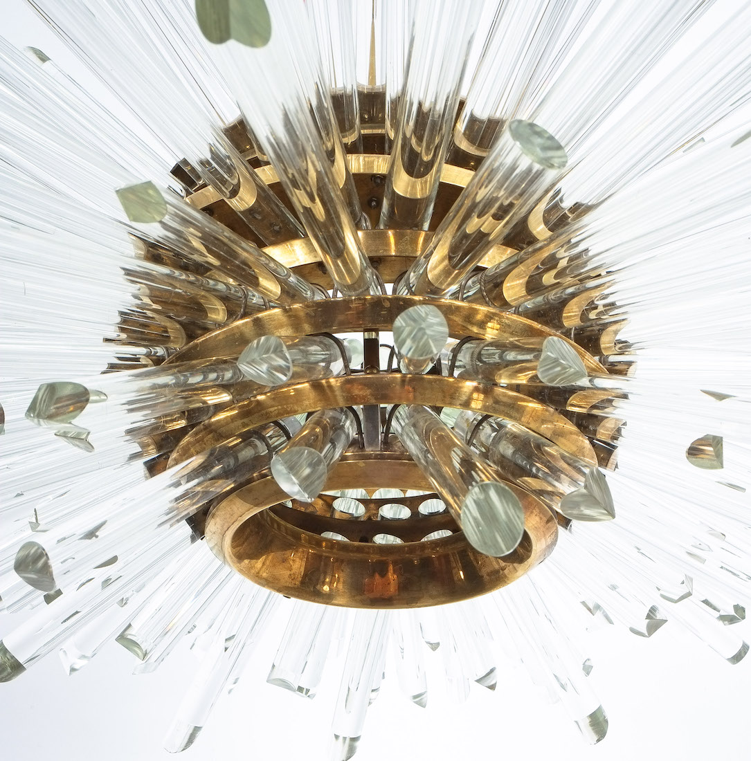 Original vintage light with a multitude of radiant handmade glass rods pointing and carrying the light outwards to the tips.