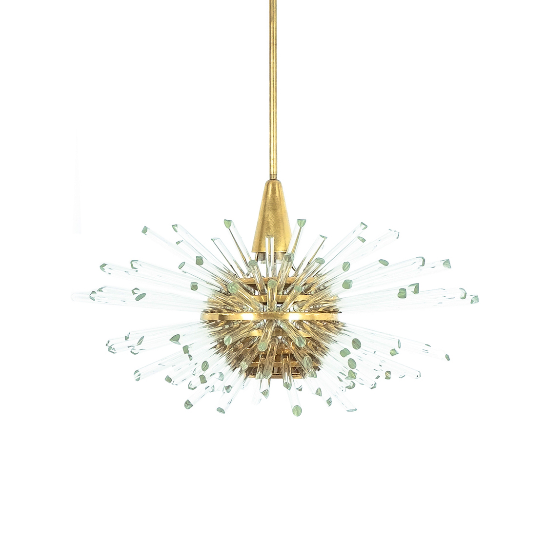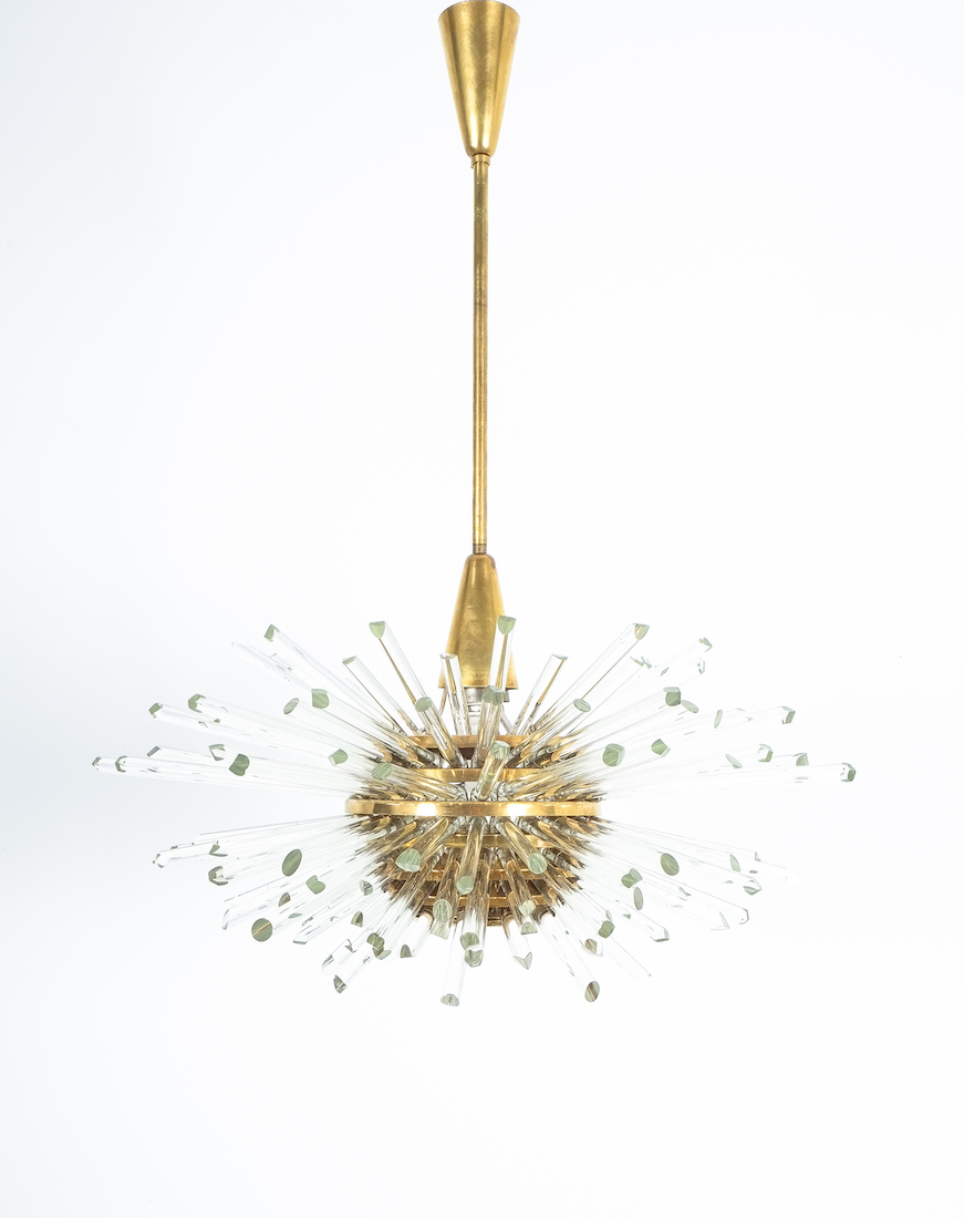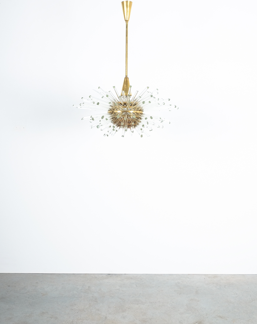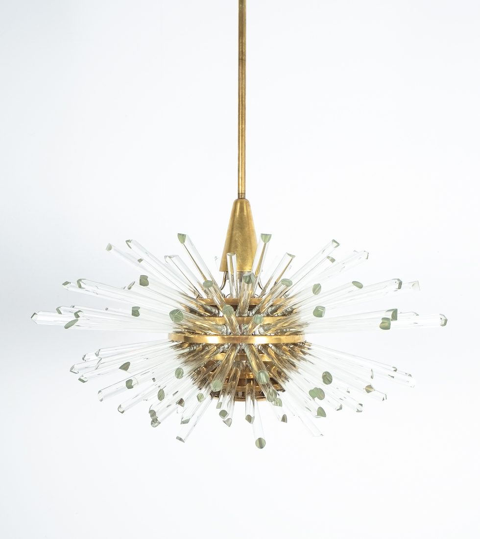 Original vintage light with a multitude of radiant handmade glass rods pointing and carrying the light outwards to the tips.