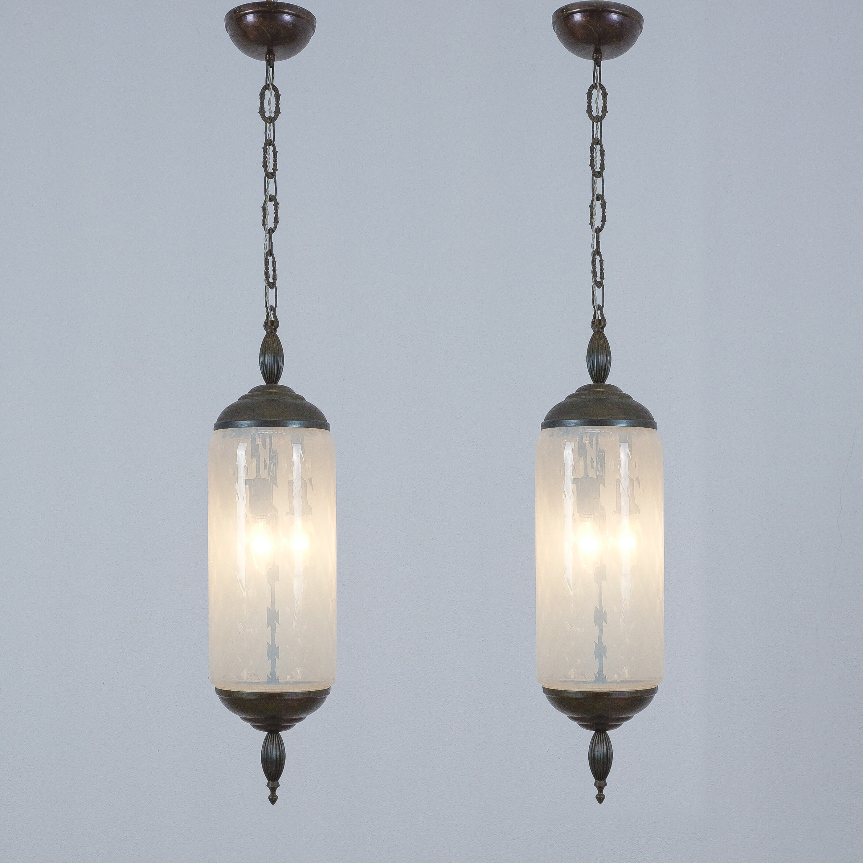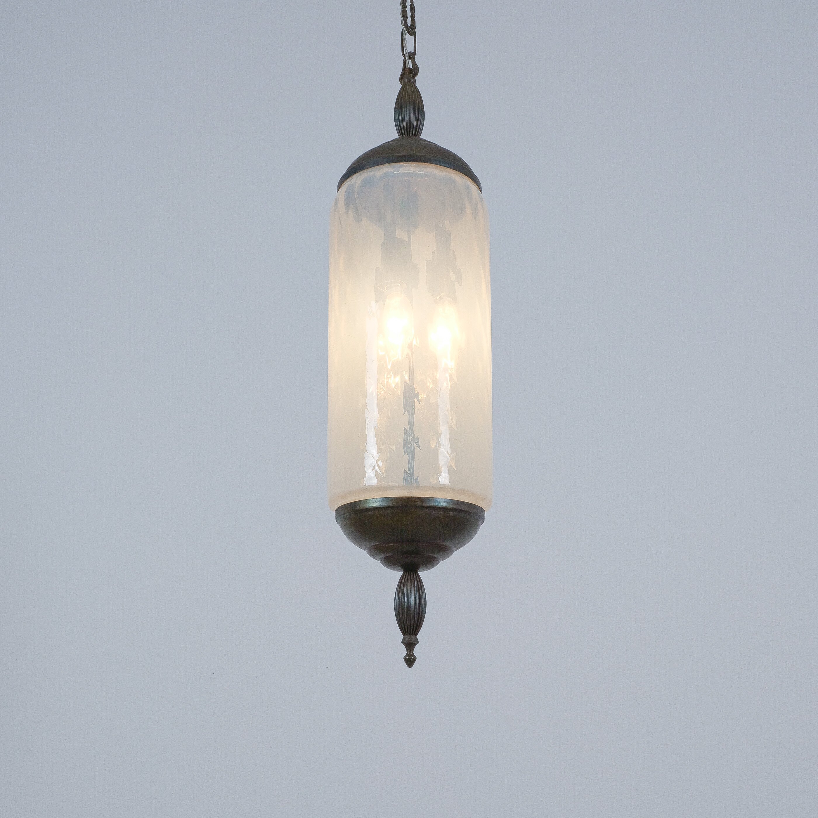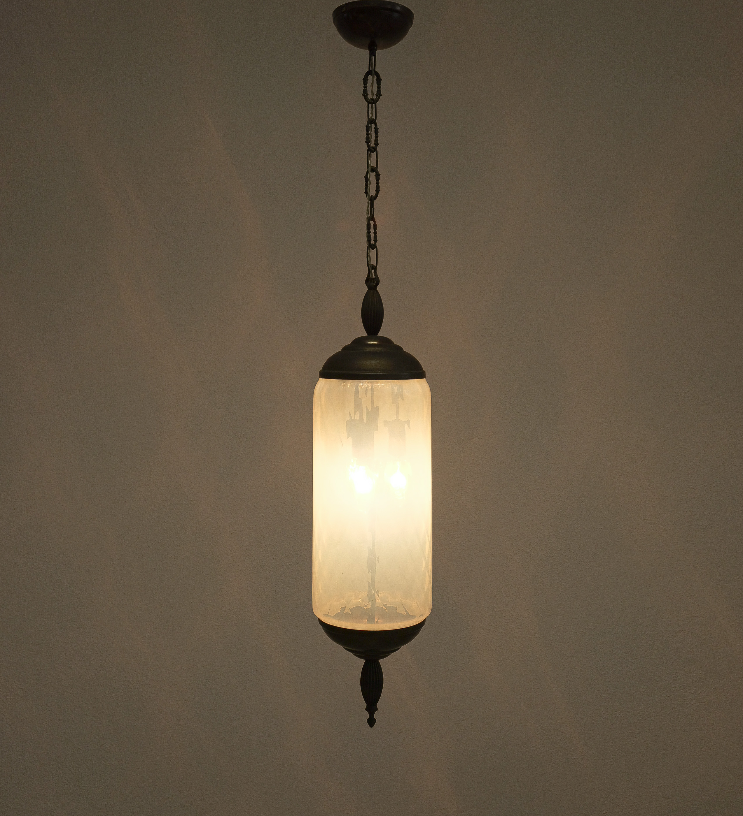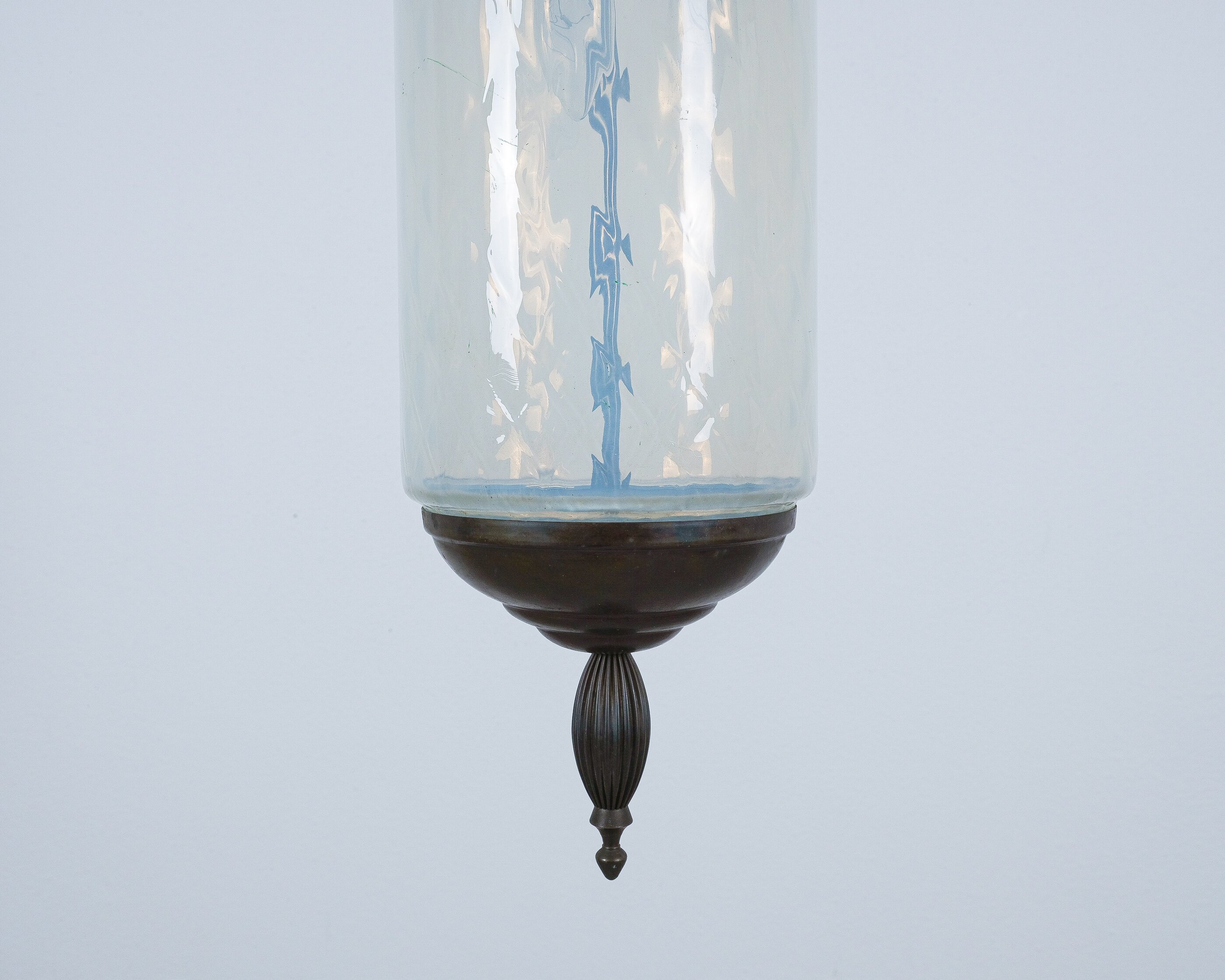 Nice pair of Italian lantern lights with beautiful iridescent slightly blue satin glass that was handblown equipped with dark patinated brass lantern-style hardware. Good condition, with signs of wear to the brass, newly wired- three bulbs per light (40W max per e14 Edison bulb) Led's are certainly recommended, they also come dimmable. We can customize the height at any length required. Sold as a pair only. Measurements are 6.7" x 24.5" (light shade only, hardware bottom to top) overall height/drop as pictured is 41.34".