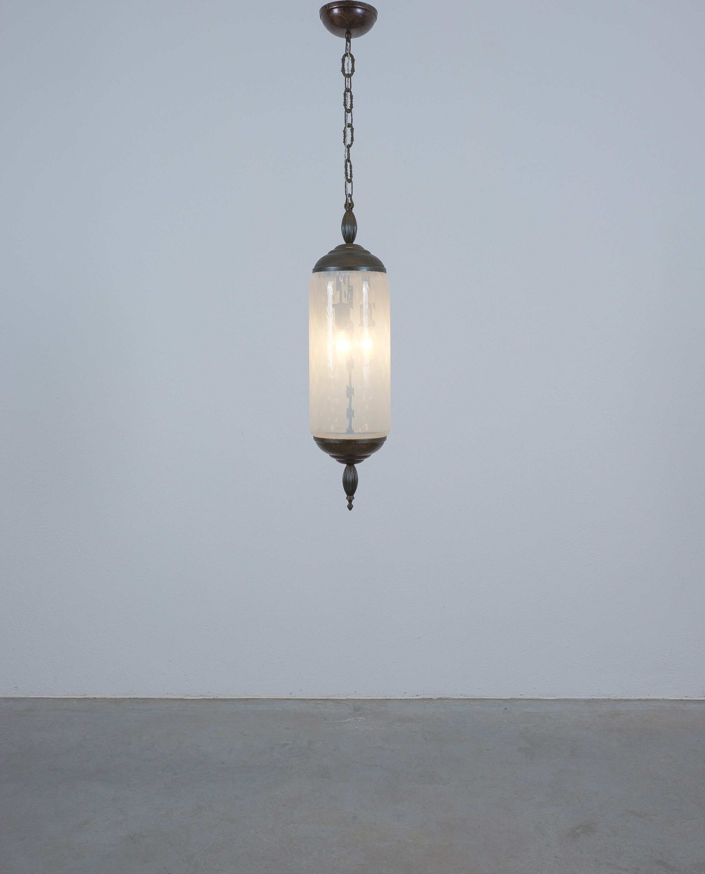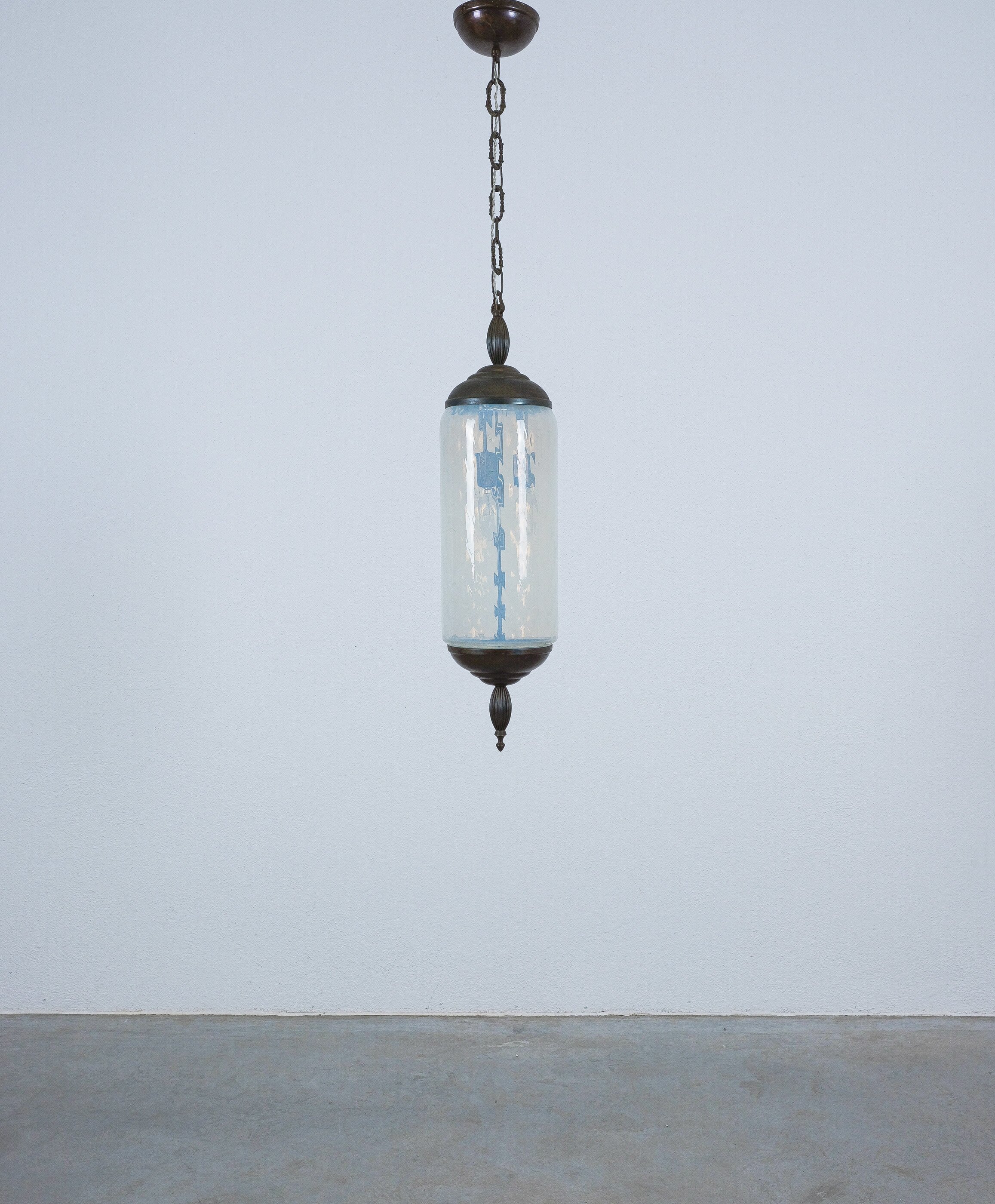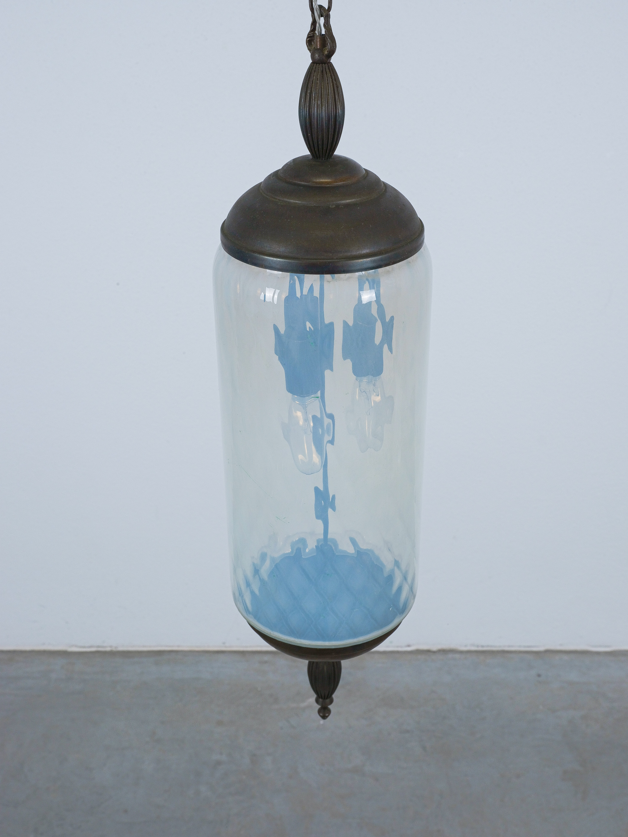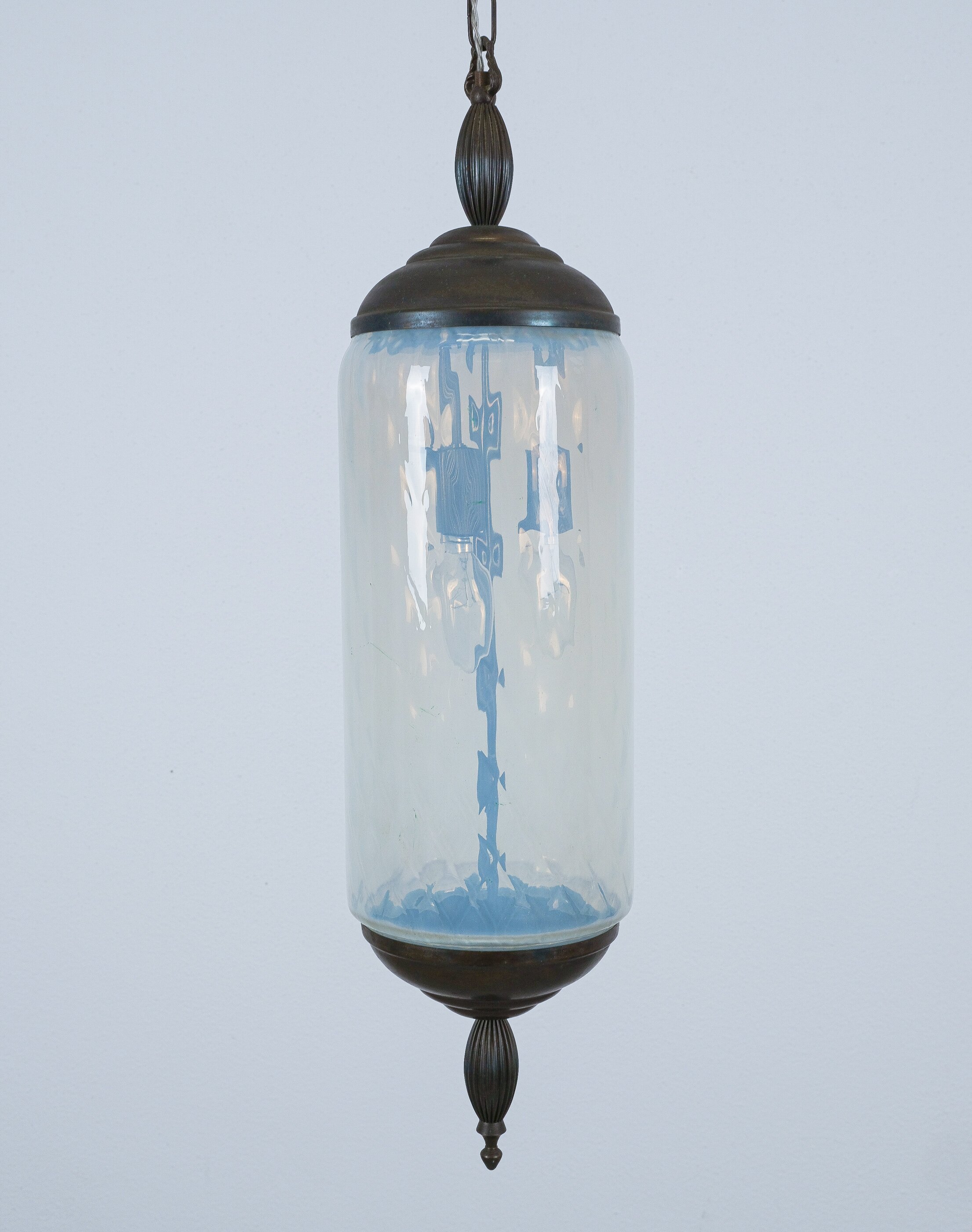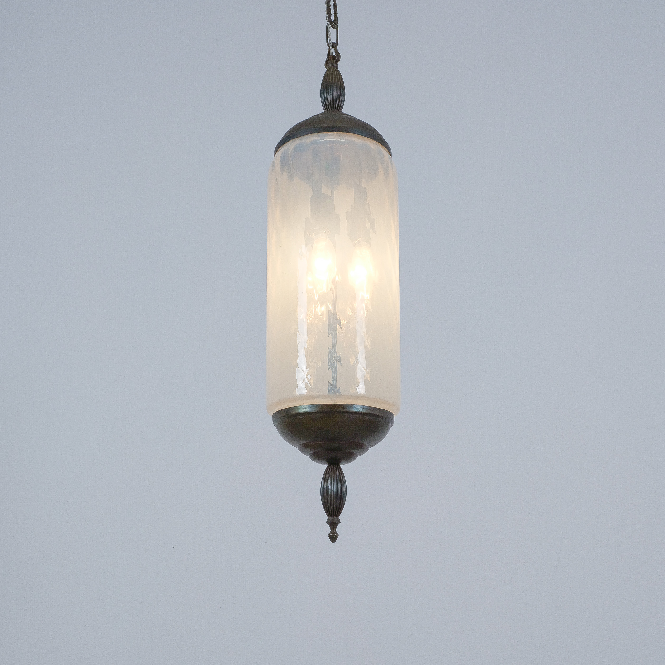 Nice pair of Italian lantern lights with beautiful iridescent slightly blue satin glass that was handblown equipped with dark patinated brass lantern-style hardware. Good condition, with signs of wear to the brass, newly wired- three bulbs per light (40W max per e14 Edison bulb) Led's are certainly recommended, they also come dimmable. We can customize the height at any length required. Sold as a pair only. Measurements are 6.7" x 24.5" (light shade only, hardware bottom to top) overall height/drop as pictured is 41.34".