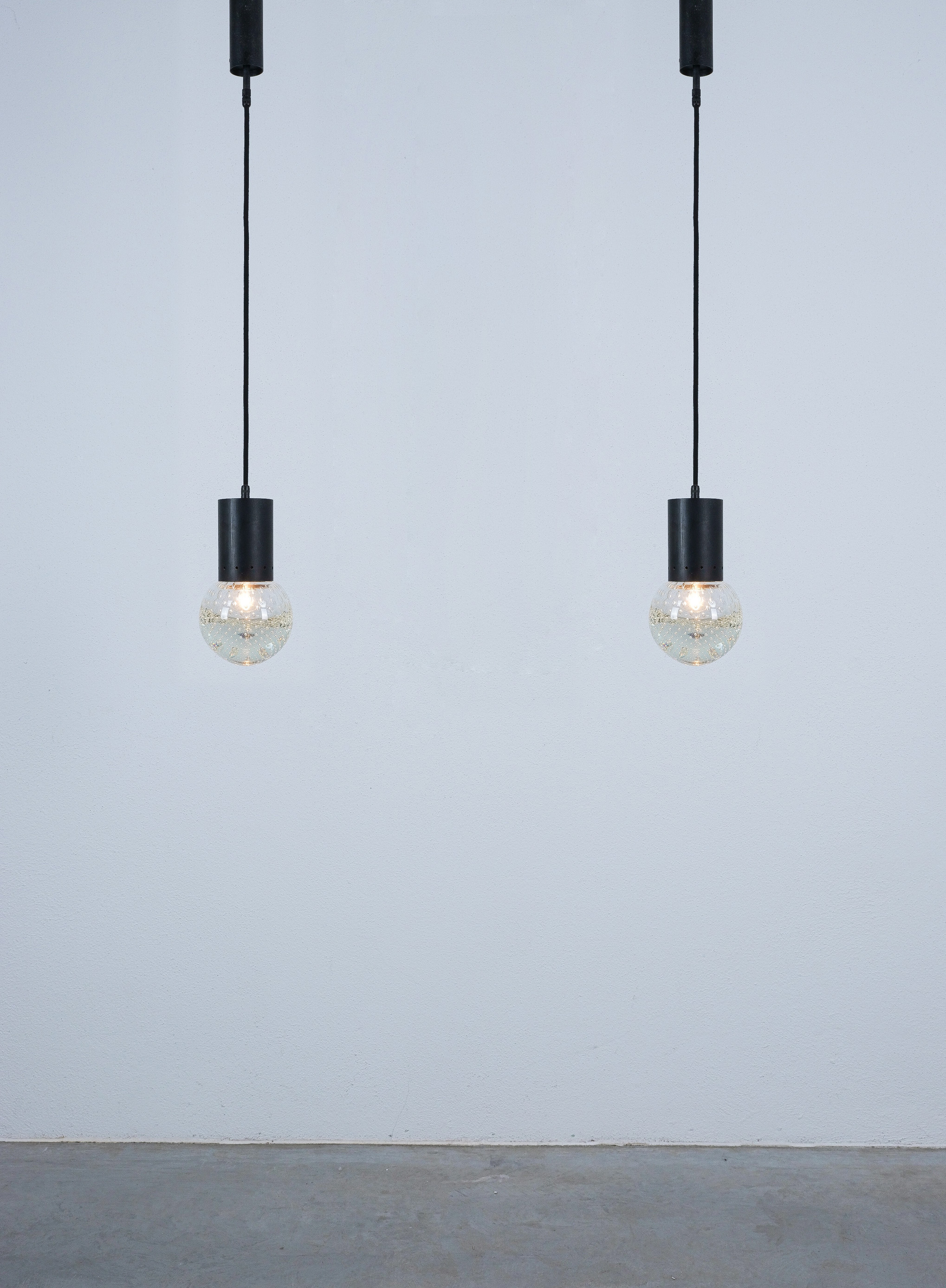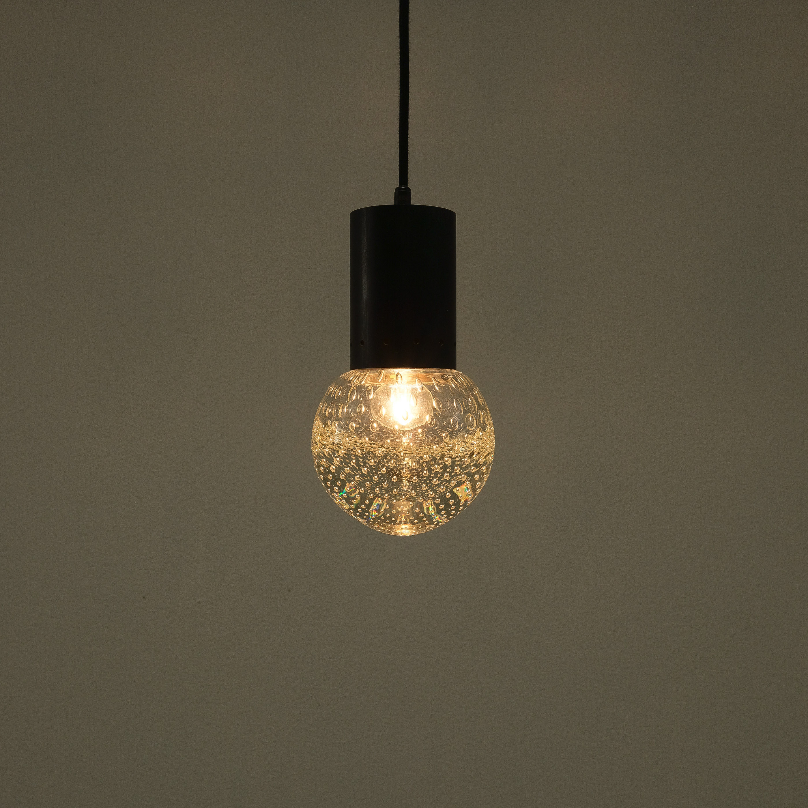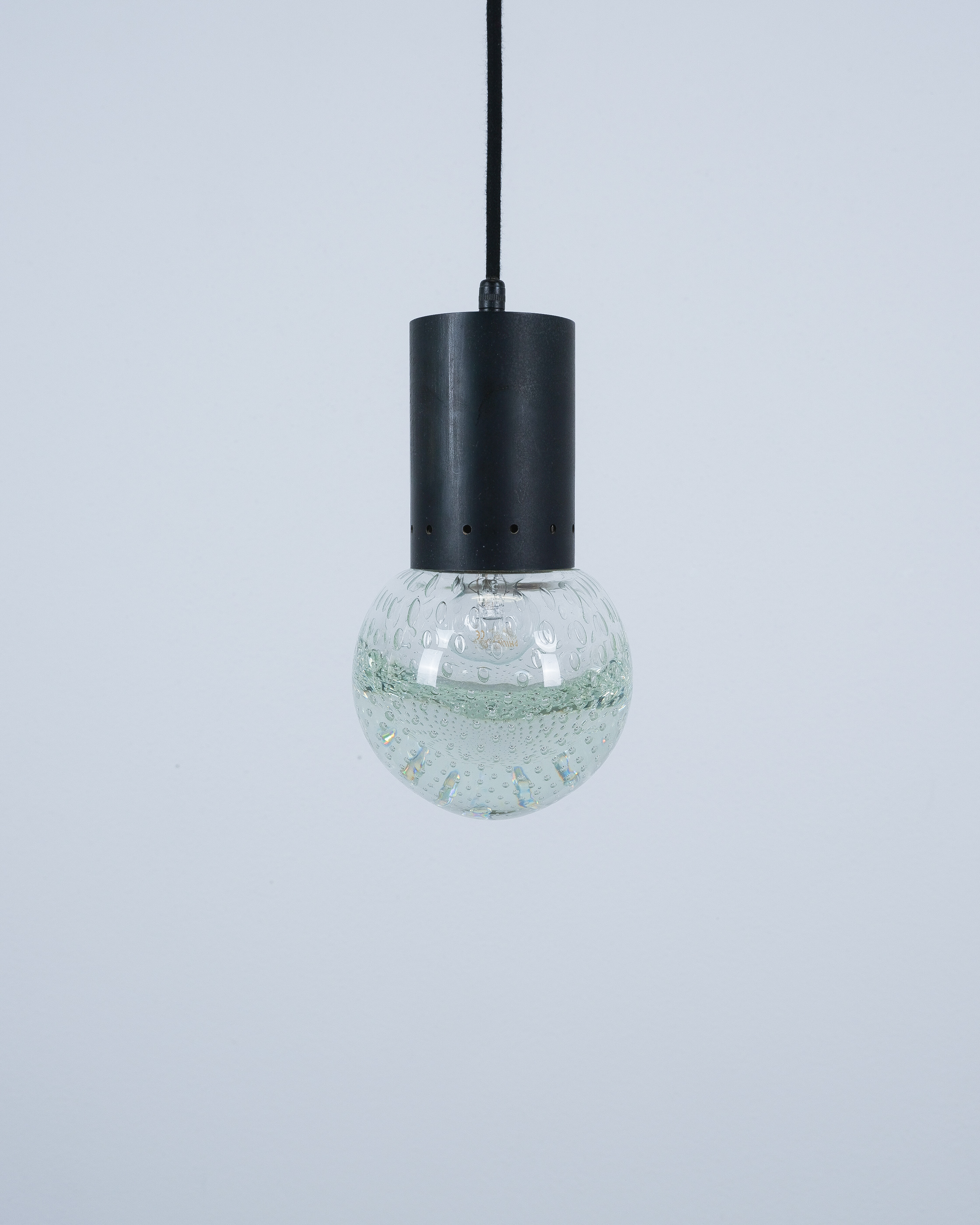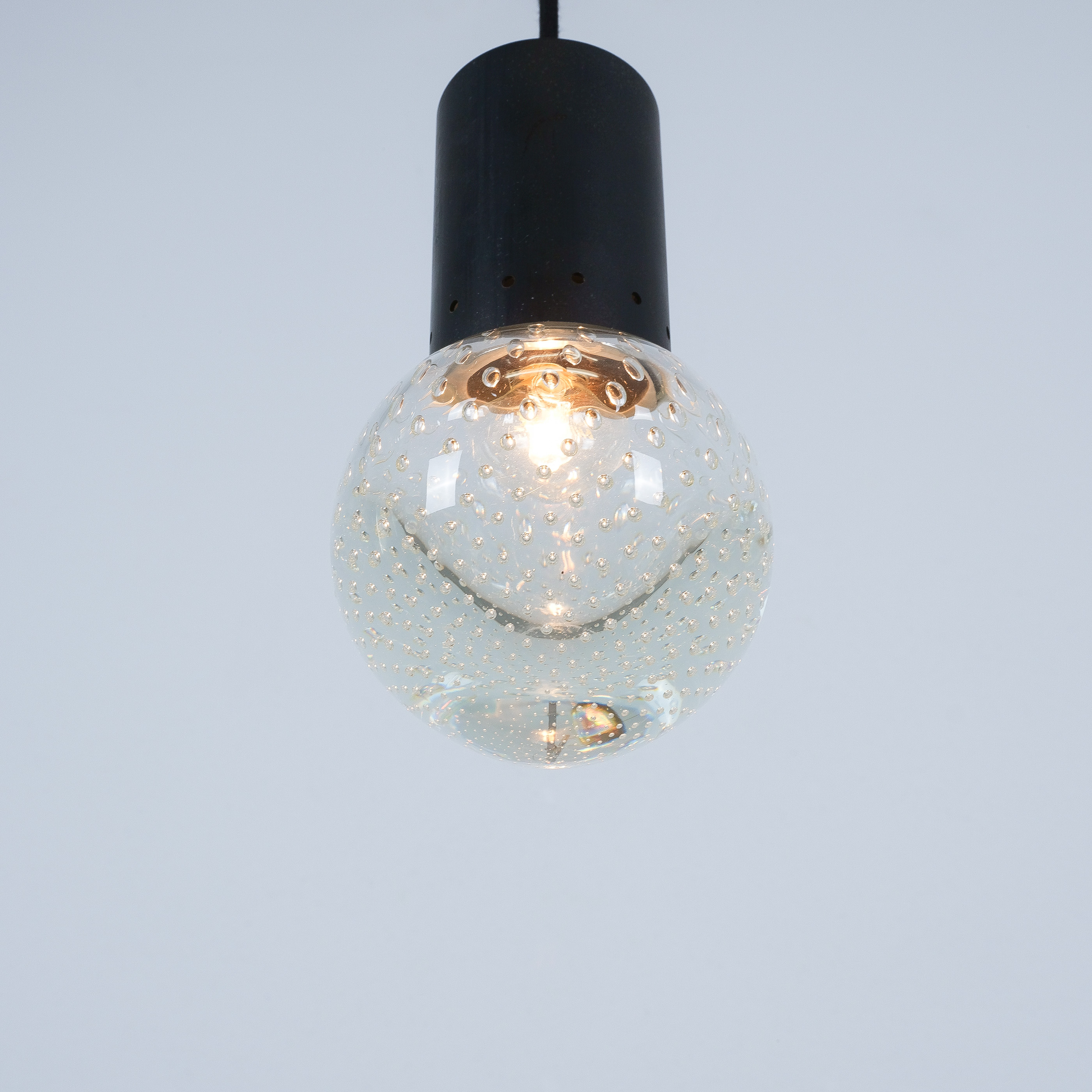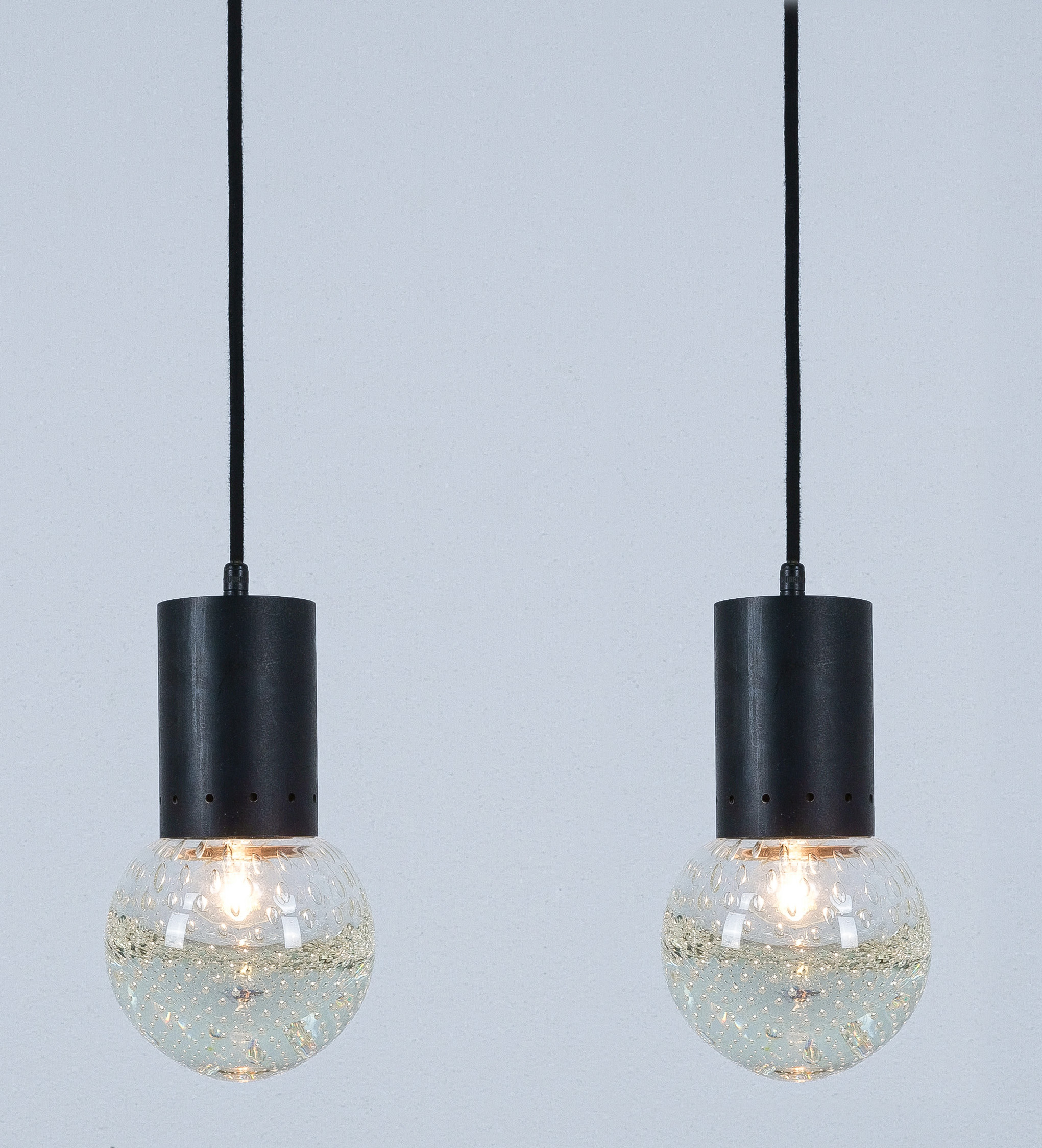 This version measures 4.72" in diameter and is priced as a pair. This original pair has been executed in hand blown bubbled Seguso glass and painted metal. The bulb dips into the glass, hiding in a cavity; it's a simple yet beautiful design by Gino Sarfatti, an incredibly refined example of mastery and imagination. One bulb e14 with 40-60W. Newly rewired, very good condition with light wear to the metal parts. We recommend Led's due to lesser het-emission and more actual power. The pendants measure: 4.72"x 8.84" - total drop as pictured is 41"; we can extend cable length if required. Arteluce was one of the most innovative lighting design companies in Italy during the midcentury era. Celebrated in his time and beyond as an undisputed master, Gino Sarfatti's designs have been long sought after by collectors in the know.