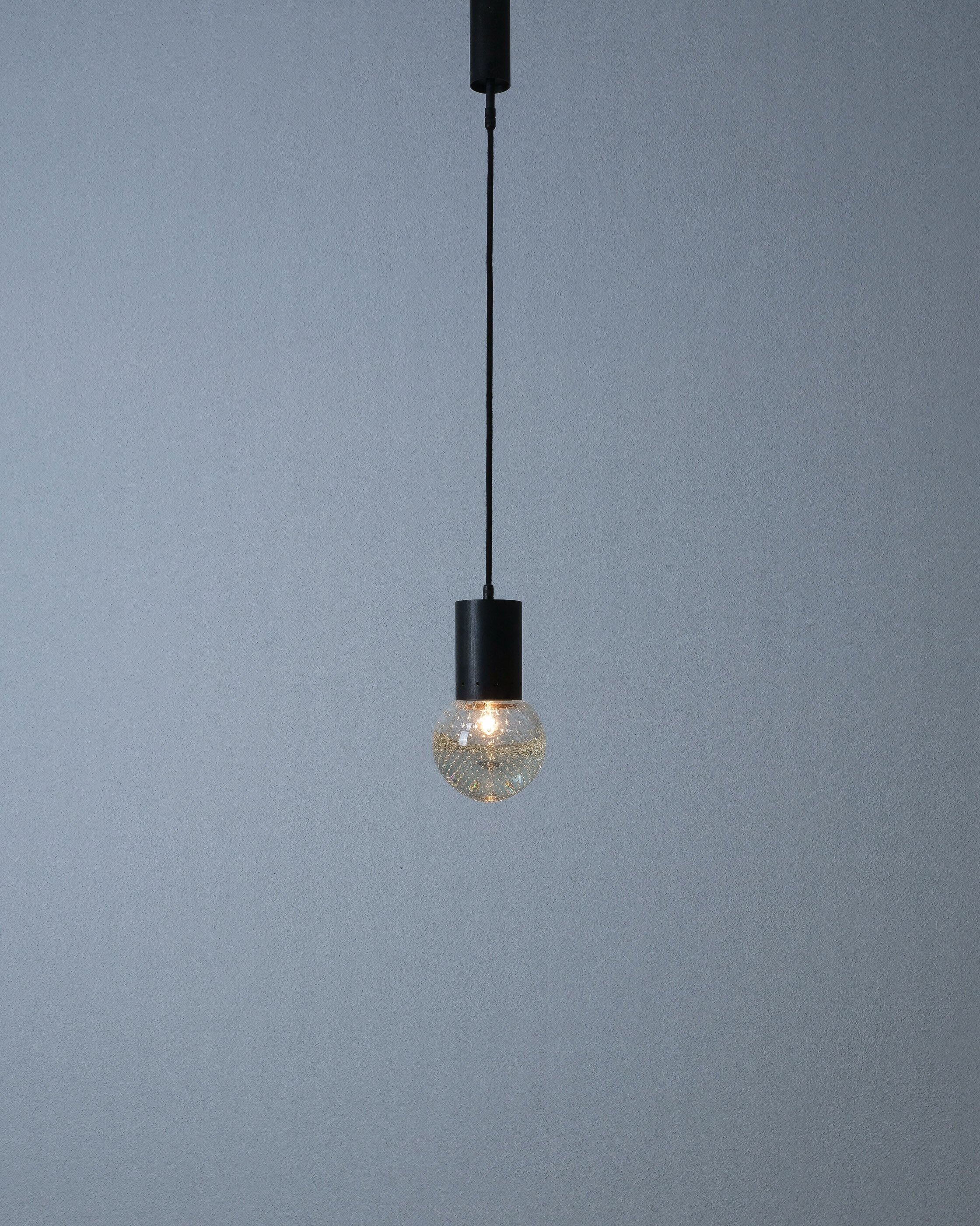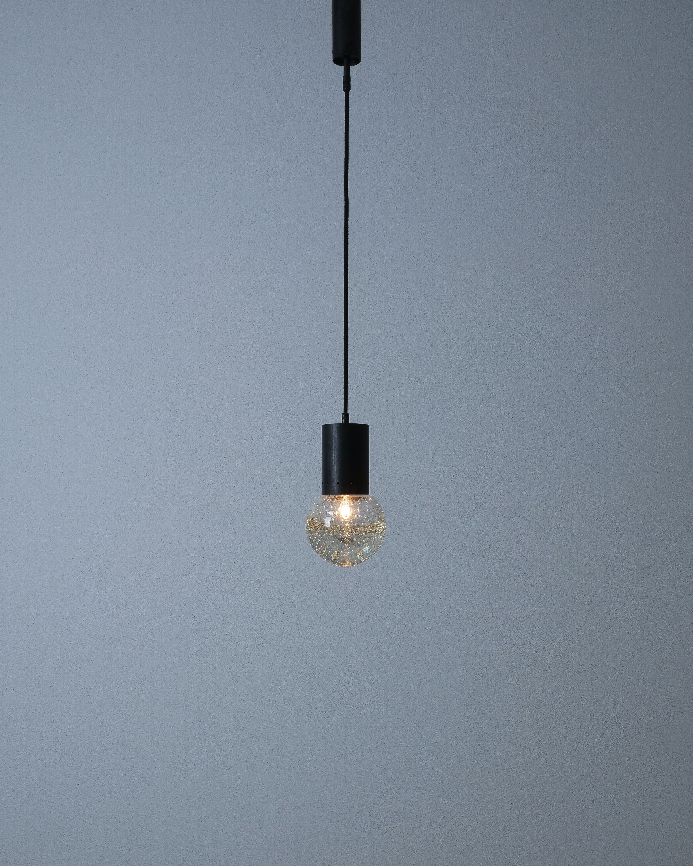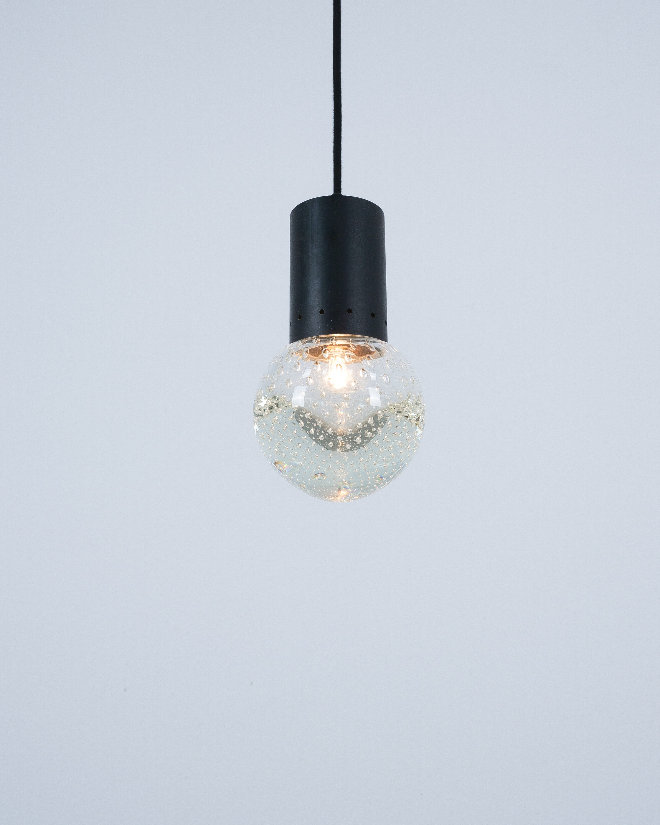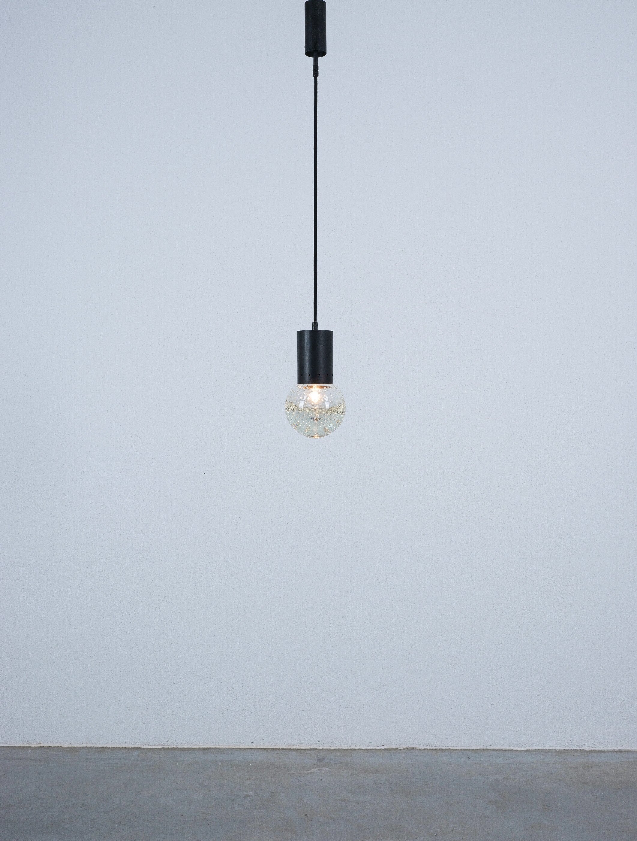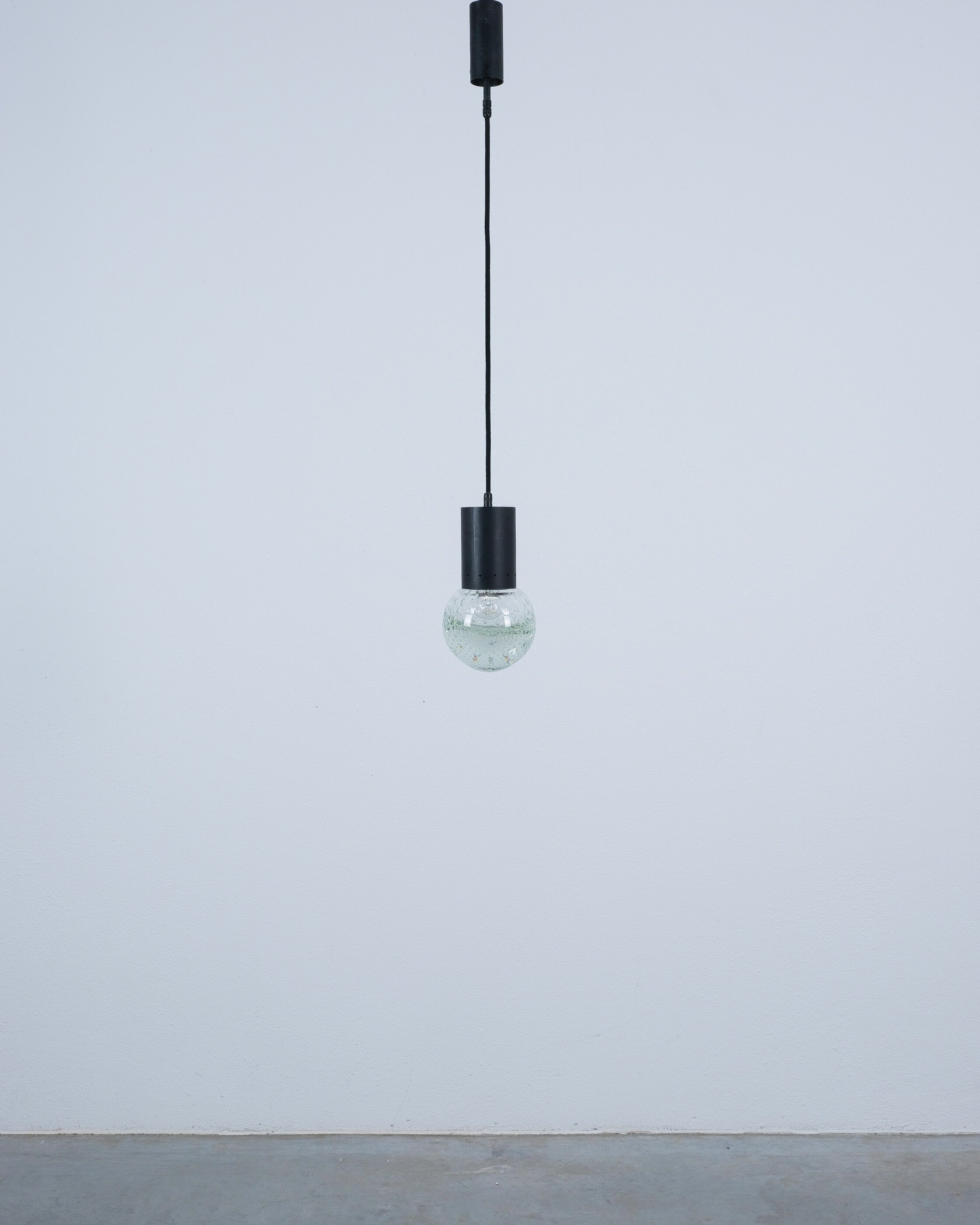 This version measures 4.72" in diameter and is priced as a pair. This original pair has been executed in hand blown bubbled Seguso glass and painted metal. The bulb dips into the glass, hiding in a cavity; it's a simple yet beautiful design by Gino Sarfatti, an incredibly refined example of mastery and imagination. One bulb e14 with 40-60W. Newly rewired, very good condition with light wear to the metal parts. We recommend Led's due to lesser het-emission and more actual power. The pendants measure: 4.72"x 8.84" - total drop as pictured is 41"; we can extend cable length if required. Arteluce was one of the most innovative lighting design companies in Italy during the midcentury era. Celebrated in his time and beyond as an undisputed master, Gino Sarfatti's designs have been long sought after by collectors in the know.