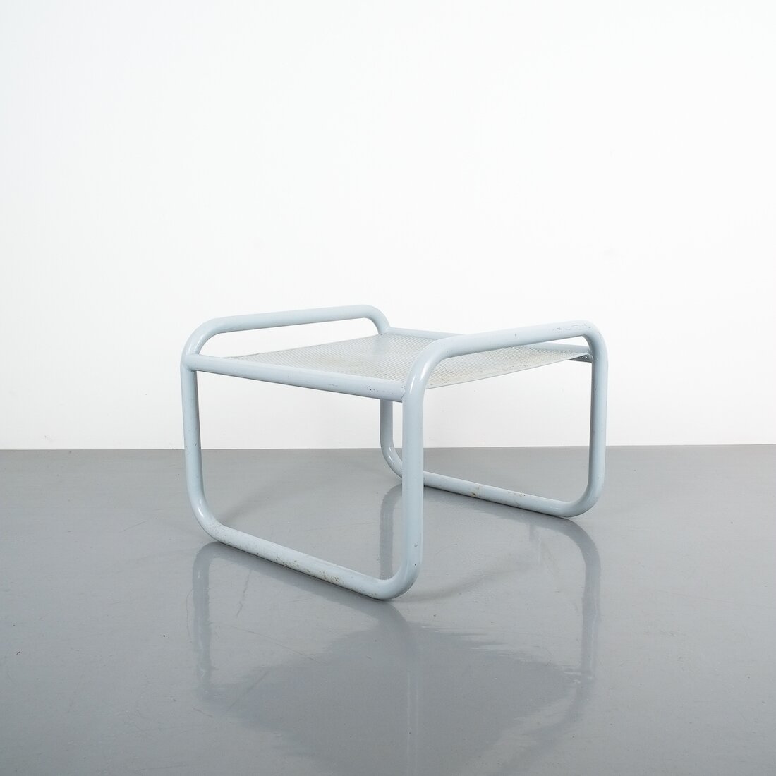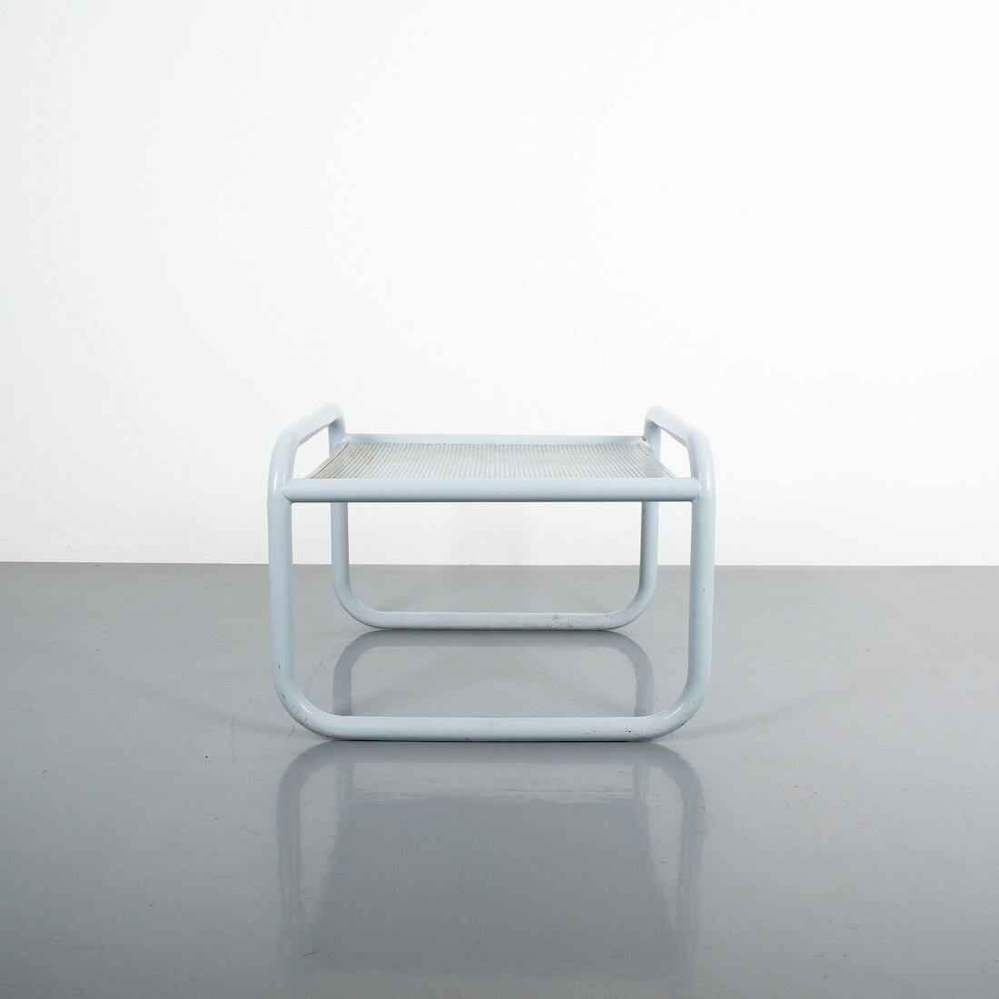 We received this as a set together with pair of matching original chairs from the same series. It's a heavy metal sculptural coffee table in a desirable size of 34"x34". The steel frames have light scratches and age related wear. The coated table top has light scratches and patina, sturdy and structurally sound, ready to be used immediately.
