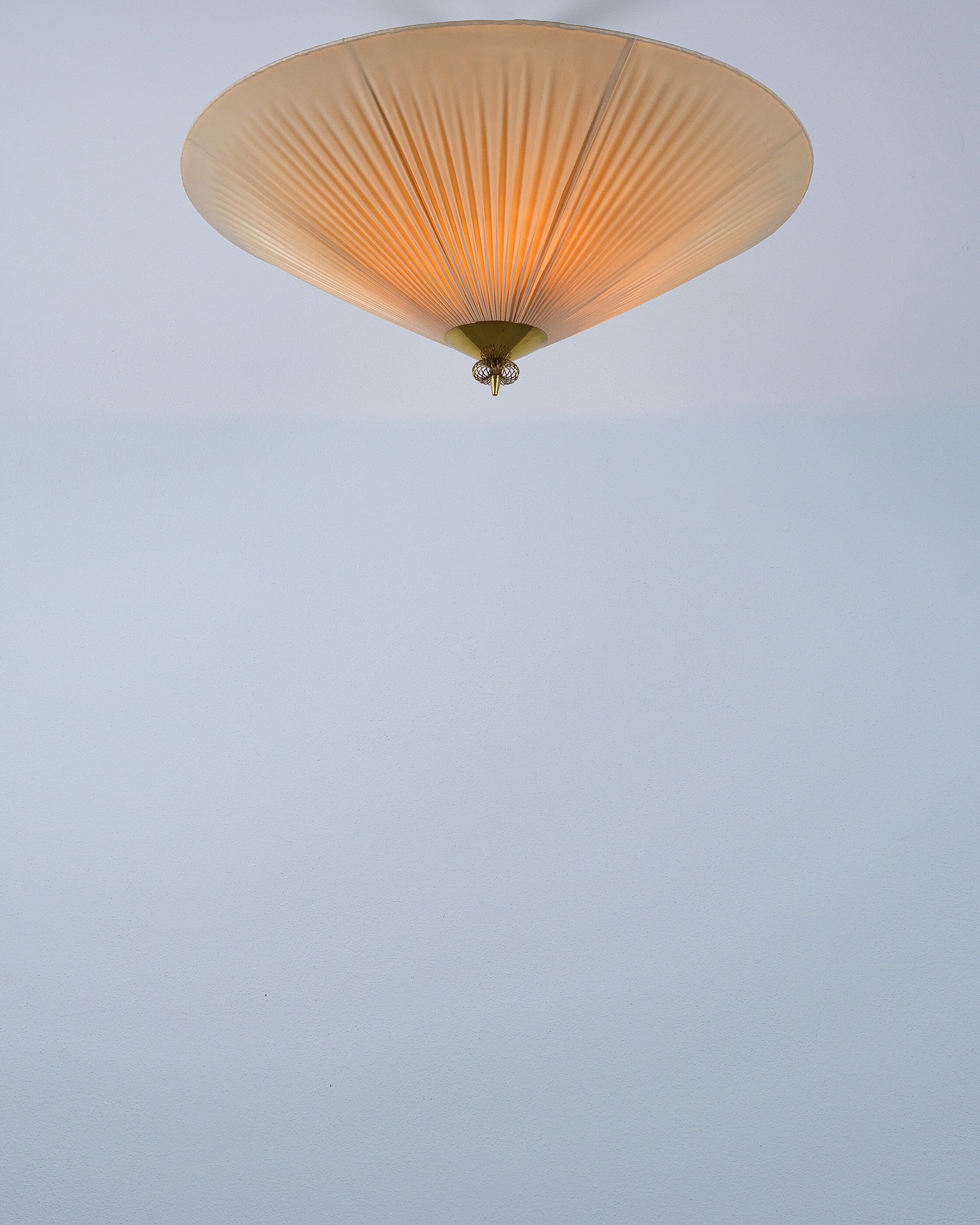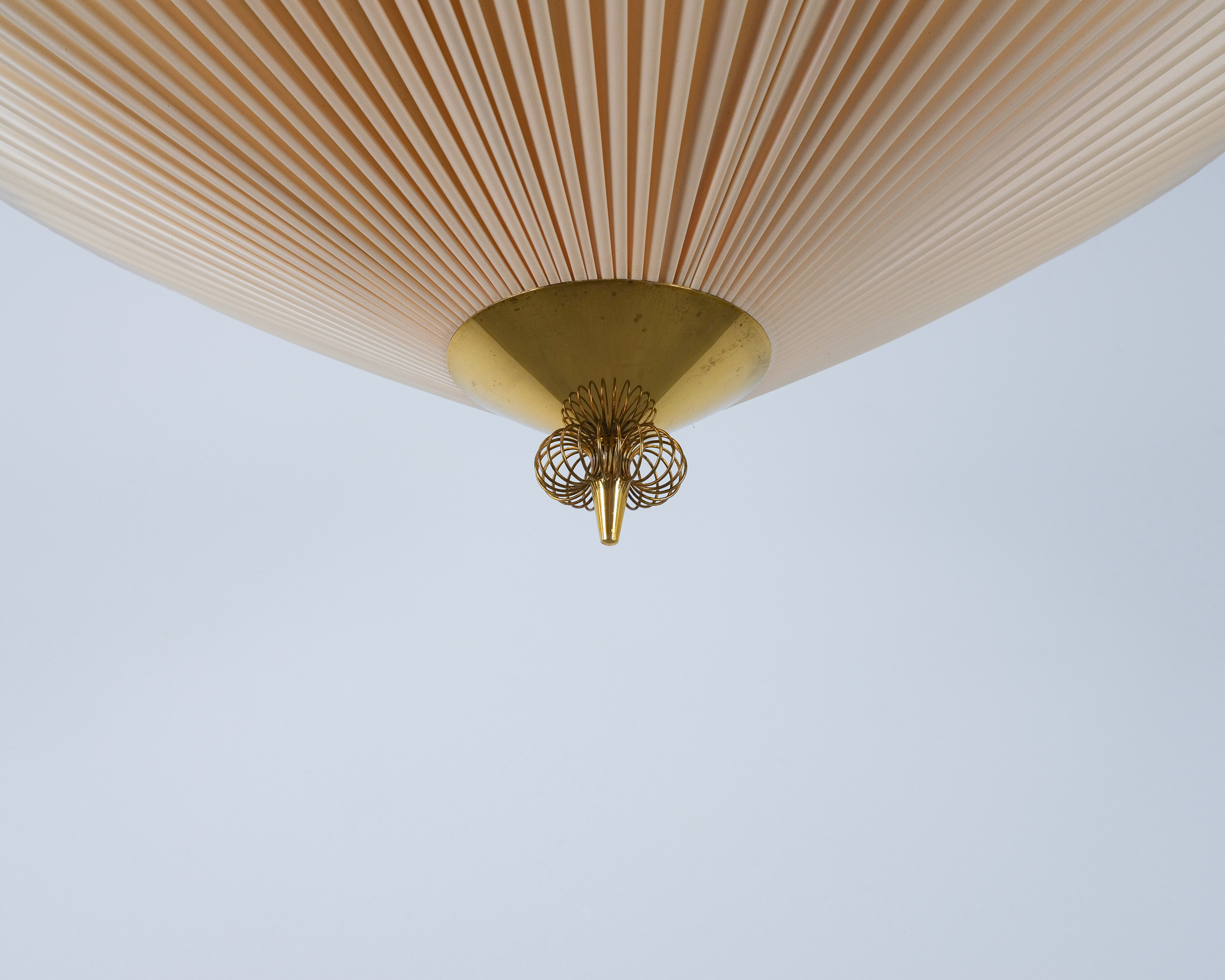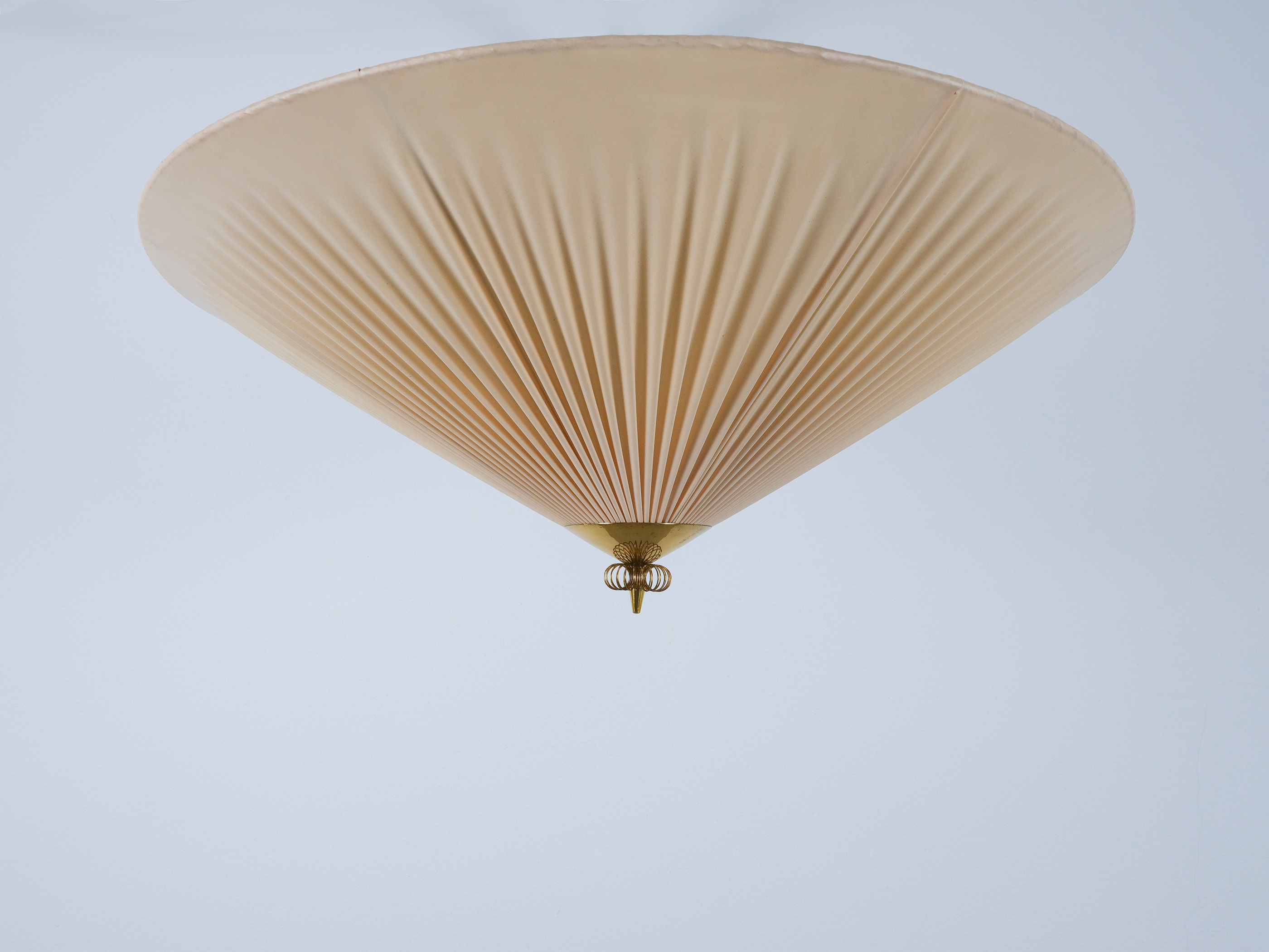 Paavo Tynell Flush Mount in Brass & vinyl fabric for PSO Pohjoismainen Sähkö Oy, circa 1955, model 1076/8022, manufacturer's stamp (Pso)