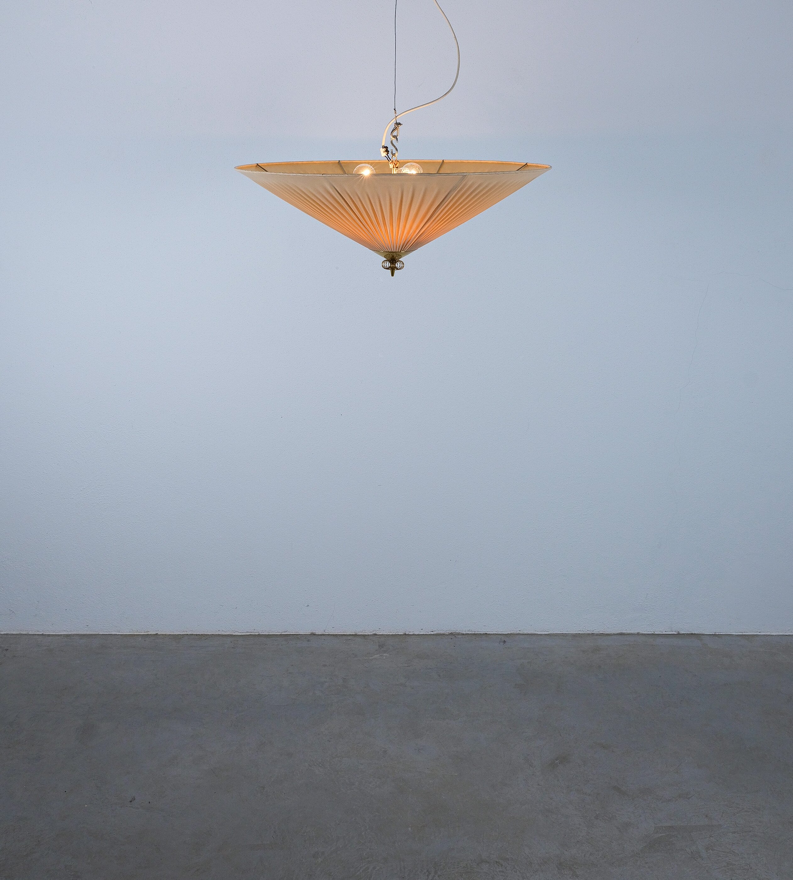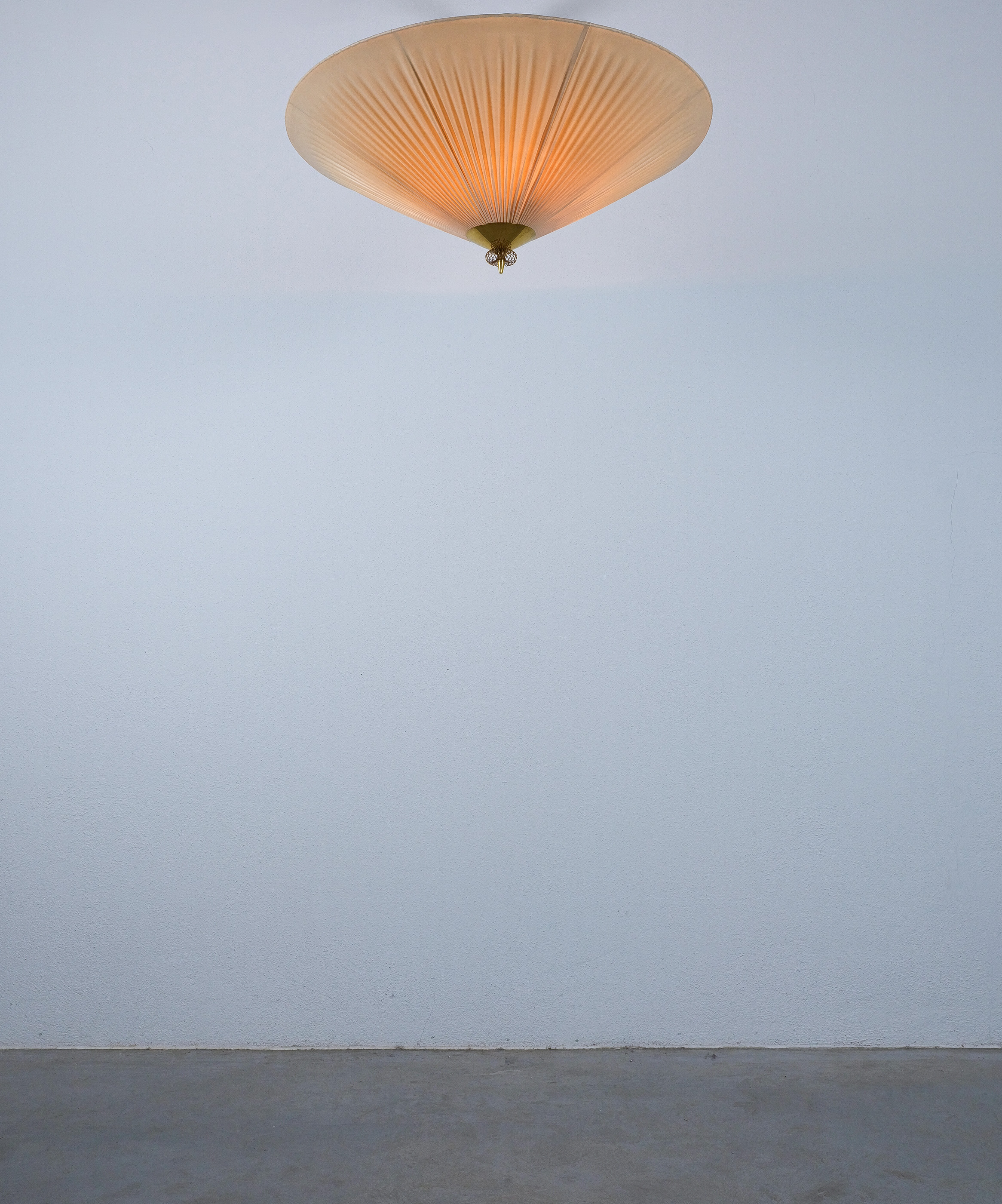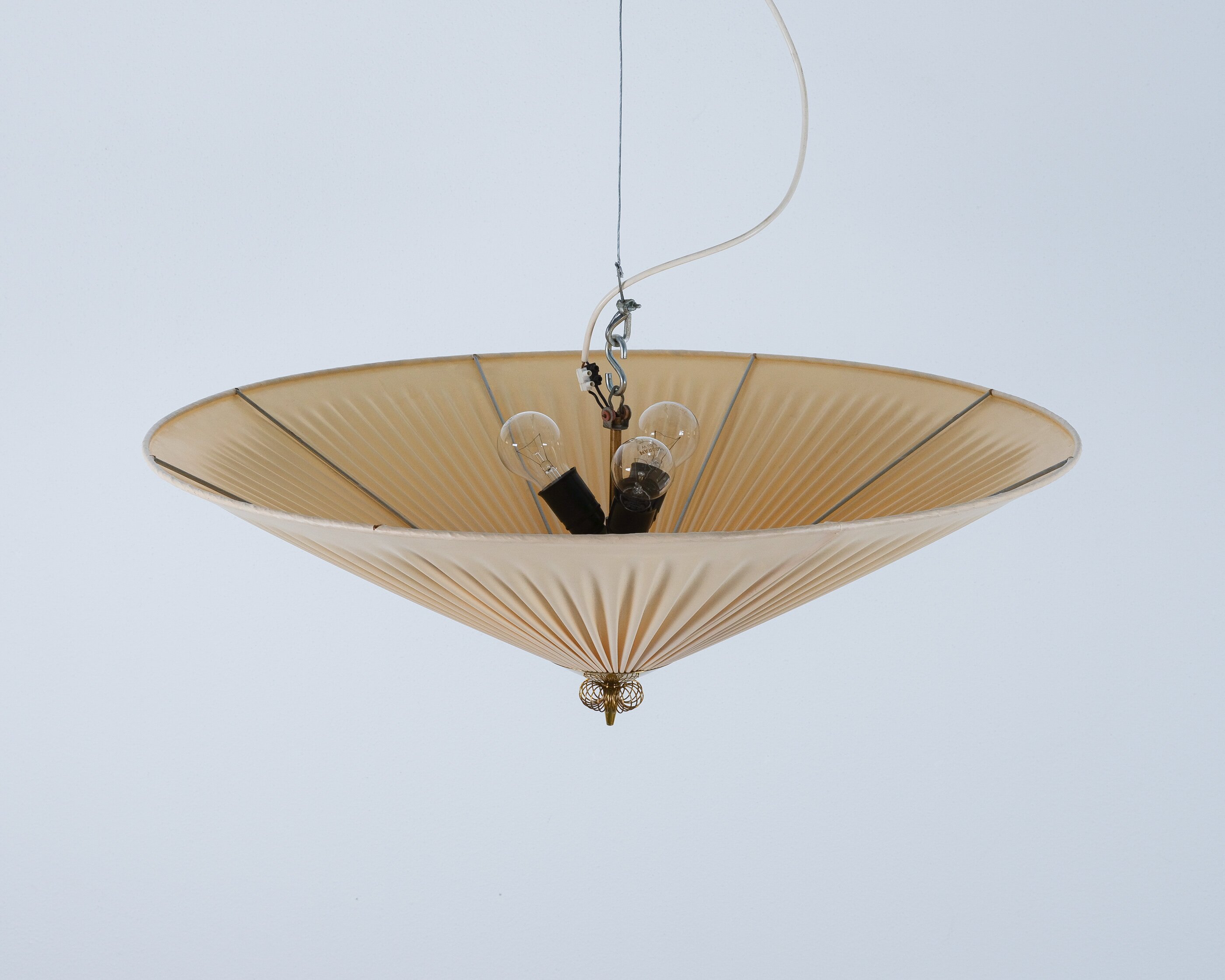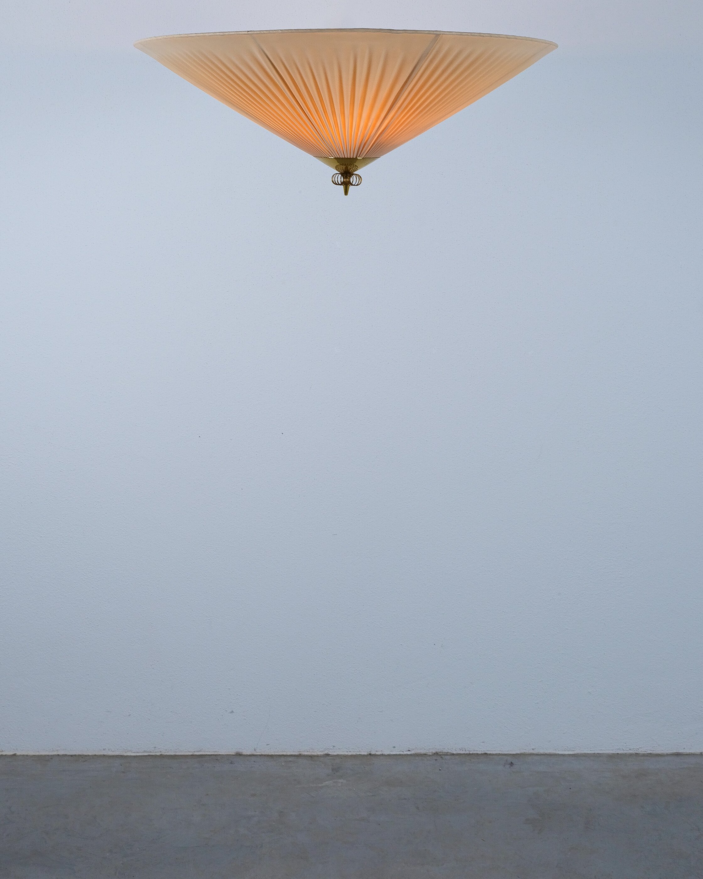 Paavo Tynell Flush Mount in Brass & vinyl fabric for PSO Pohjoismainen Sähkö Oy, circa 1955, model 1076/8022, manufacturer's stamp (Pso)