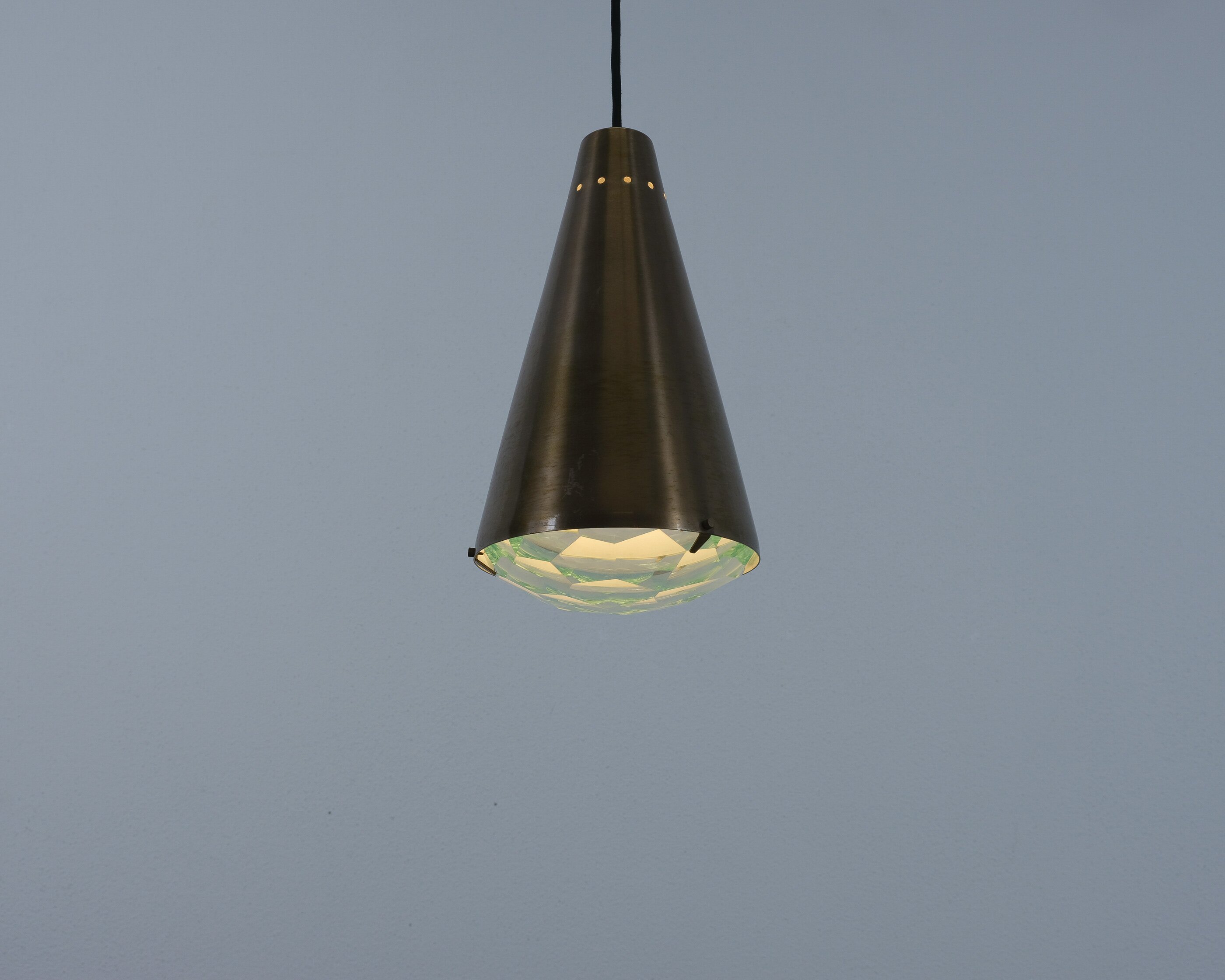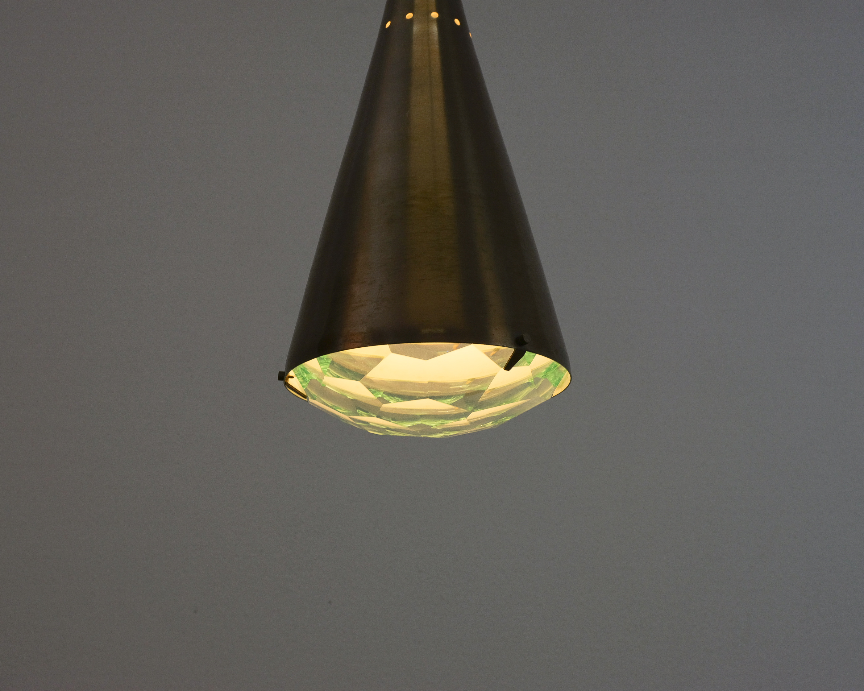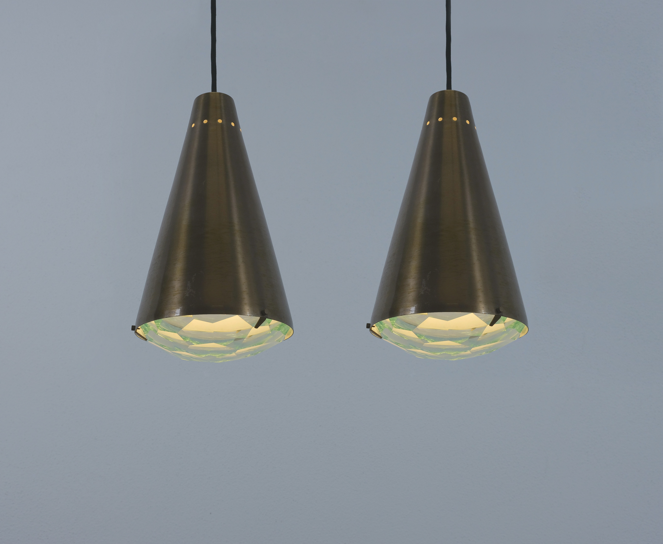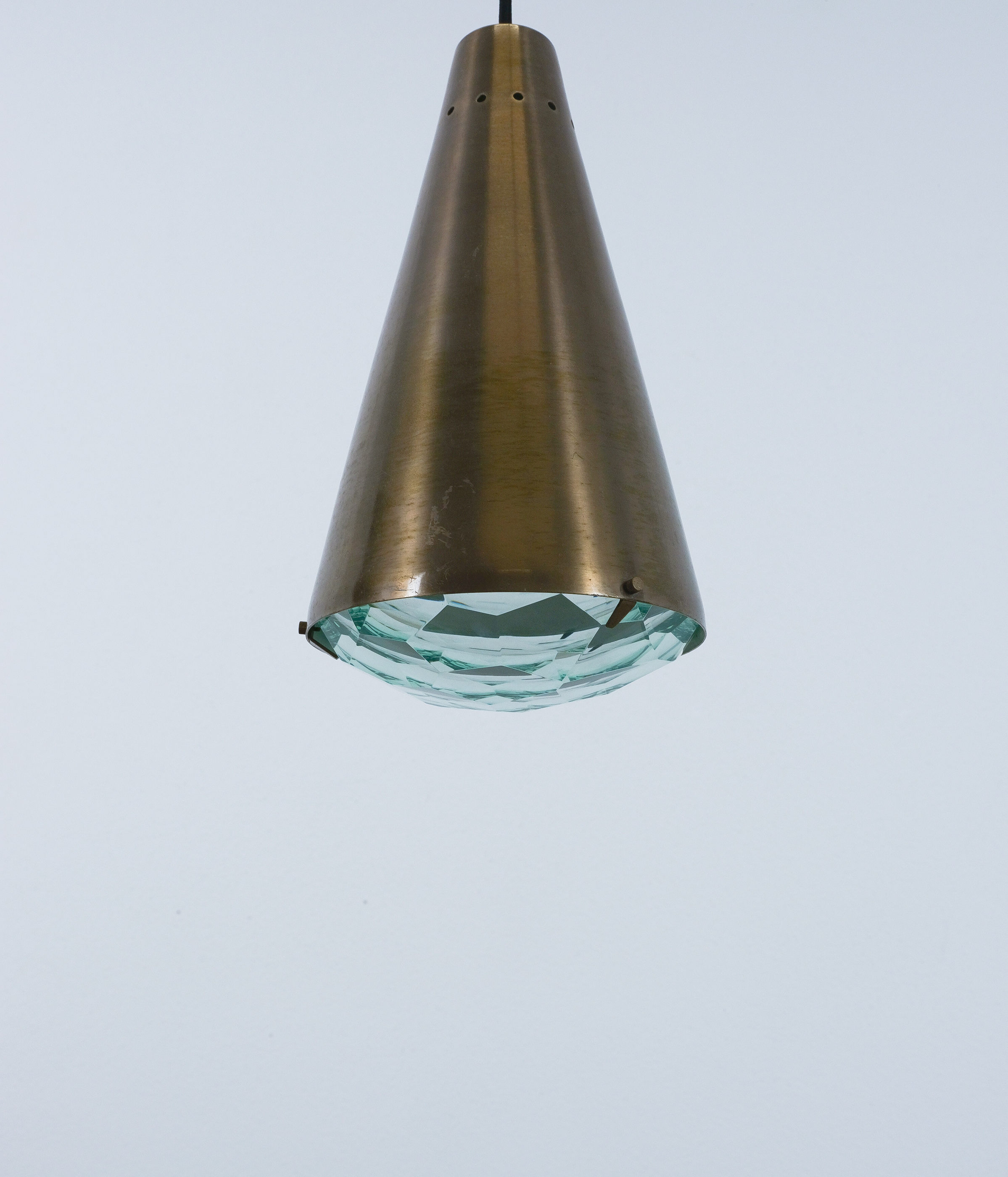 Original conic lanterns with a dark finish, mounted with faceted glass diffuser, suspended from a cord and canopy. Fontana Arte model 1995 (pictured in catalogue) The honeycomb glass is smoothly cut and polished. It's in great condition with no flaws to the glass, the patina we have left of course as it is part of the design and appeal. It was gently cleaned and has been newly rewired. Good original condition with no chips or cracks to the glass, original patina to the brass. Overall height is 44" but can easily be altered. We added a new cable, black cord textile. One bulb (e26, 75-100W max).