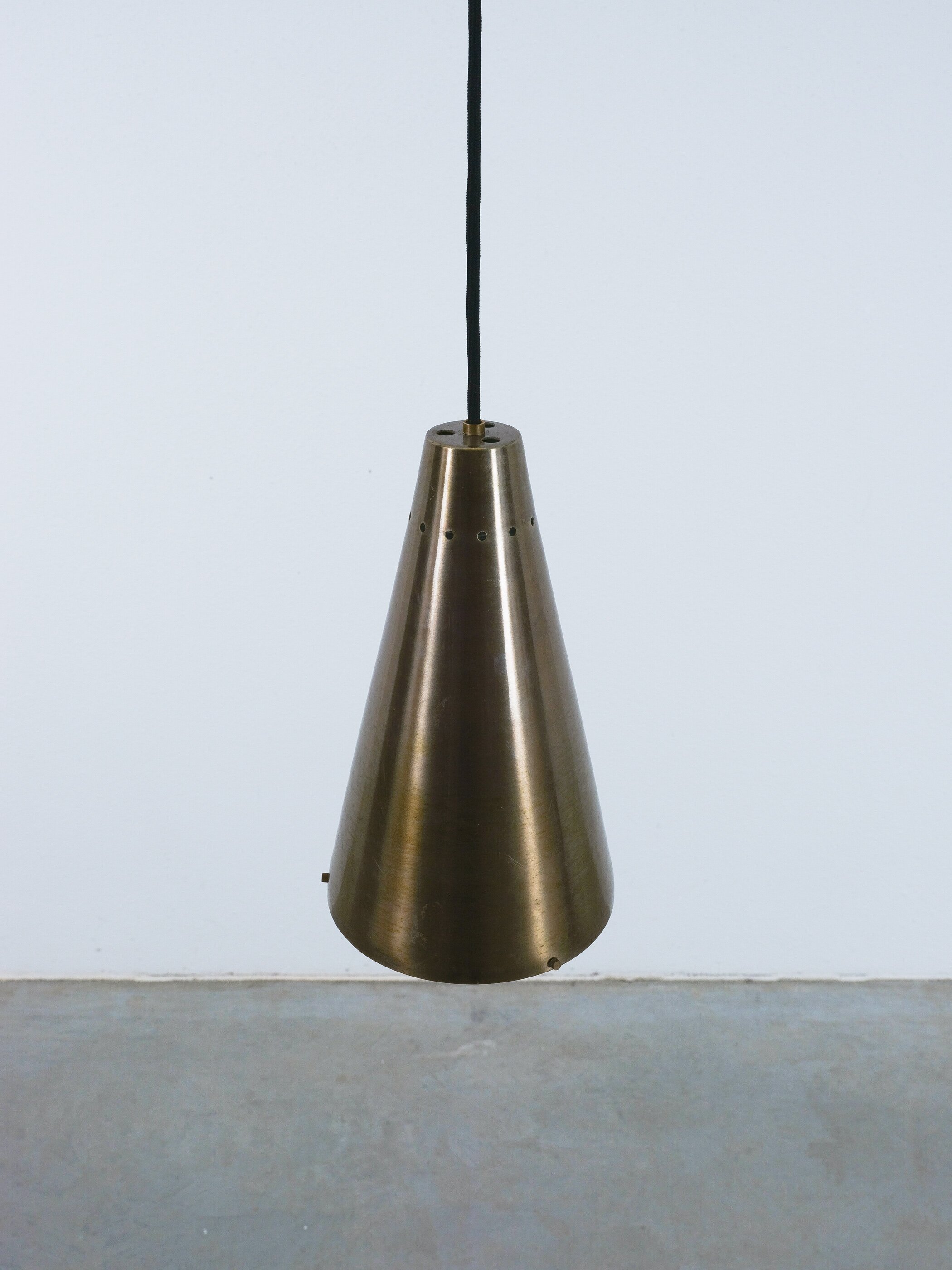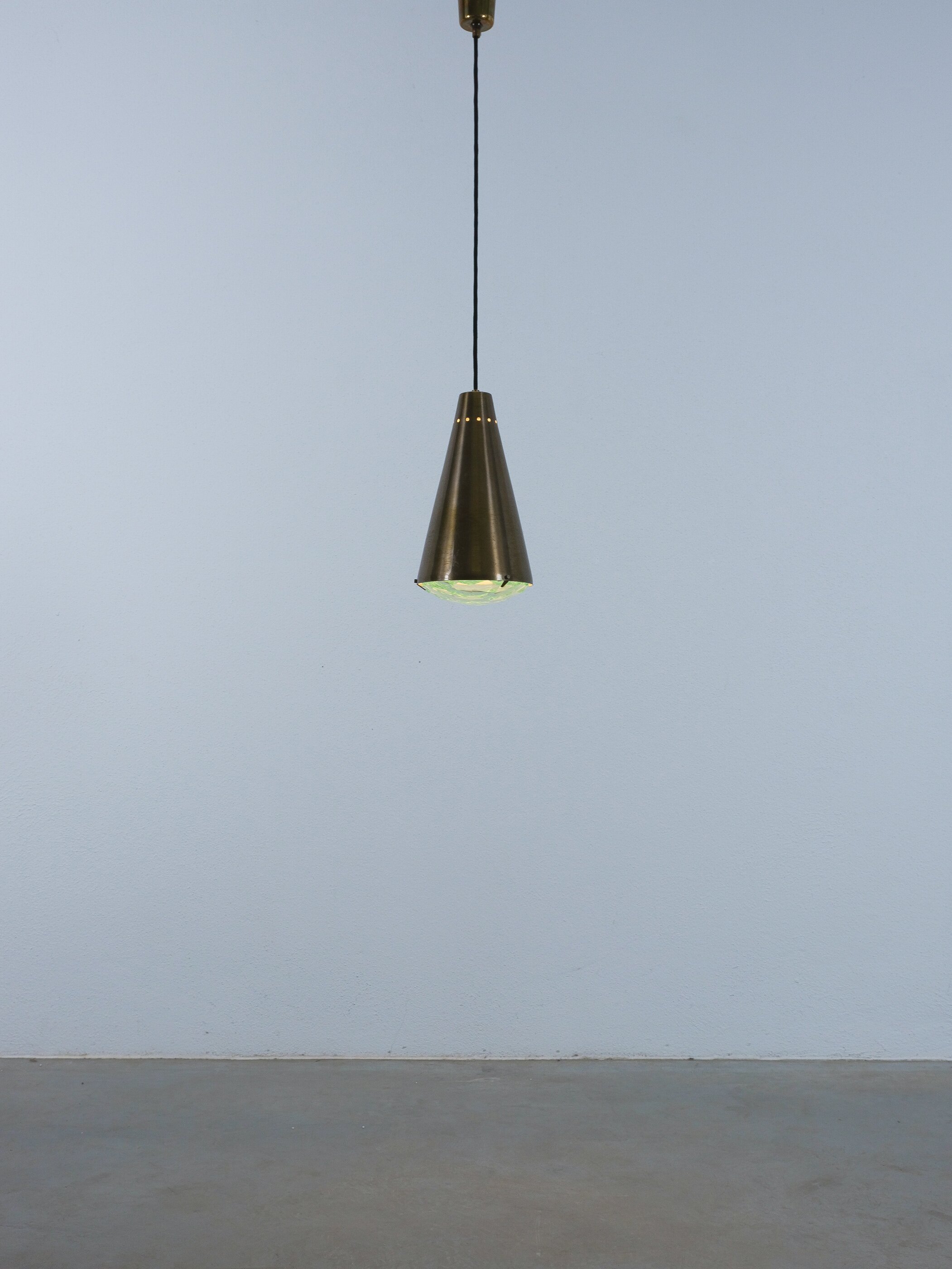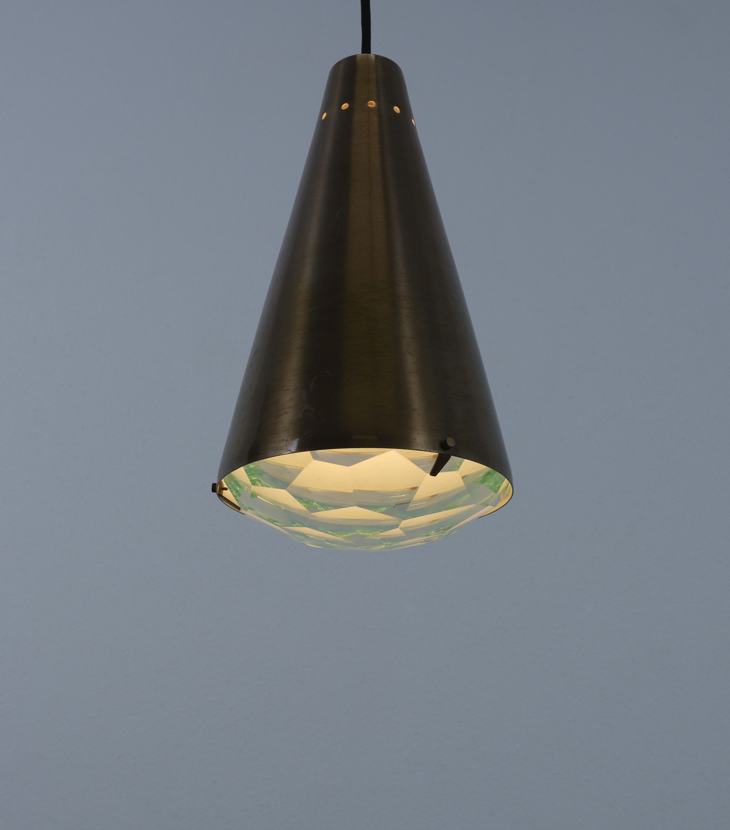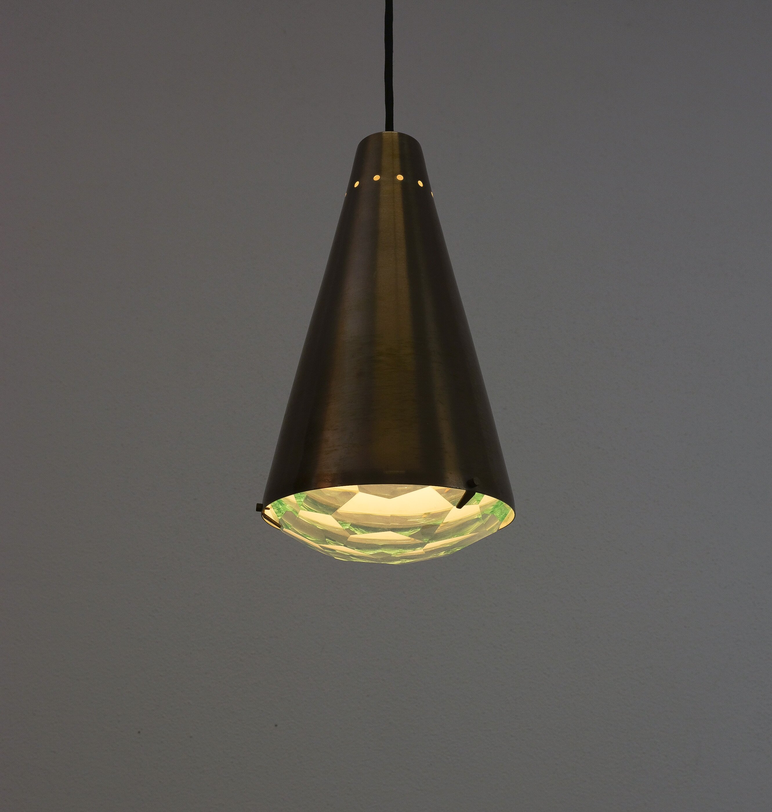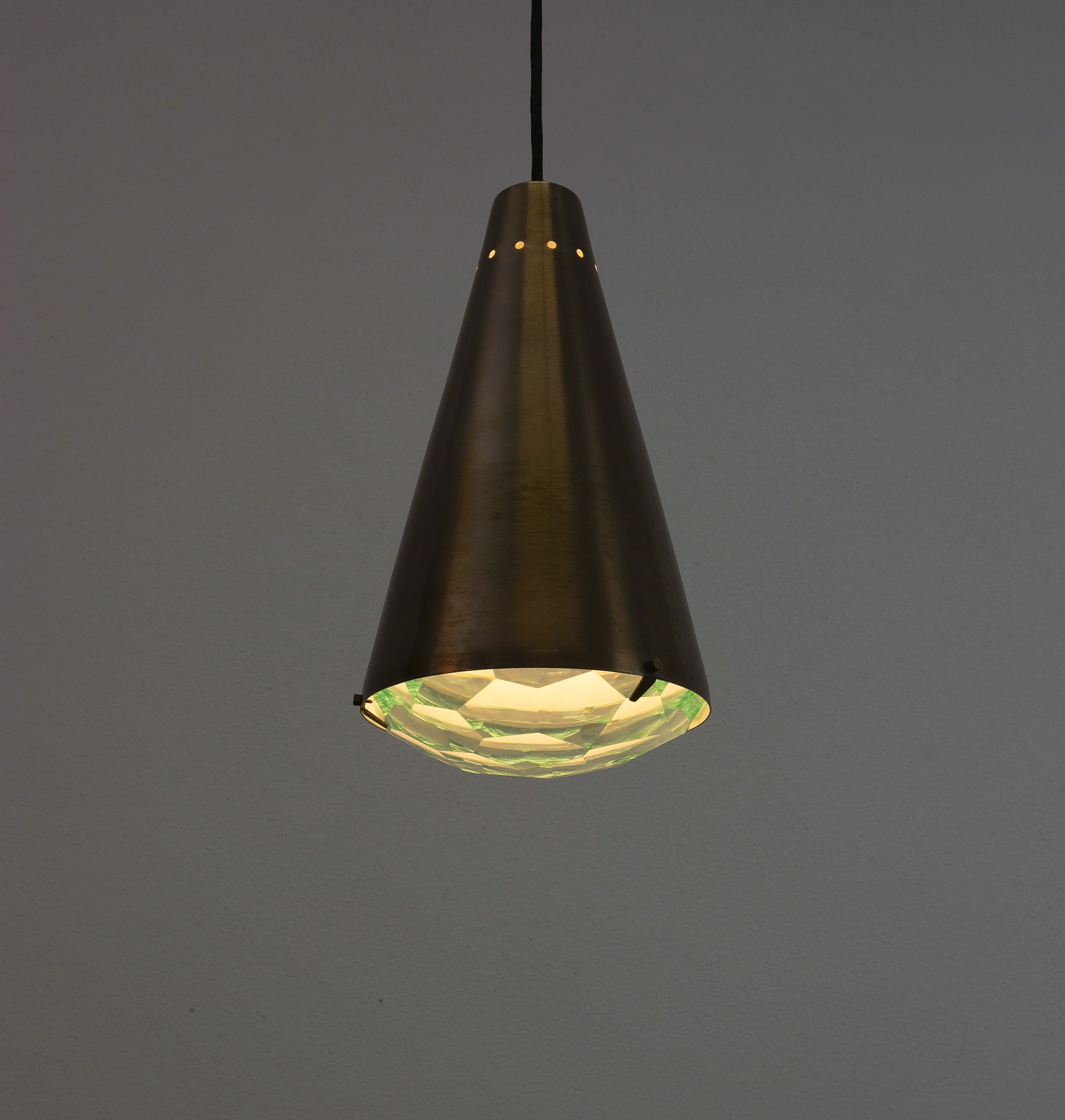 Original conic lanterns with a dark finish, mounted with faceted glass diffuser, suspended from a cord and canopy. Fontana Arte model 1995 (pictured in catalogue) The honeycomb glass is smoothly cut and polished. It's in great condition with no flaws to the glass, the patina we have left of course as it is part of the design and appeal. It was gently cleaned and has been newly rewired. Good original condition with no chips or cracks to the glass, original patina to the brass. Overall height is 44" but can easily be altered. We added a new cable, black cord textile. One bulb (e26, 75-100W max).
