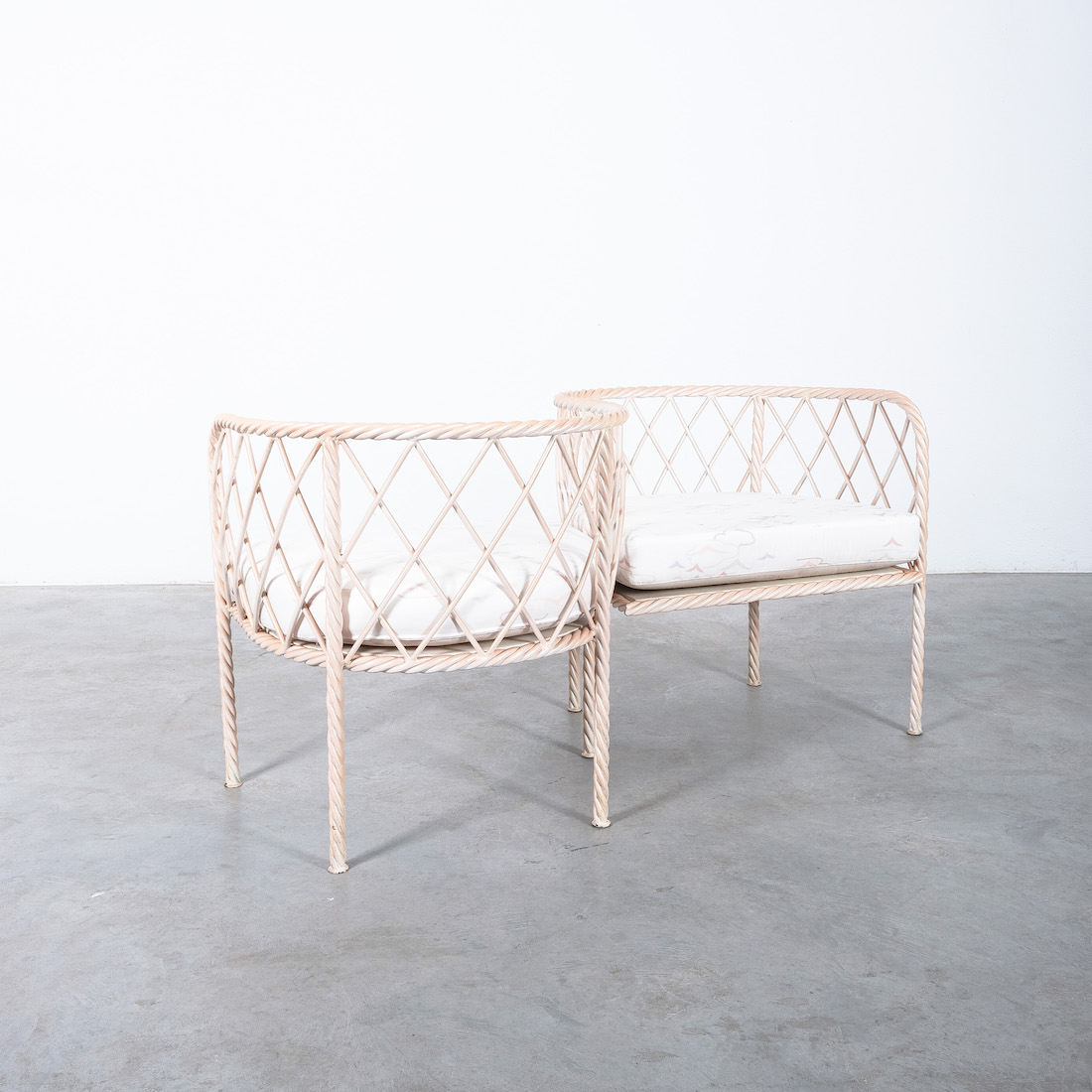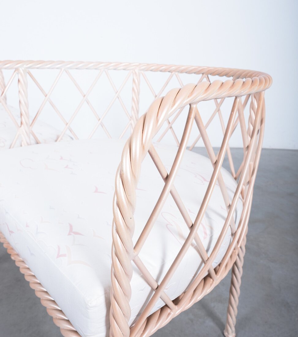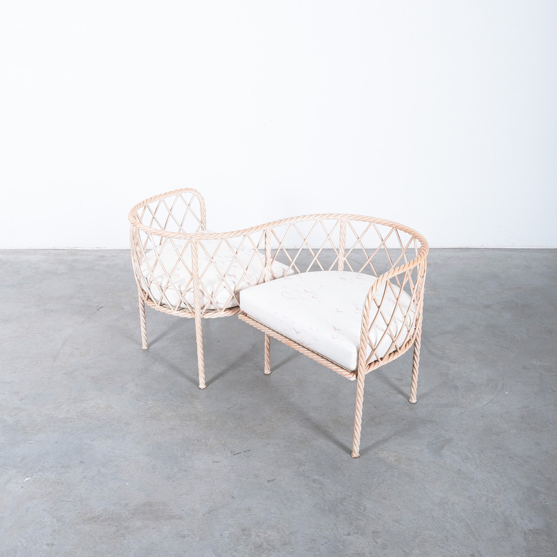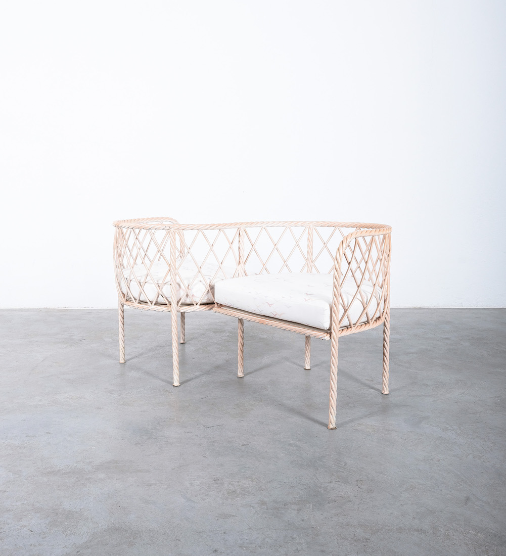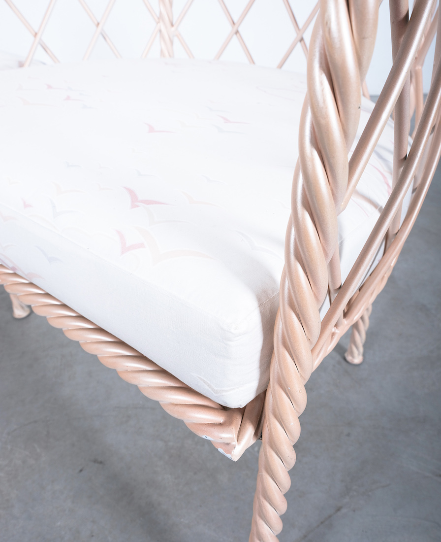 Lovely metallic rose enameled love-seat with twisted iron-work.