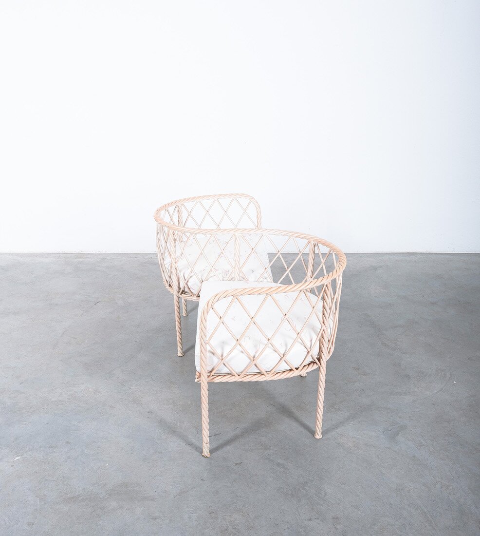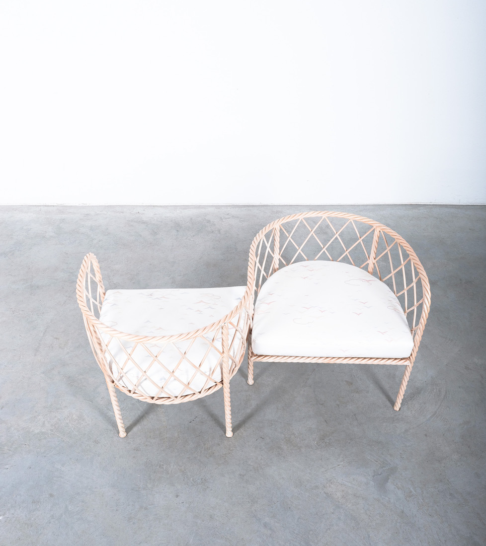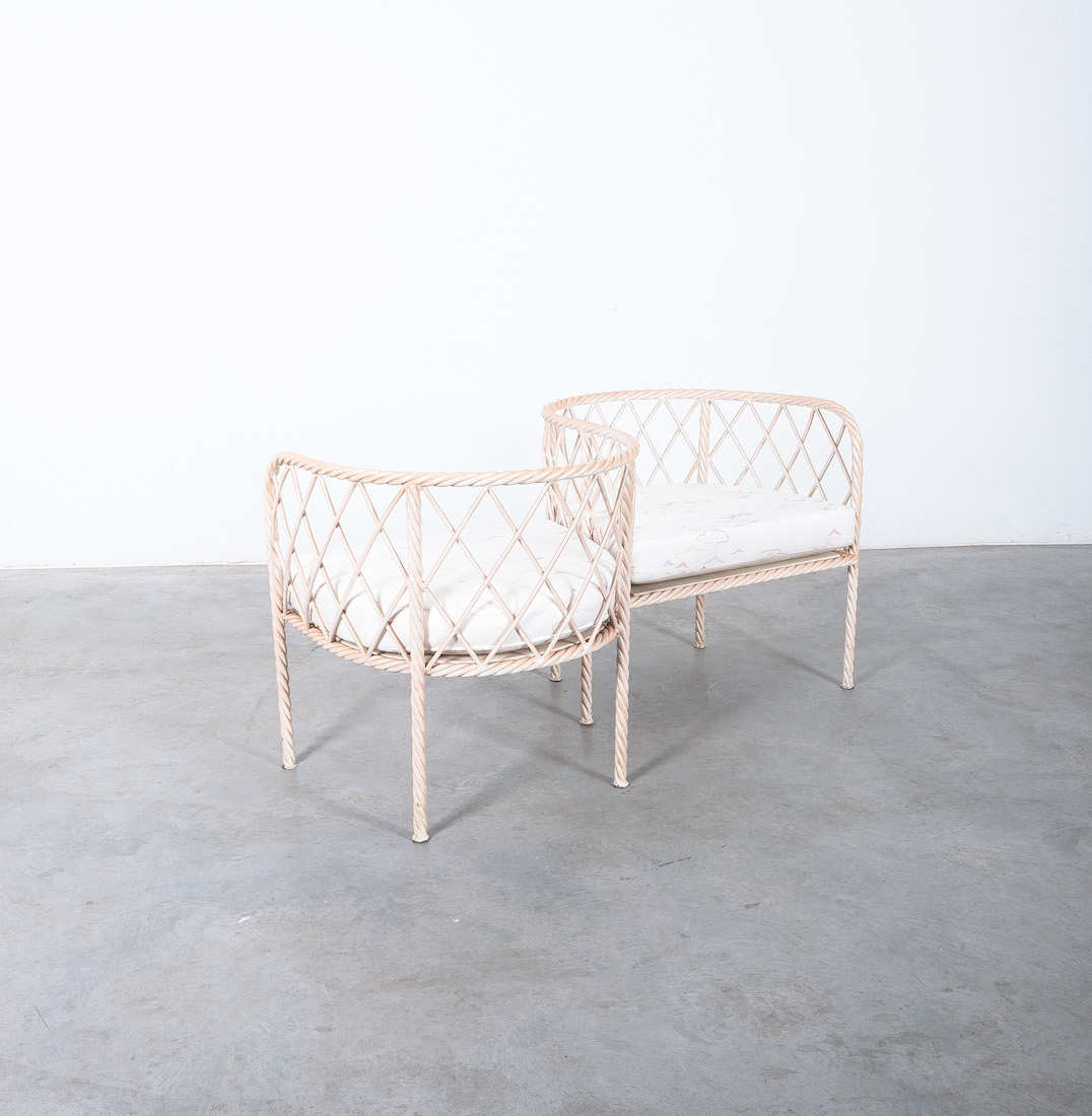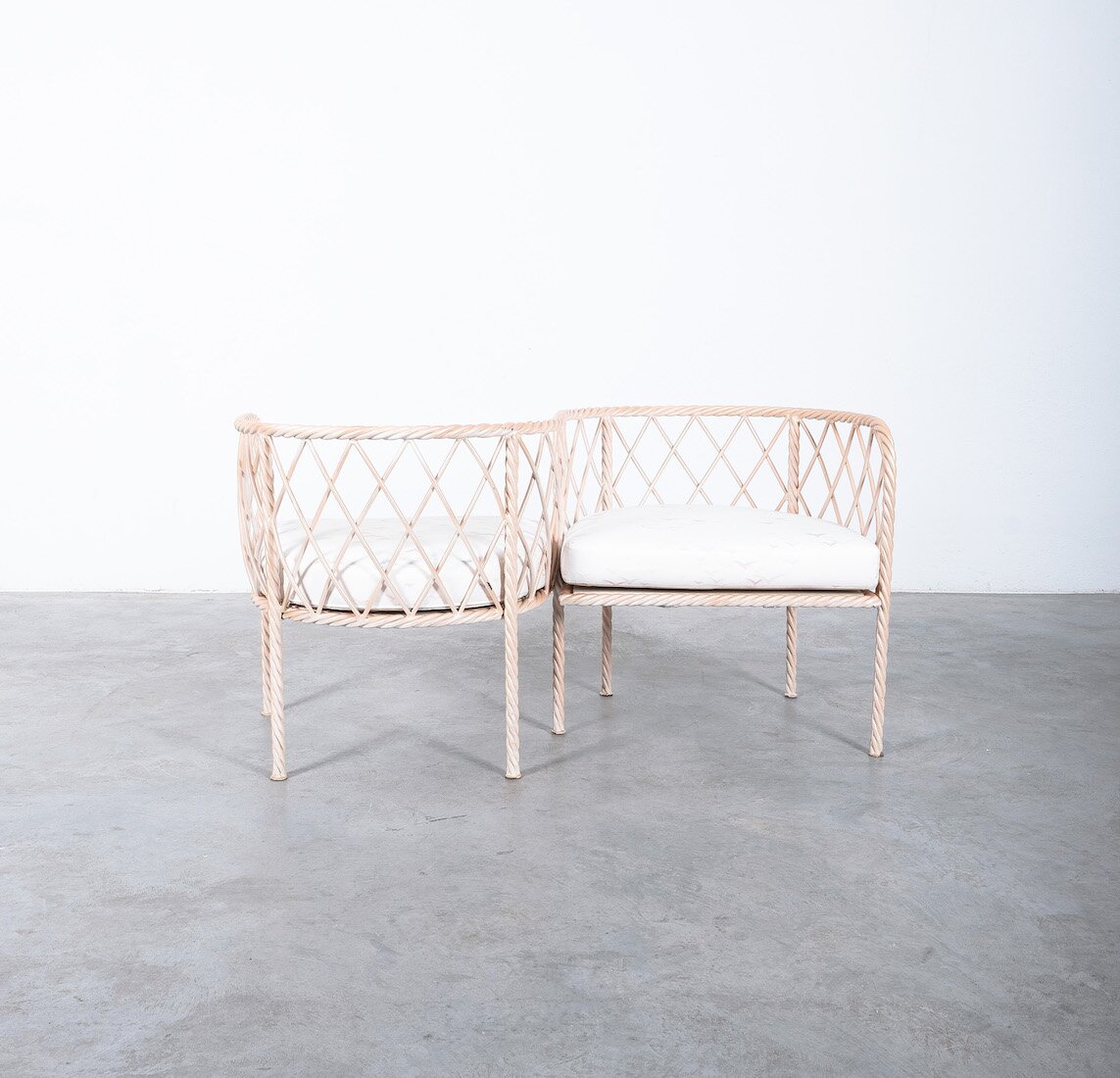 Lovely metallic rose enameled love-seat with twisted iron-work.