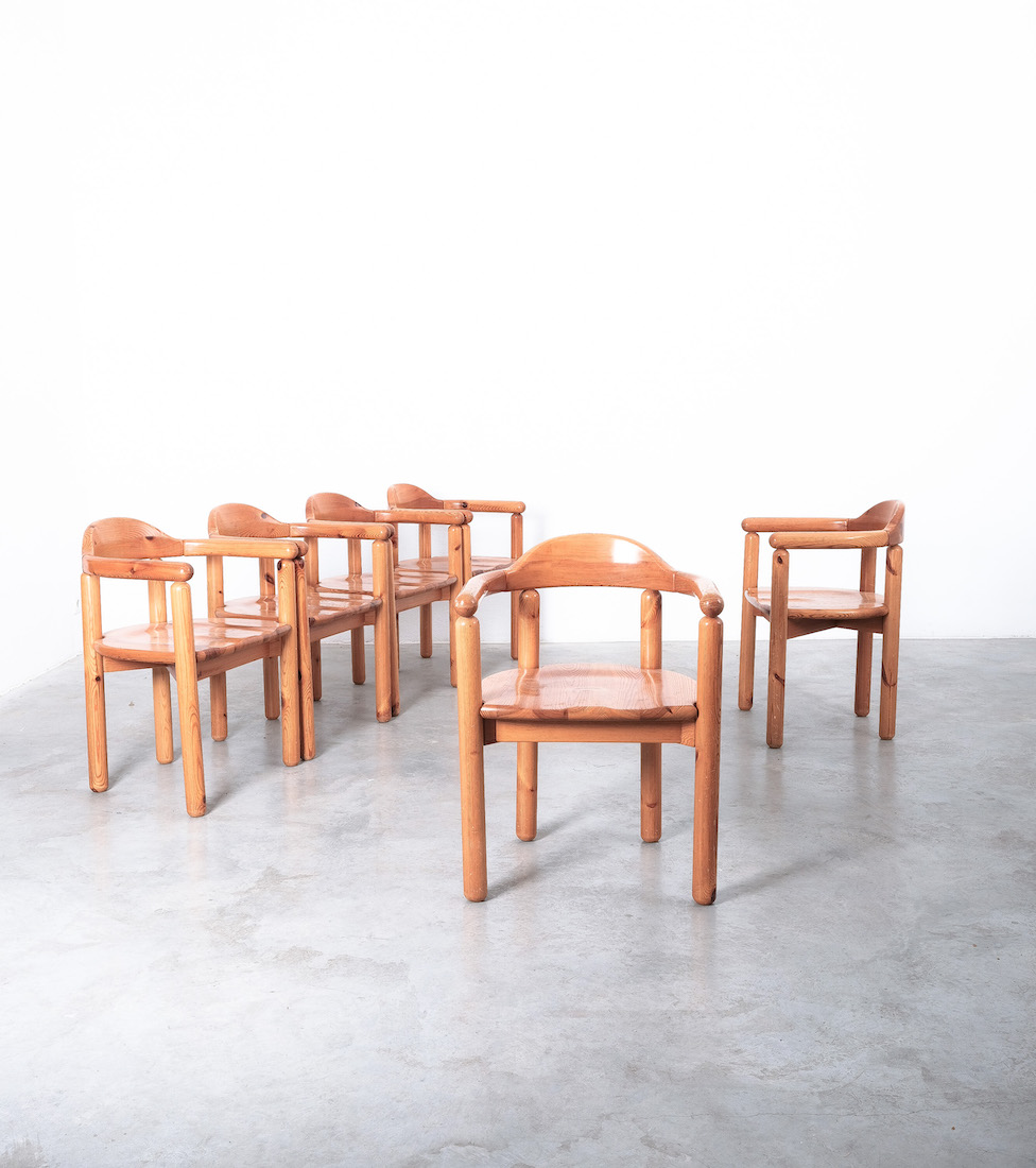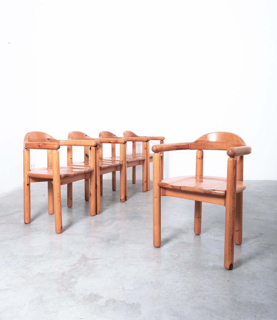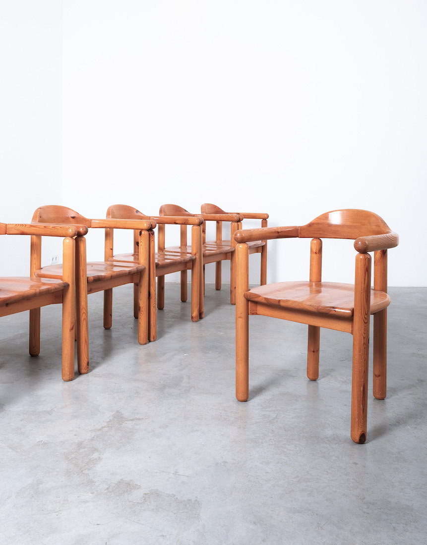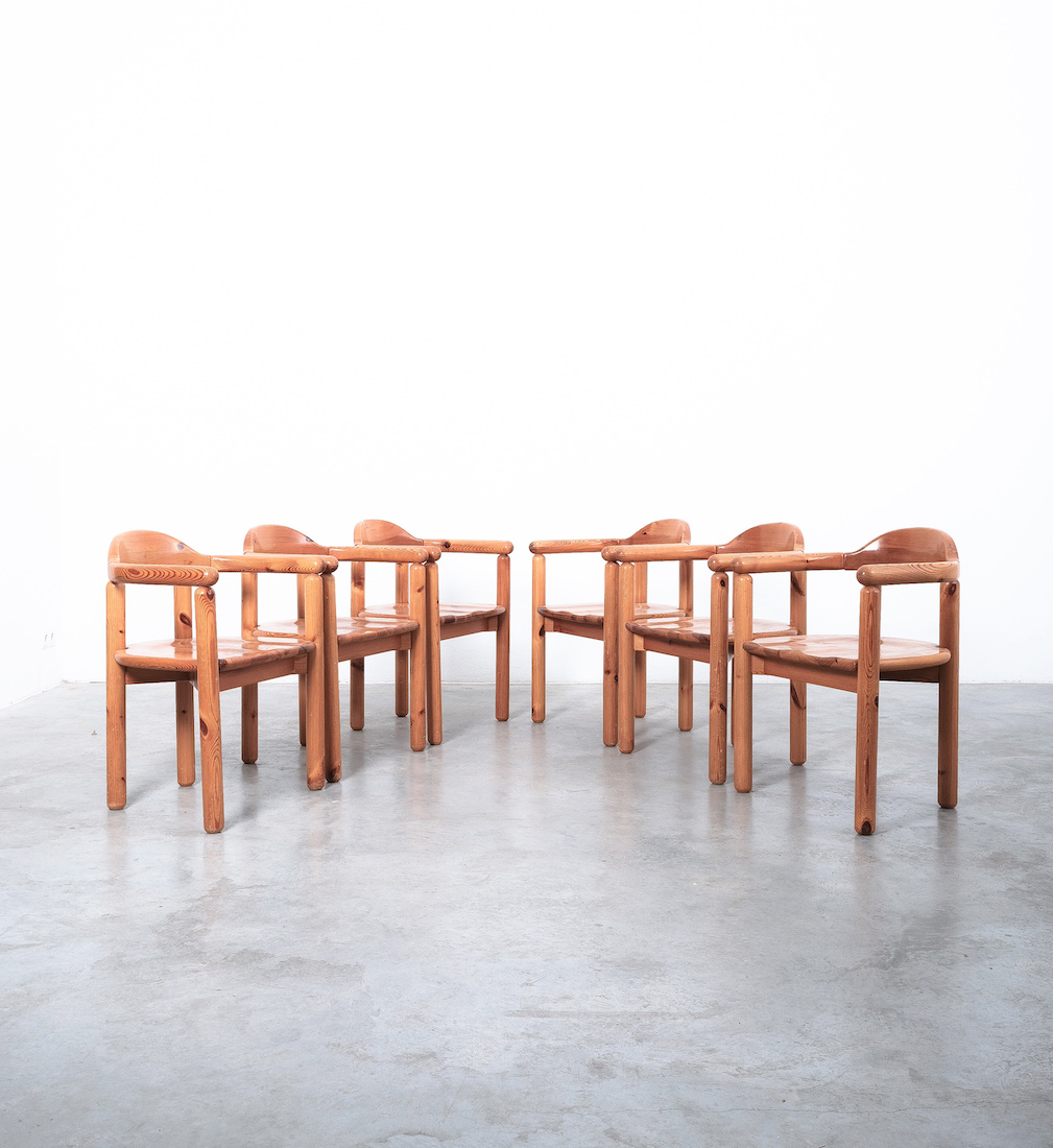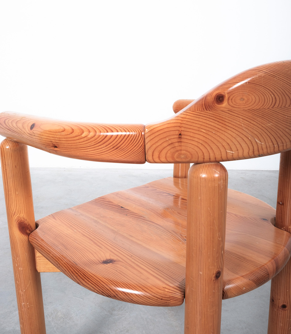 Solid wooden pine chairs by architect Rainer Daumiller with smooth rounded woodwork and sculpted seats.
