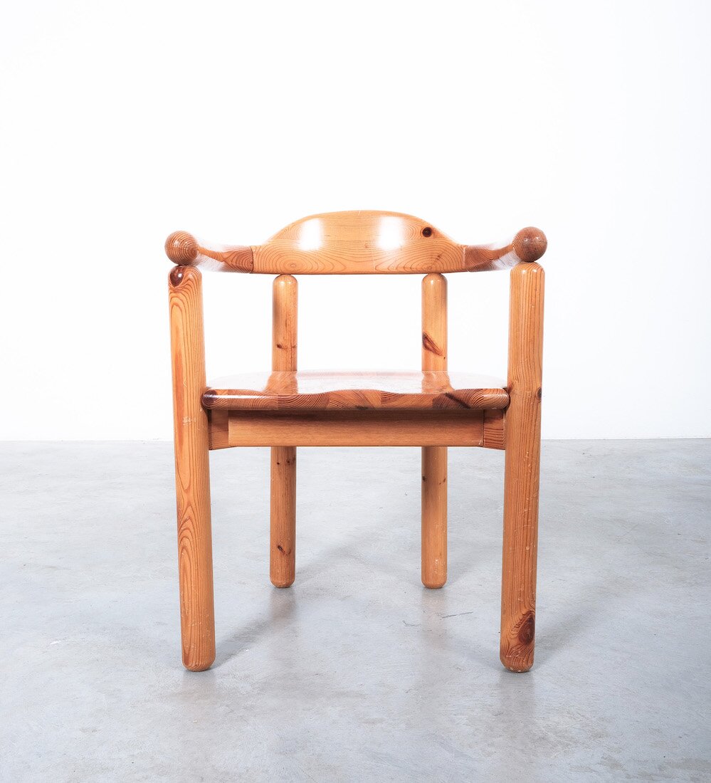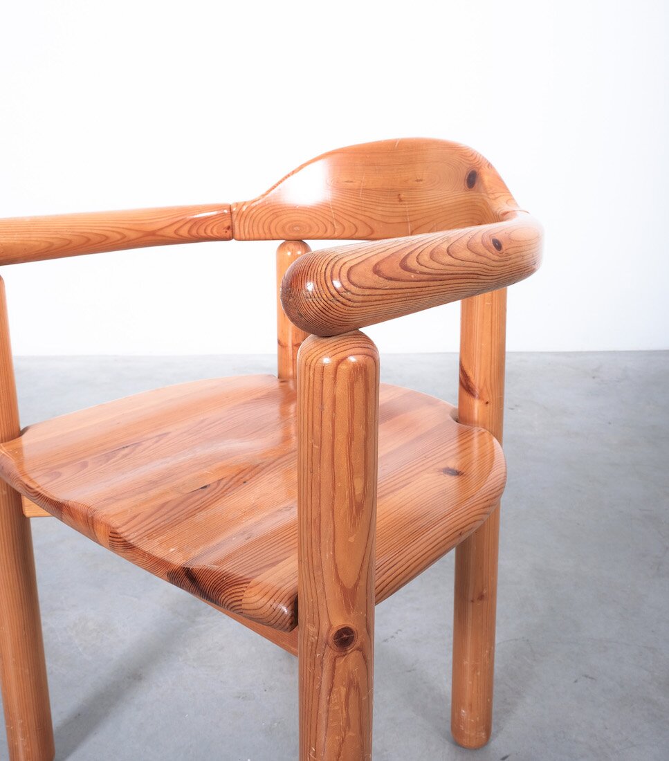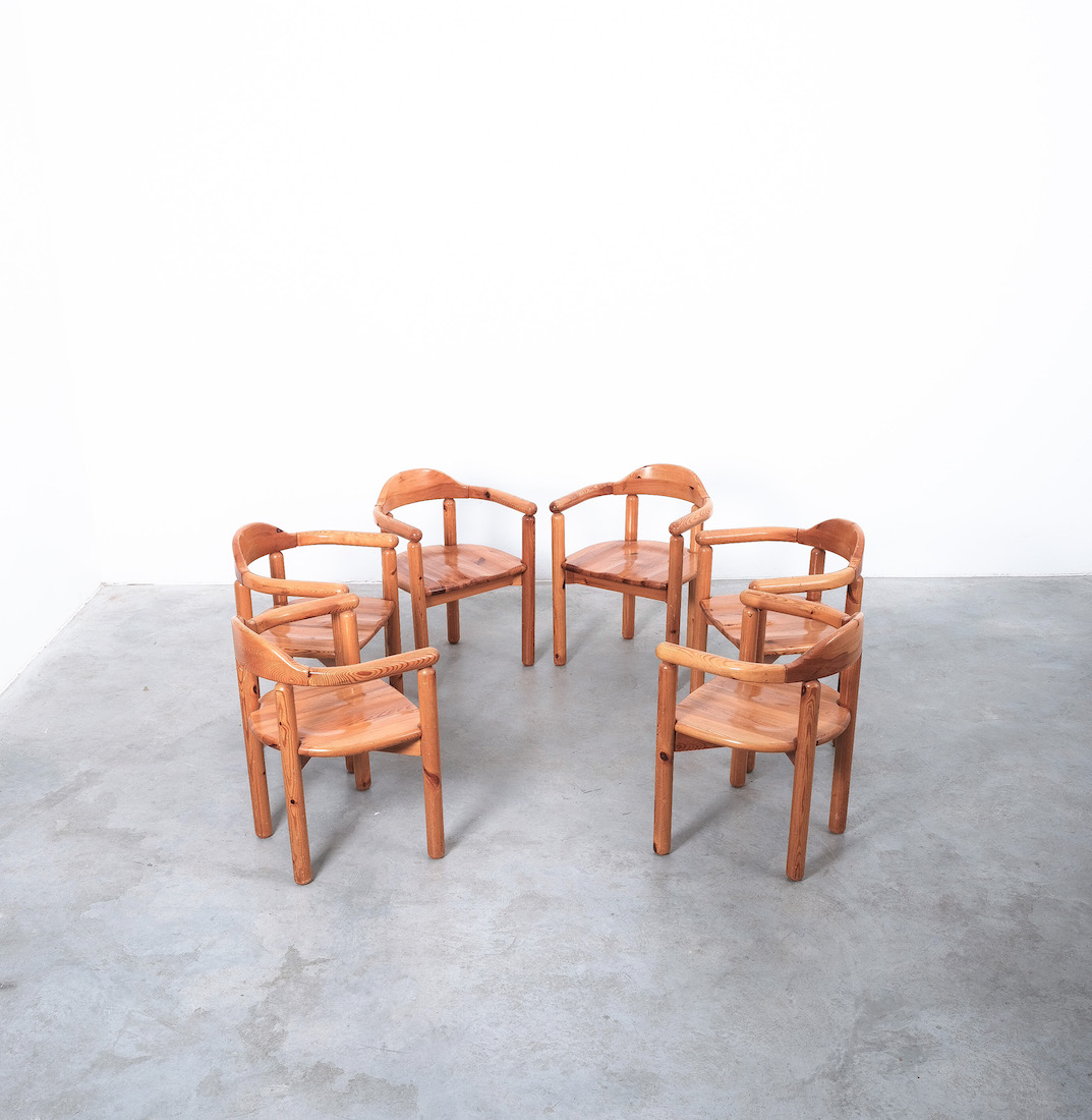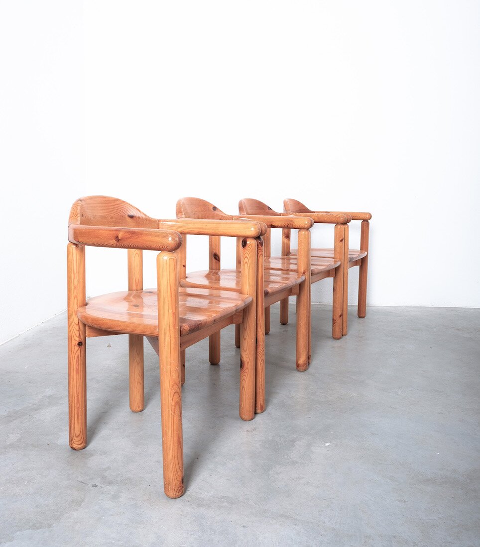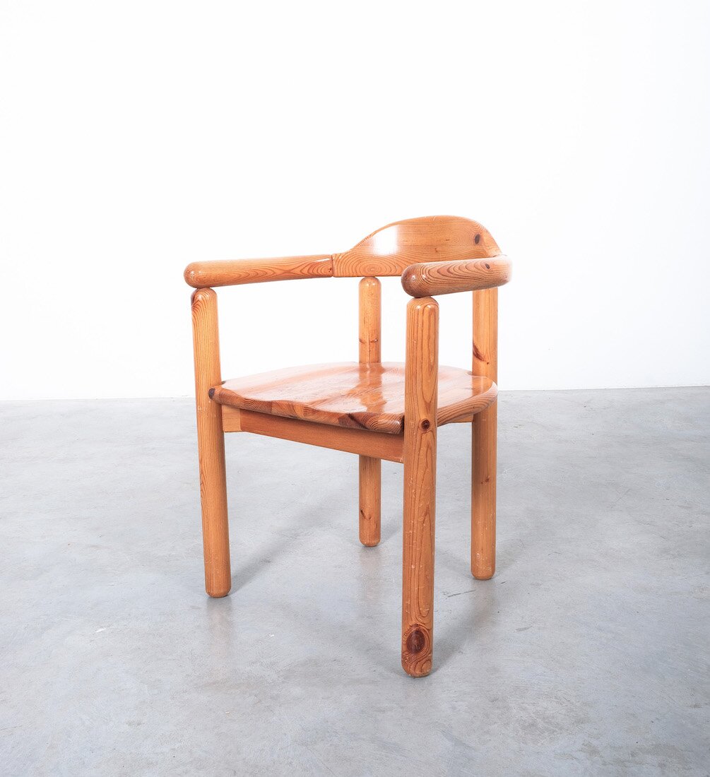 Solid wooden pine chairs by architect Rainer Daumiller with smooth rounded woodwork and sculpted seats.