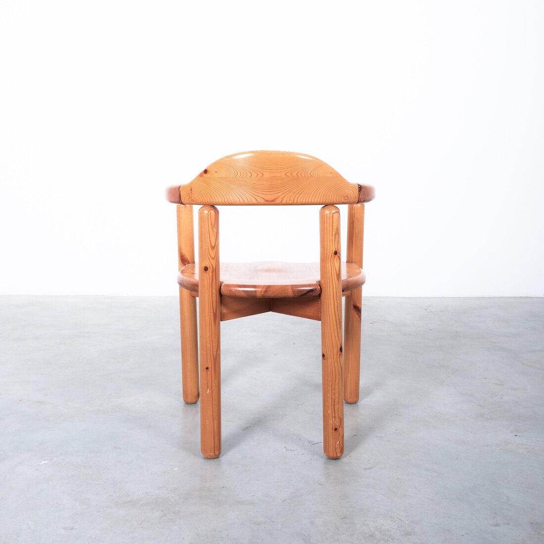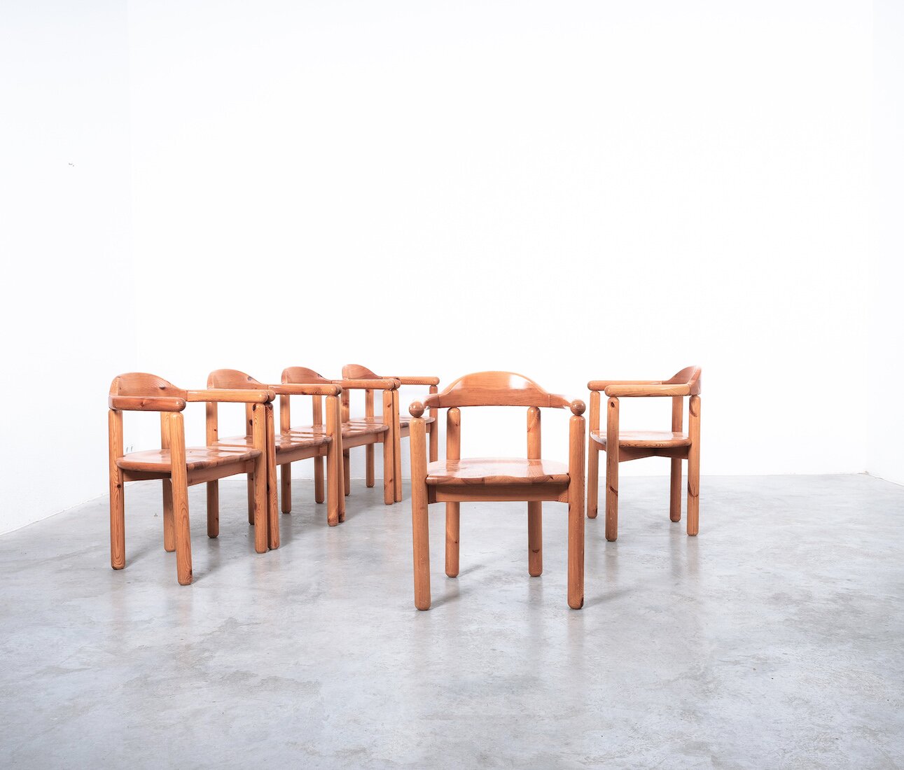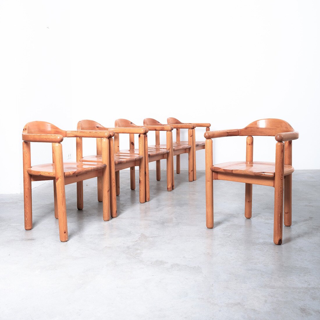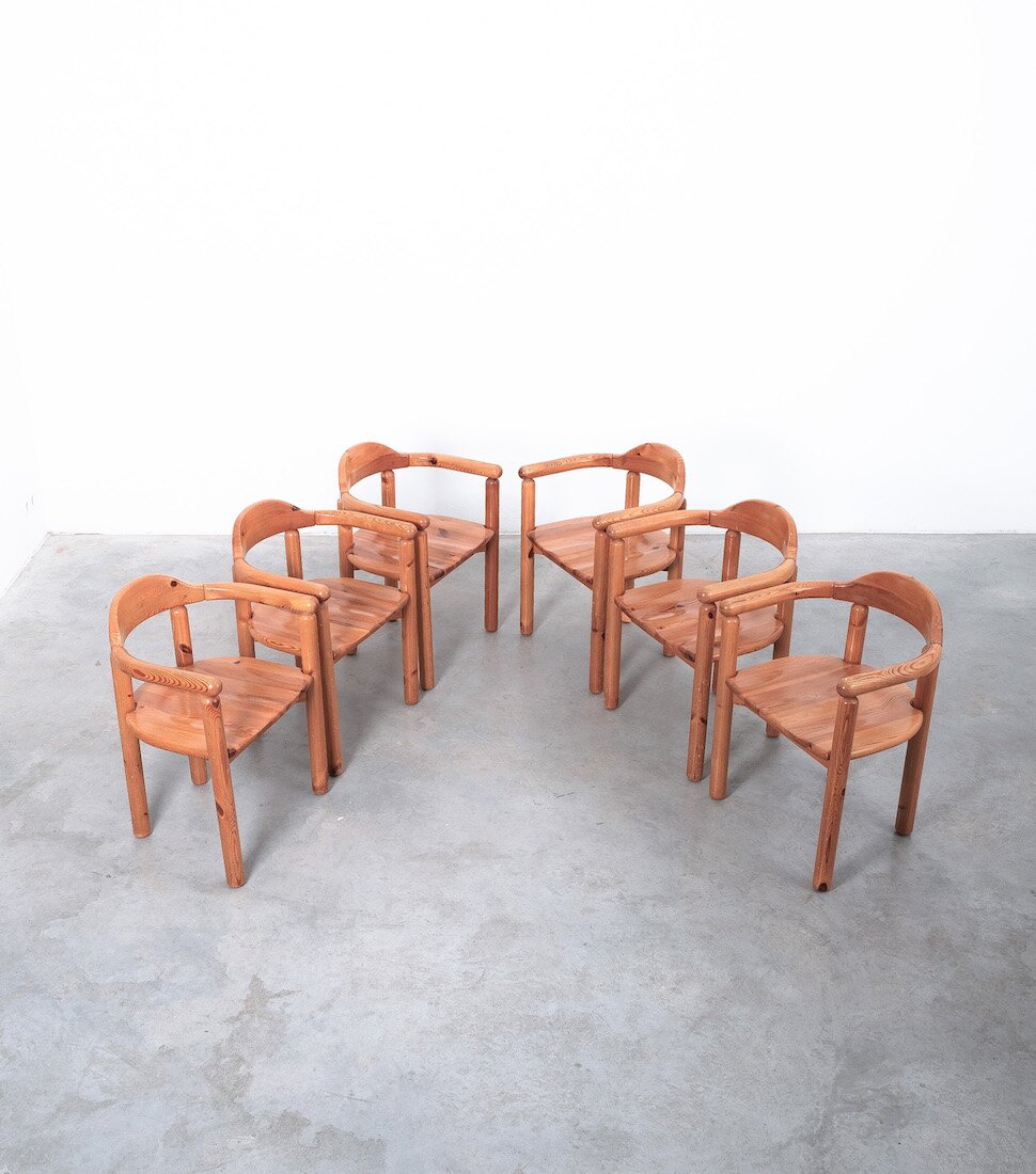 Solid wooden pine chairs by architect Rainer Daumiller with smooth rounded woodwork and sculpted seats.