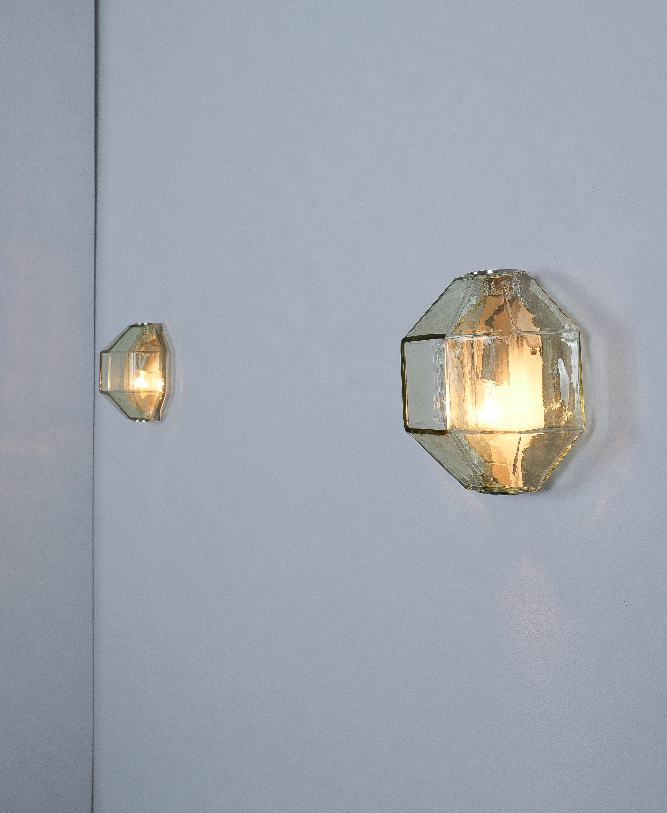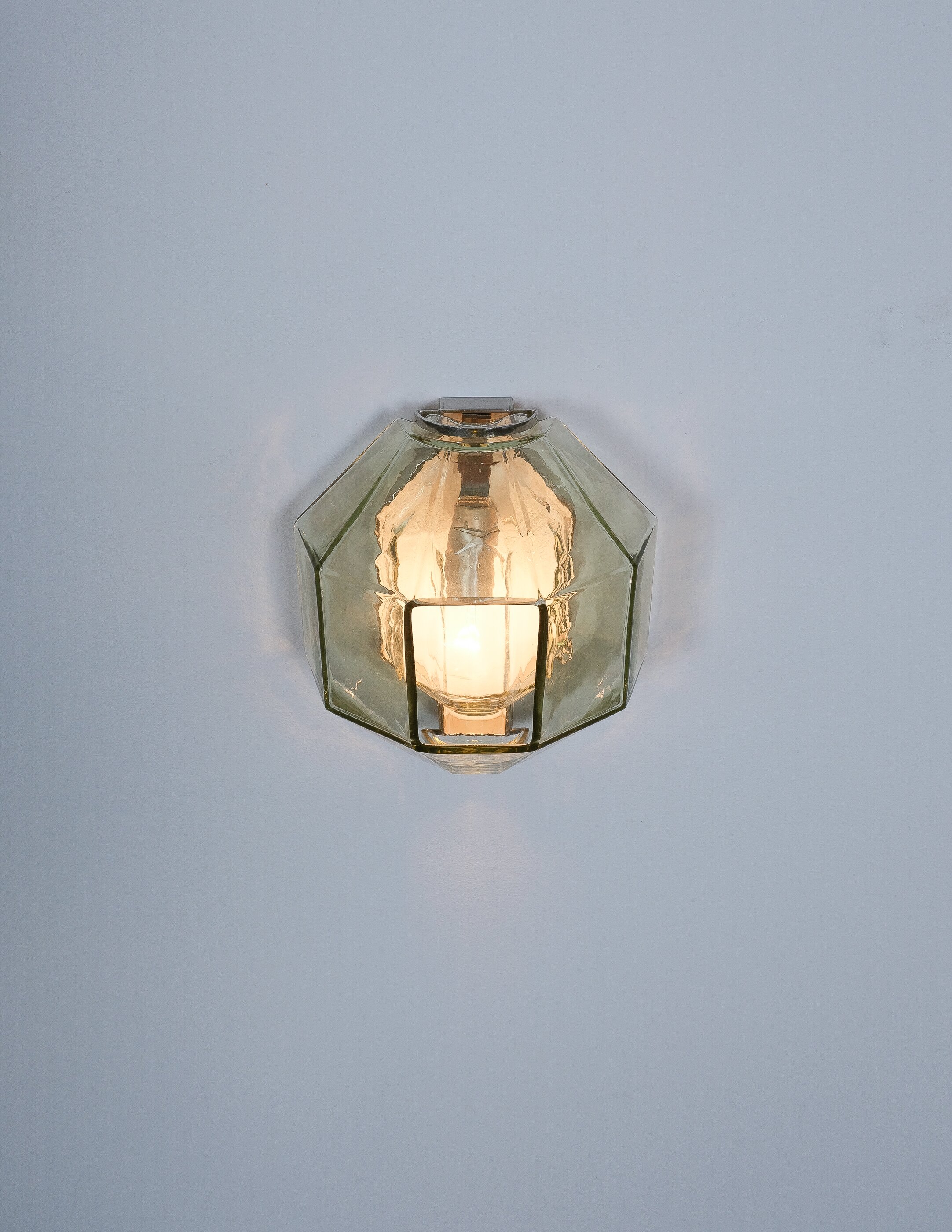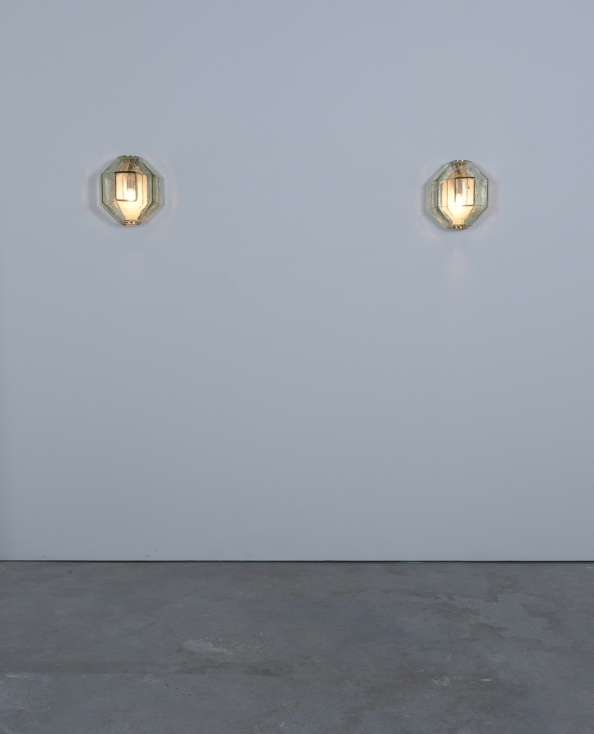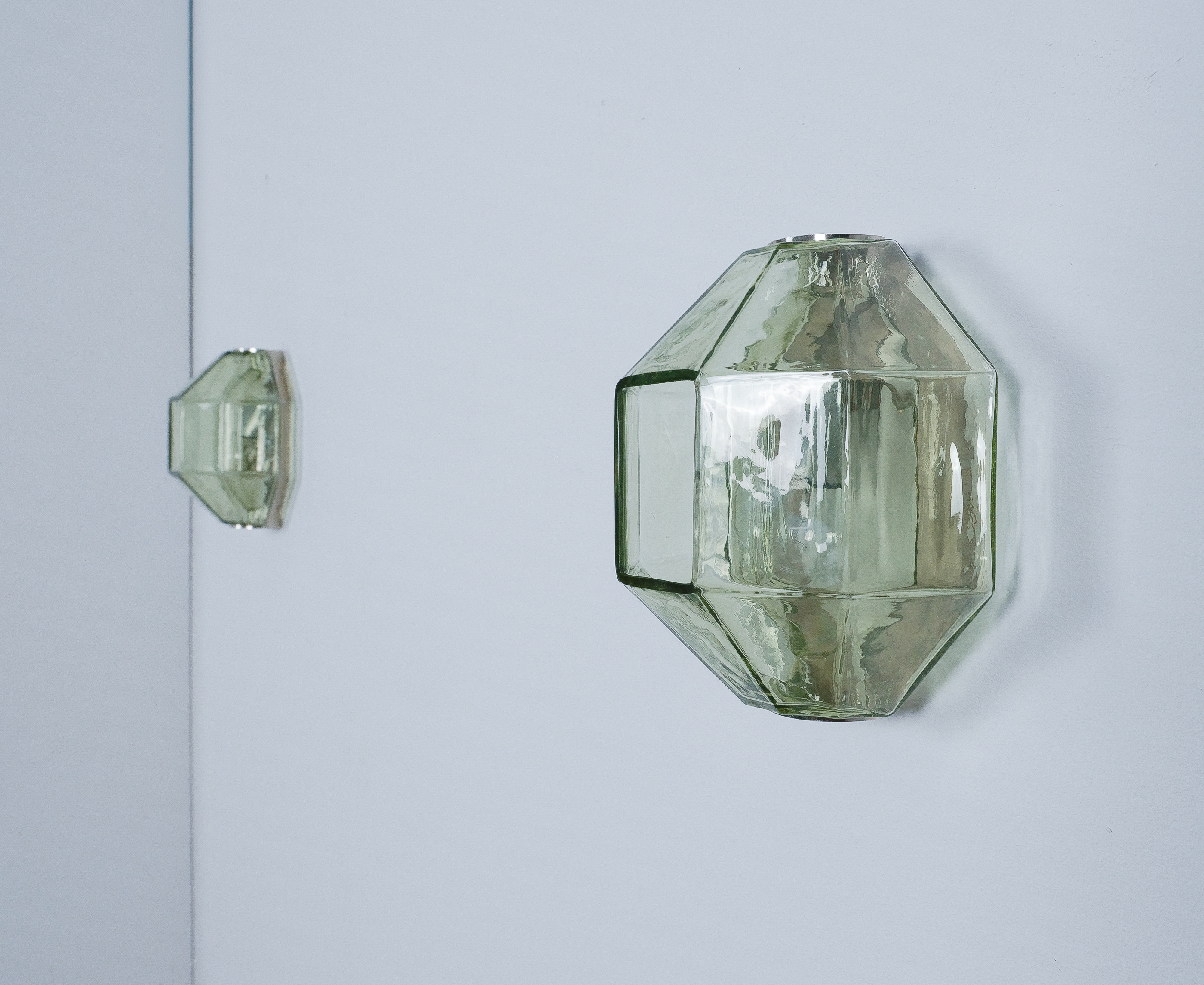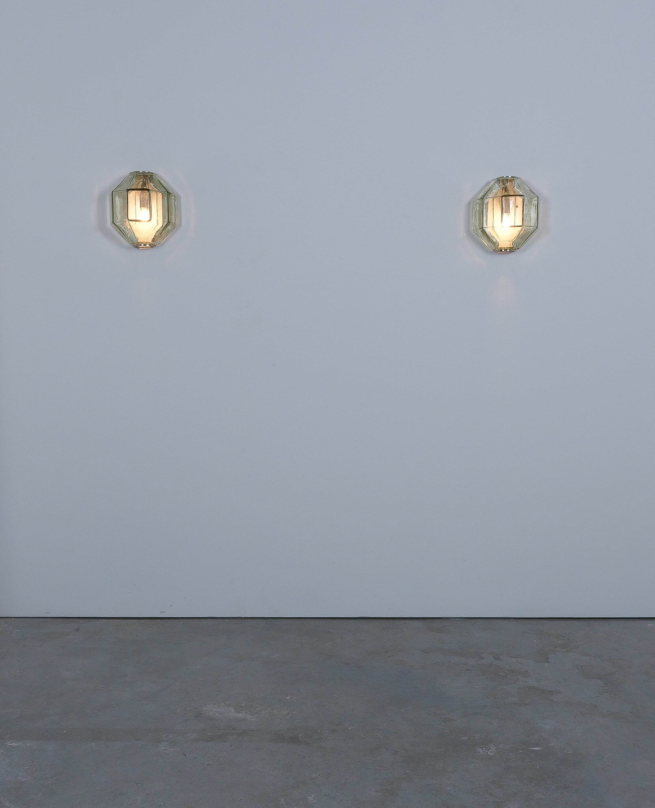 This sculptural ensemble exemplifies Vianello’s refined approach to mid-century lighting, where Venetian glassmaking traditions converge with a distinctly architectural sensibility. Each sconce is composed of a polygonal blown-glass element in a delicate light green tone with a subtle champagne inflection, its faceted geometry gently modulating the light and enhancing the material’s inherent luminosity. The glass bodies are secured between precisely articulated, nickeled metal brackets whose linear rigor provides a measured counterpoint to the organic vitality of the blown forms.