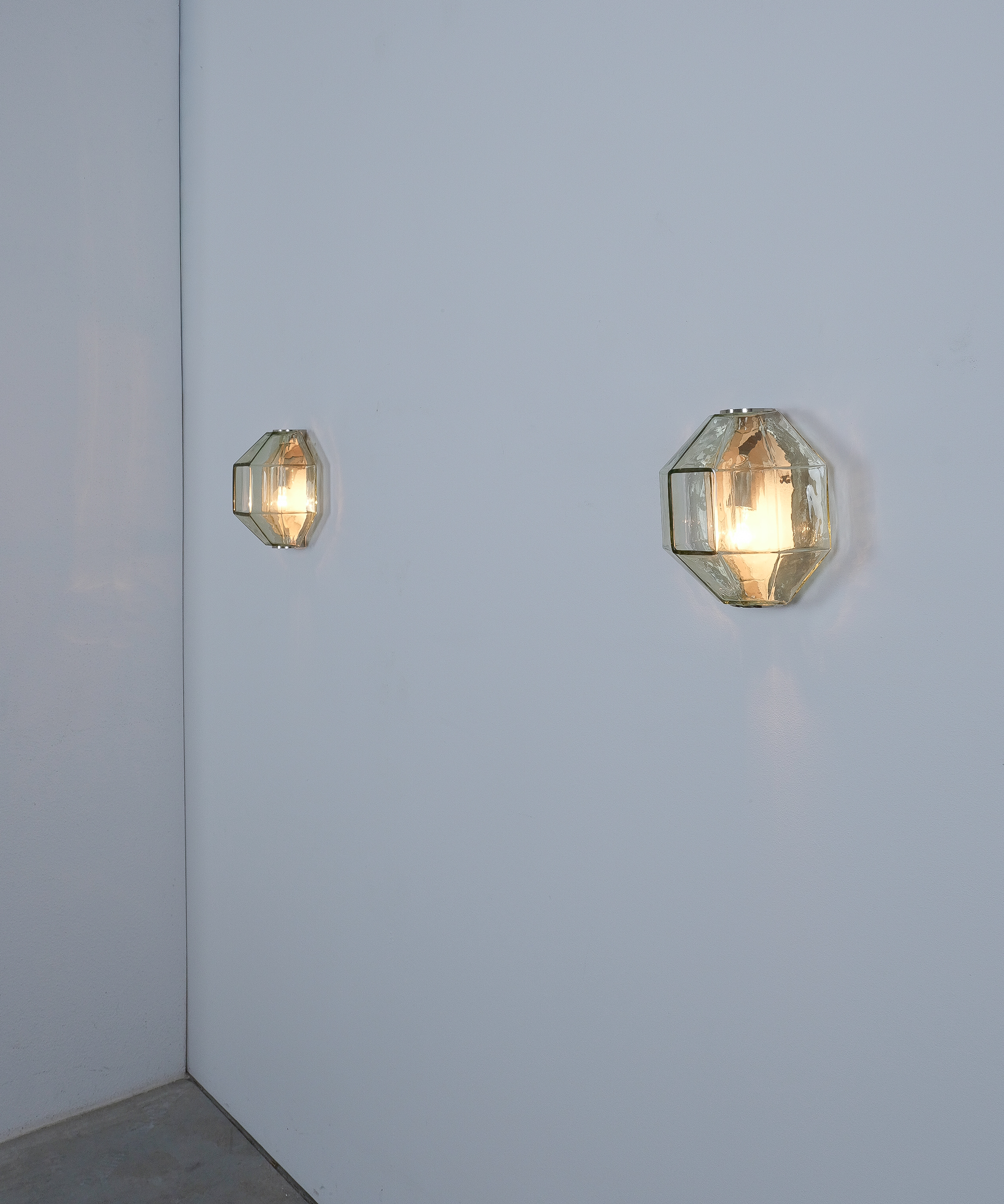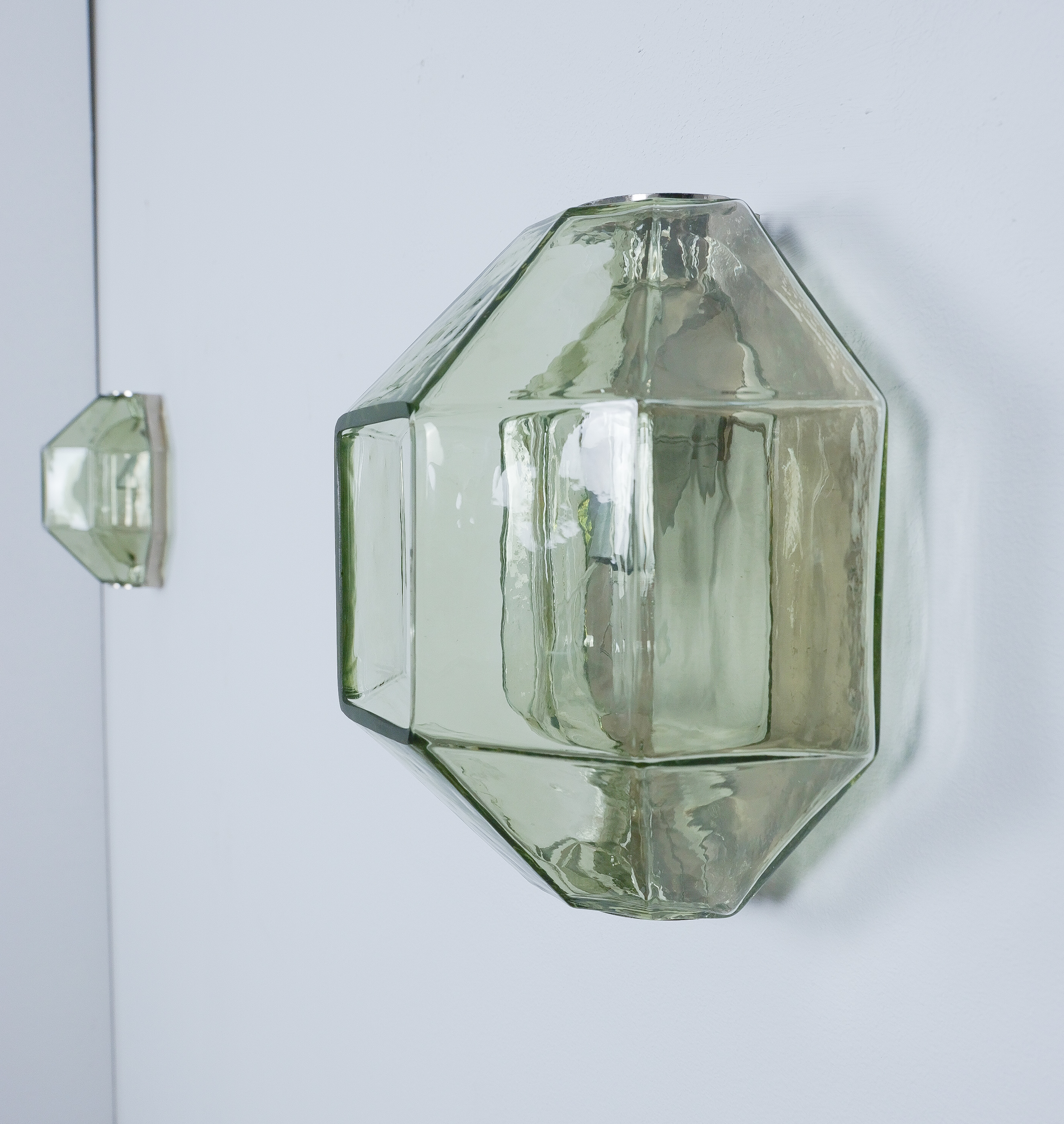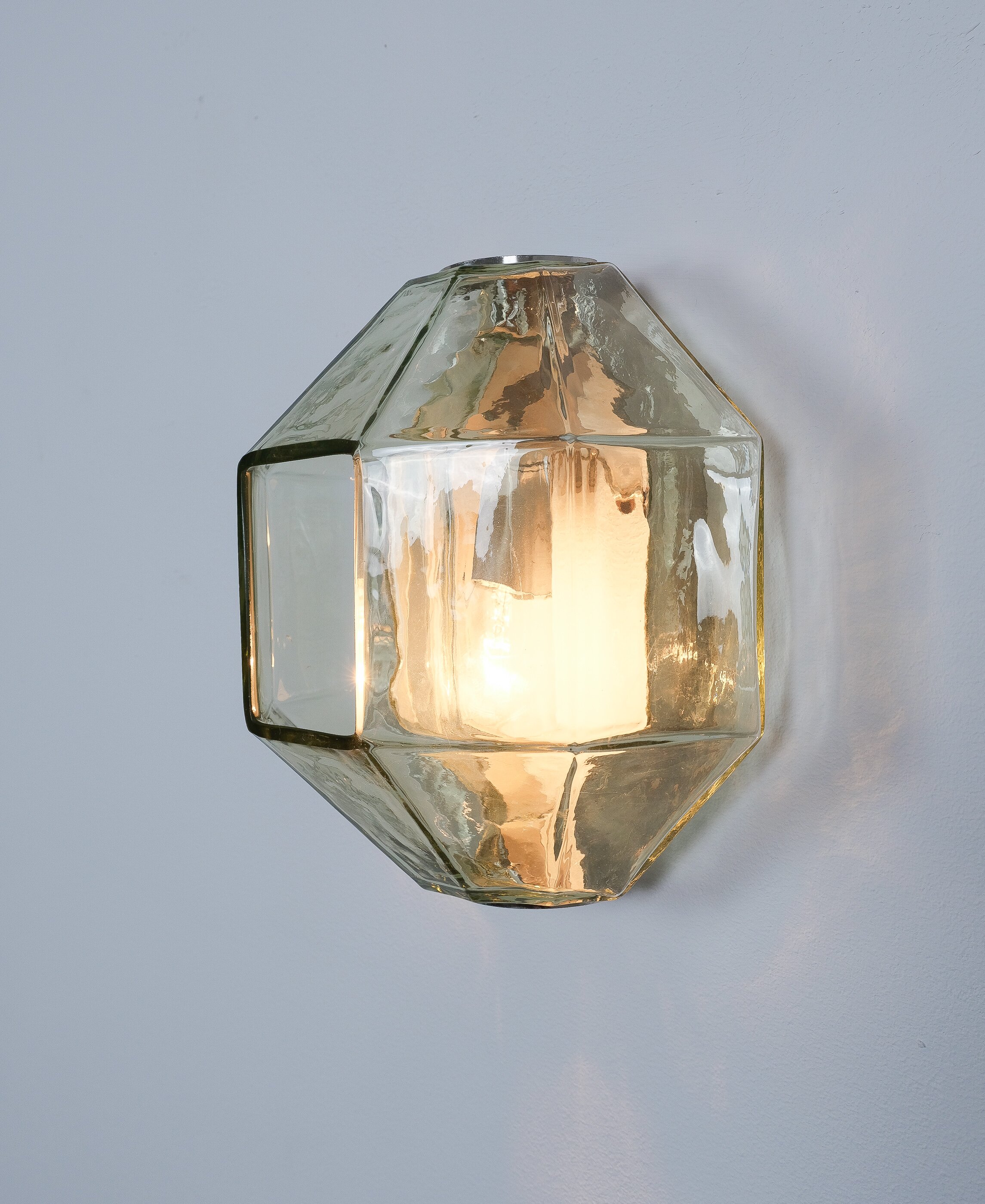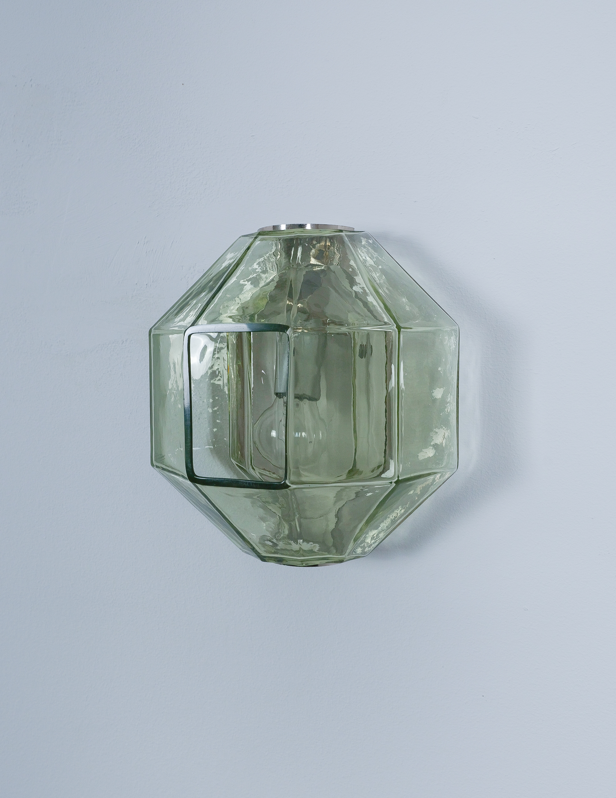 This sculptural ensemble exemplifies Vianello’s refined approach to mid-century lighting, where Venetian glassmaking traditions converge with a distinctly architectural sensibility. Each sconce is composed of a polygonal blown-glass element in a delicate light green tone with a subtle champagne inflection, its faceted geometry gently modulating the light and enhancing the material’s inherent luminosity. The glass bodies are secured between precisely articulated, nickeled metal brackets whose linear rigor provides a measured counterpoint to the organic vitality of the blown forms.
