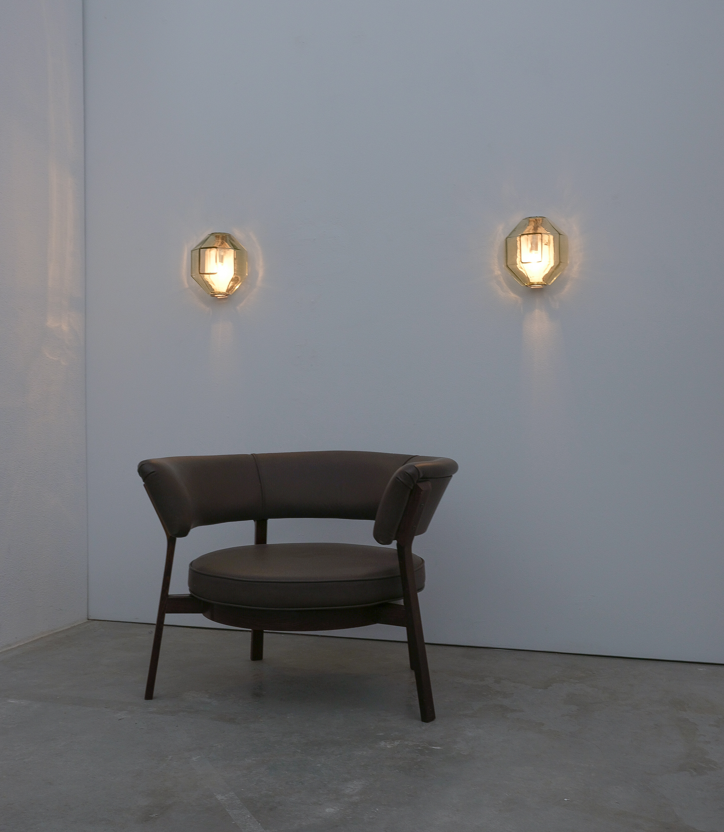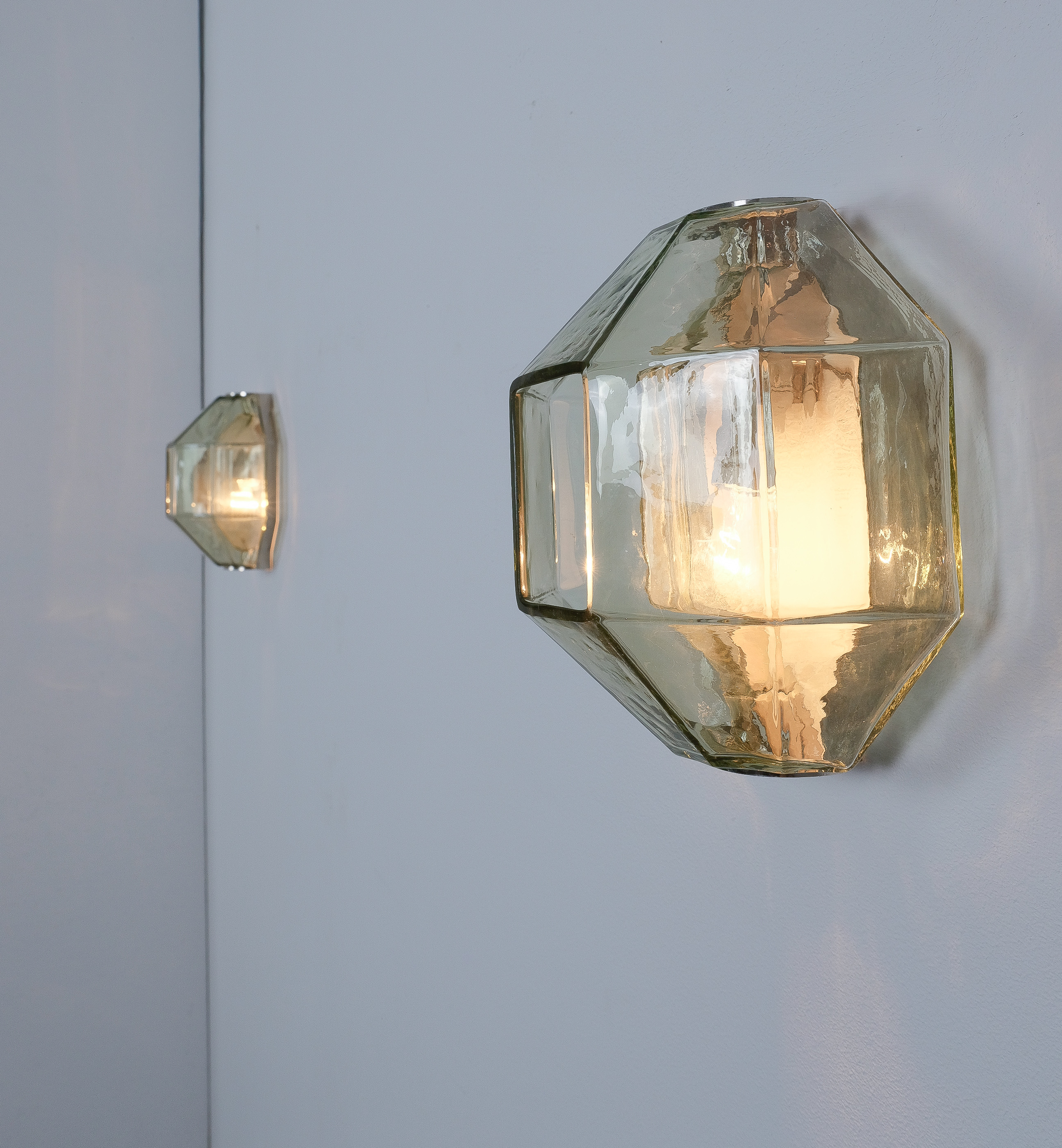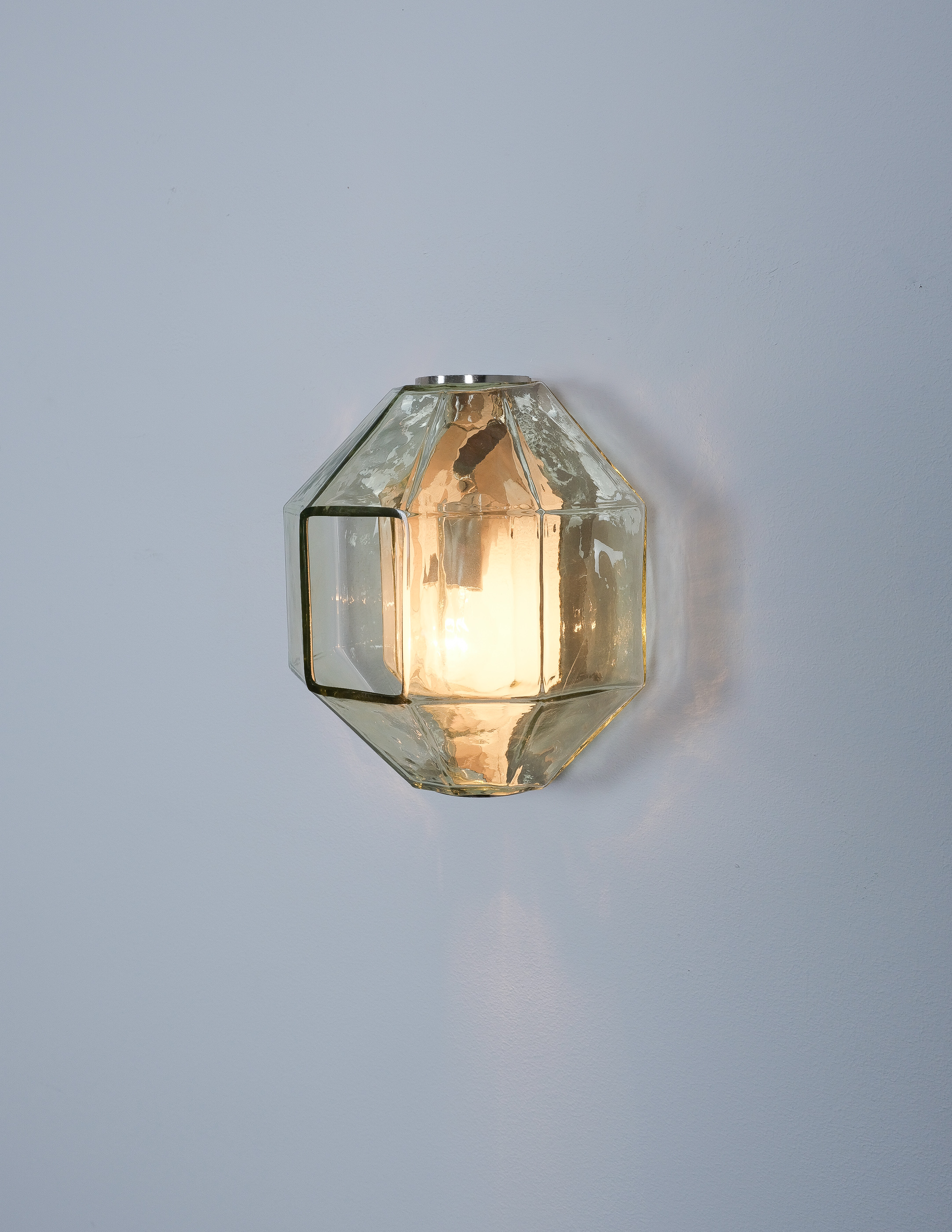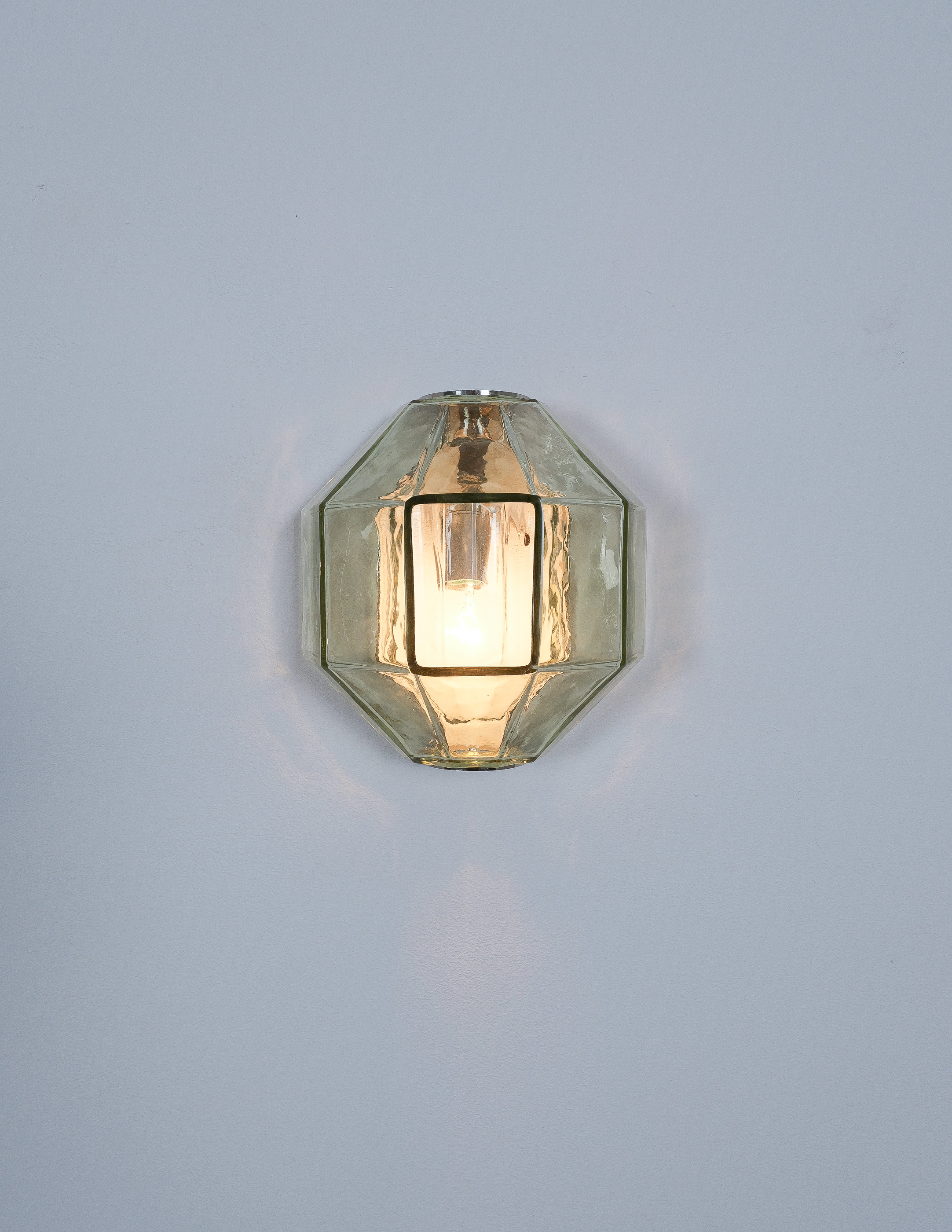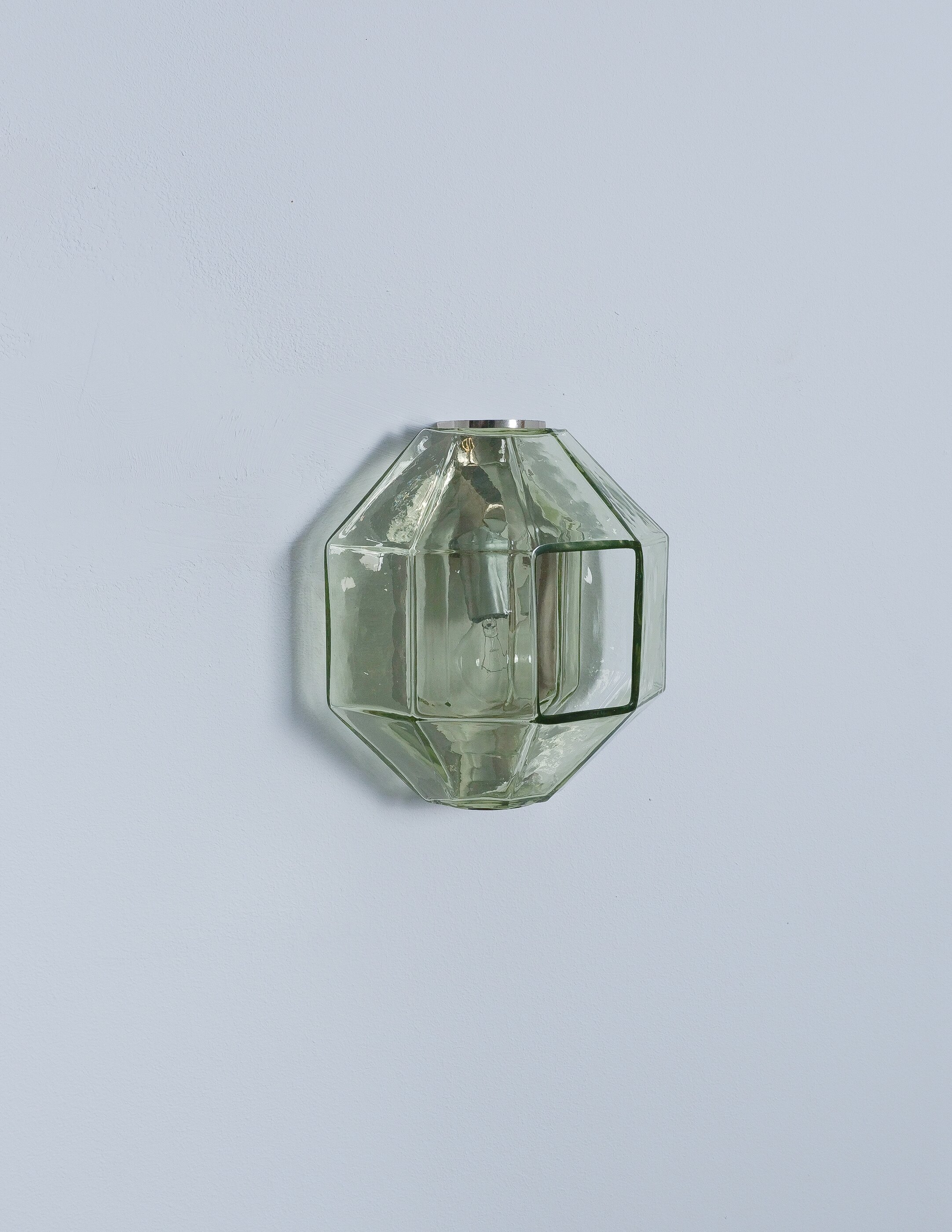 This sculptural ensemble exemplifies Vianello’s refined approach to mid-century lighting, where Venetian glassmaking traditions converge with a distinctly architectural sensibility. Each sconce is composed of a polygonal blown-glass element in a delicate light green tone with a subtle champagne inflection, its faceted geometry gently modulating the light and enhancing the material’s inherent luminosity. The glass bodies are secured between precisely articulated, nickeled metal brackets whose linear rigor provides a measured counterpoint to the organic vitality of the blown forms.