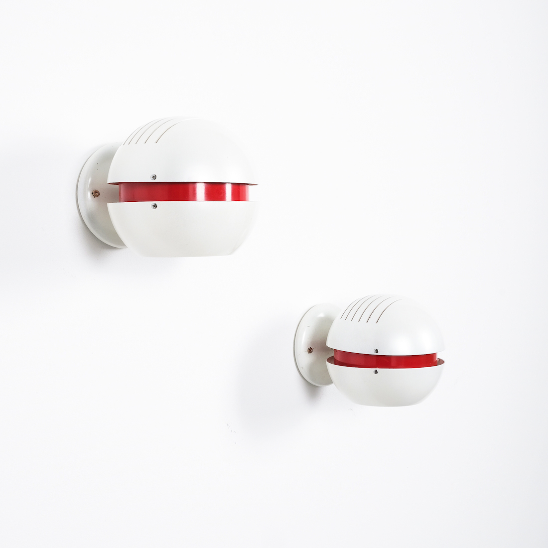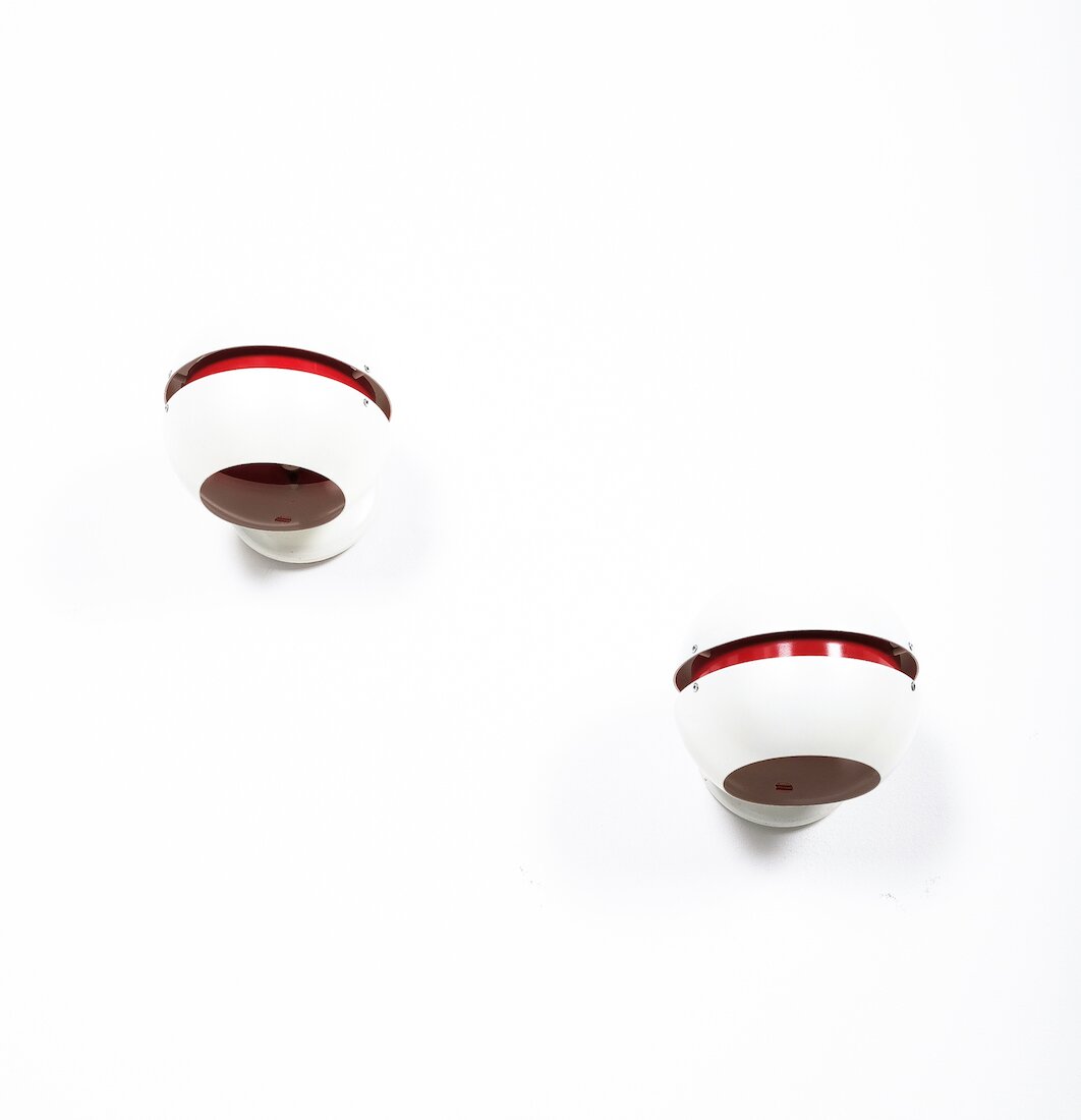 Beautiful vintage Italian wall lamps, aluminium sheet, enameled pearly white and red with a visor effect once illuminated.