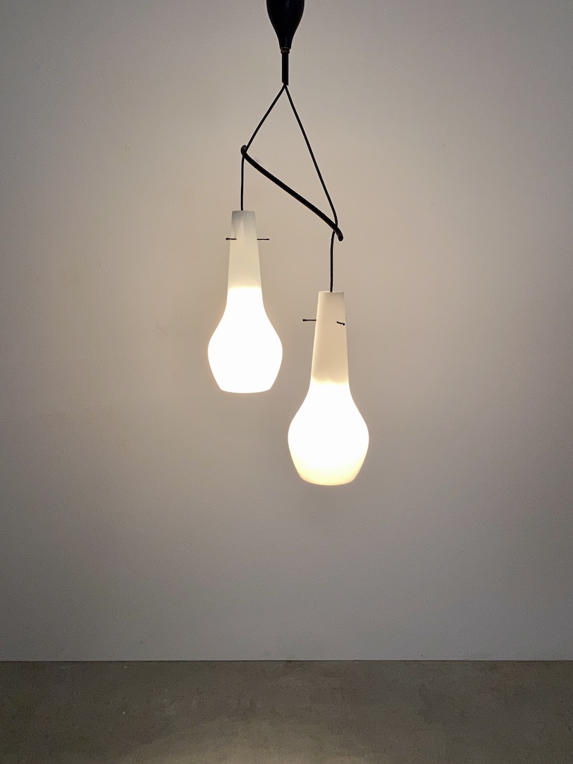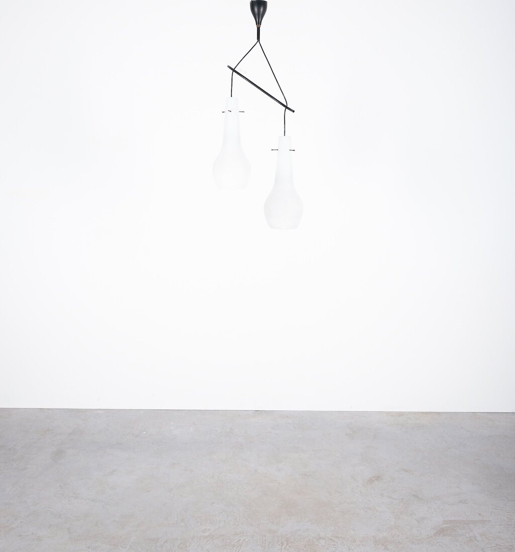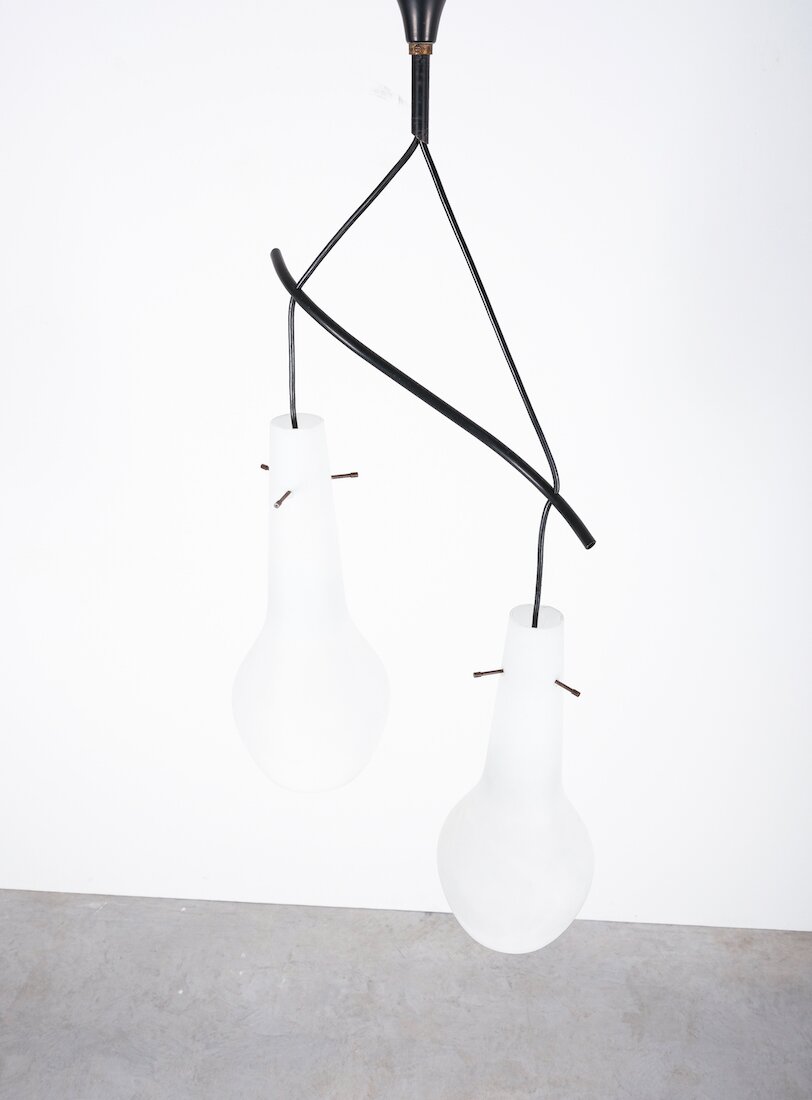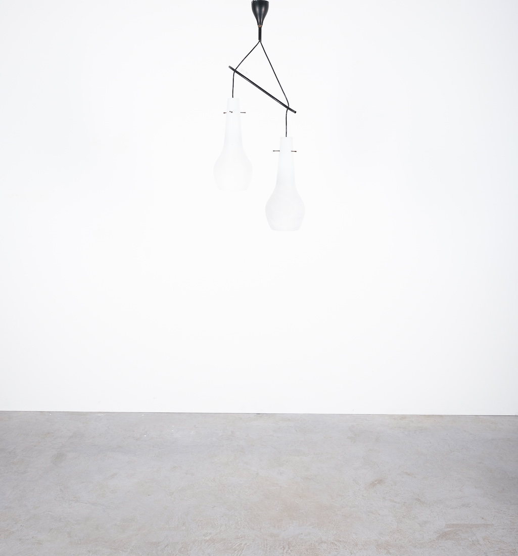 Wonderful double-suspension lamp with a black lacquered brass beam and white opal pear shaped glass shades in different drop heights.