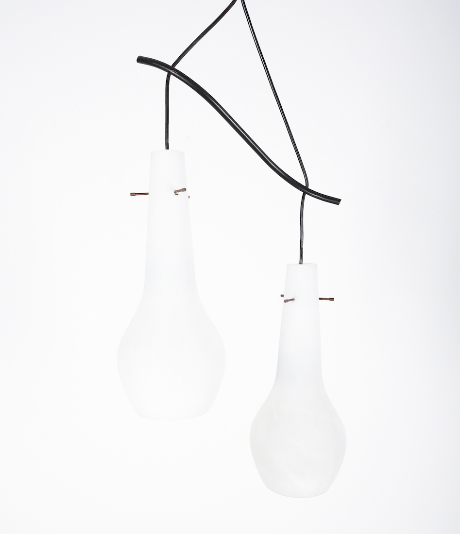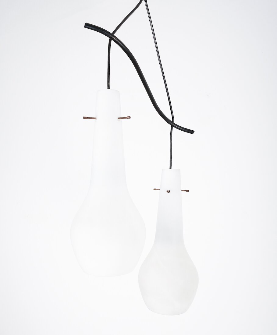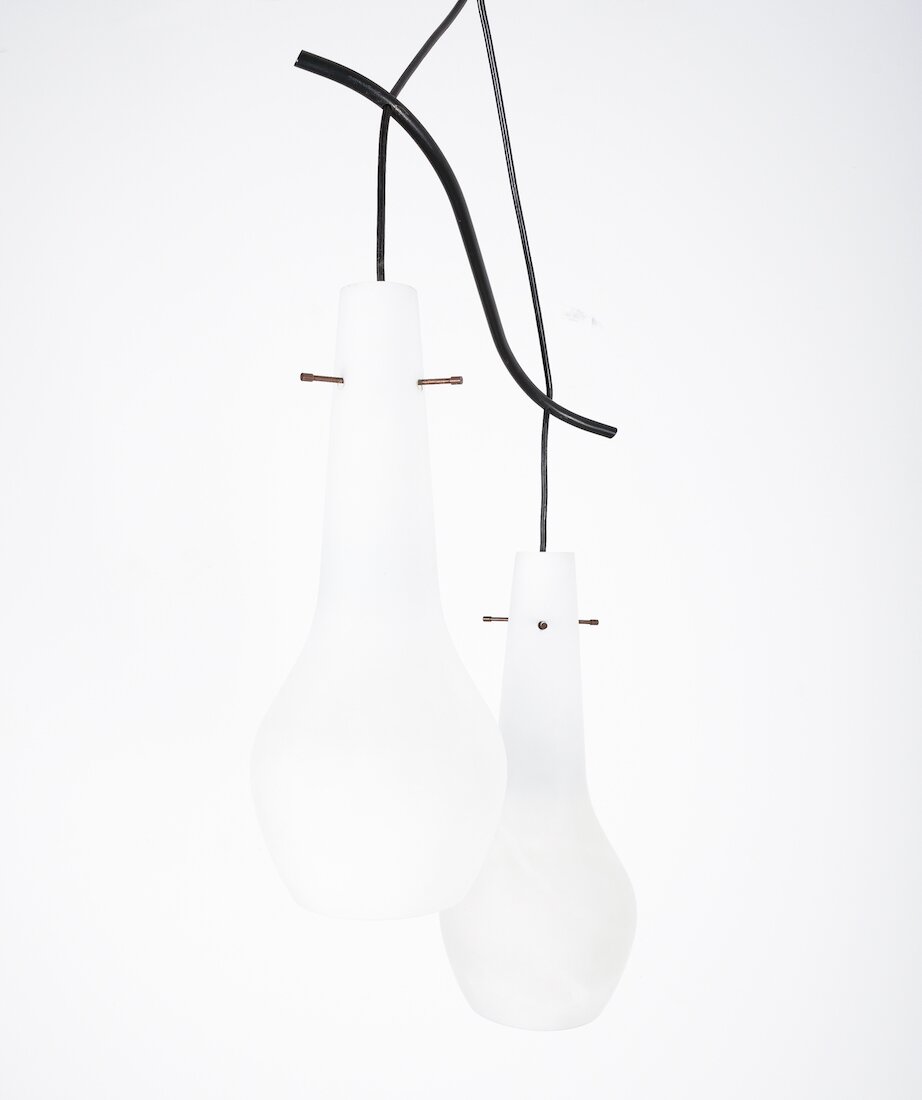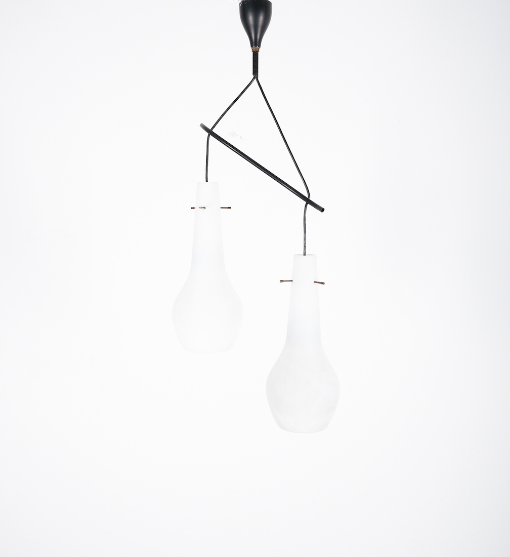 Wonderful double-suspension lamp with a black lacquered brass beam and white opal pear shaped glass shades in different drop heights.