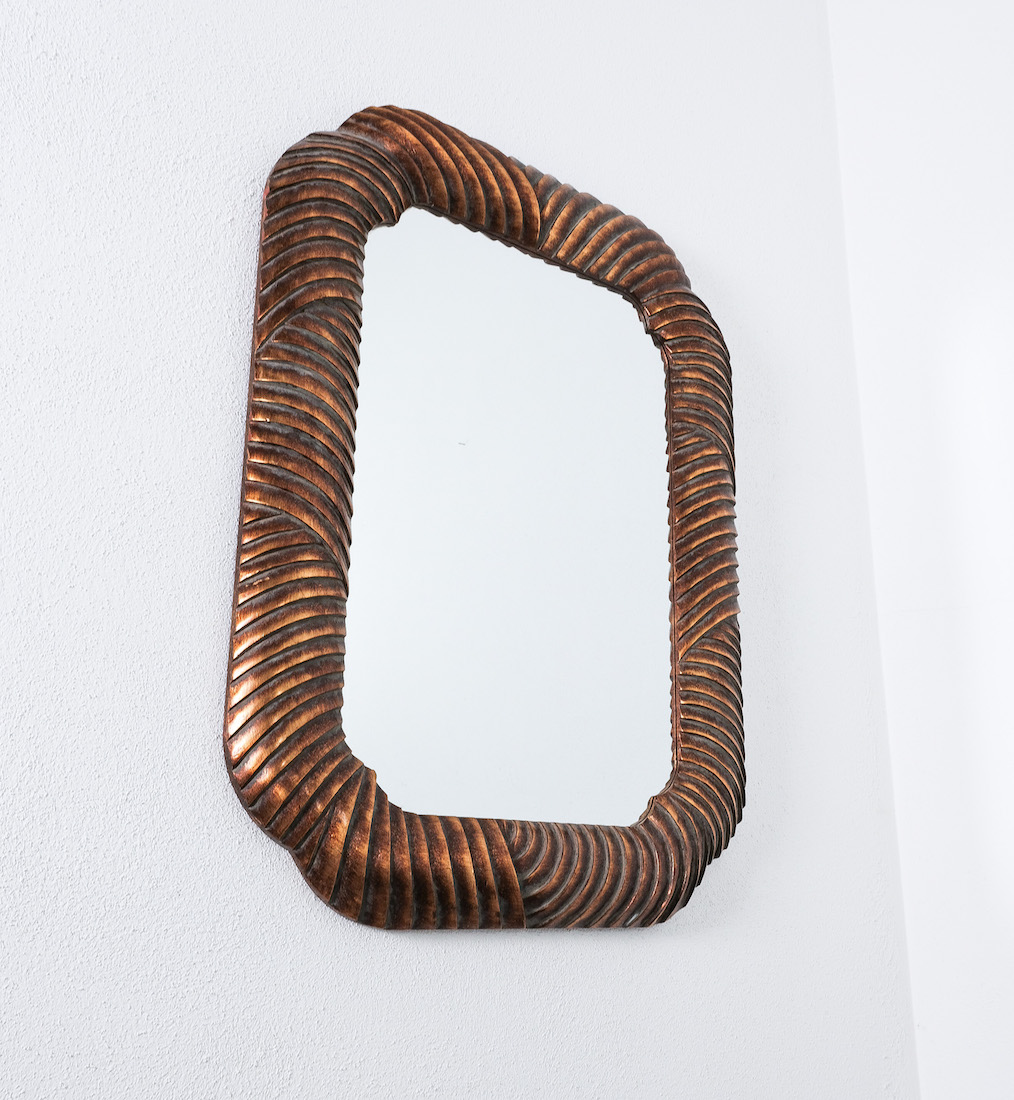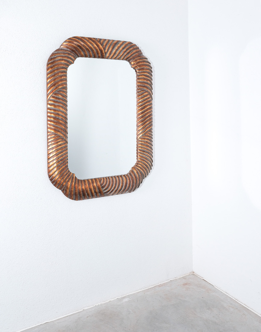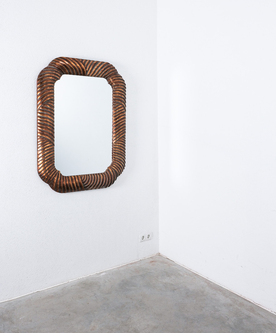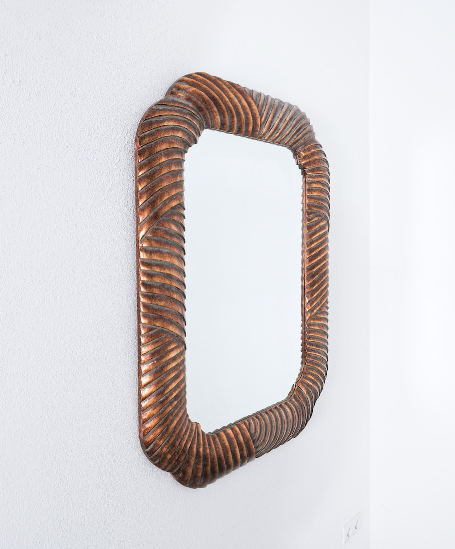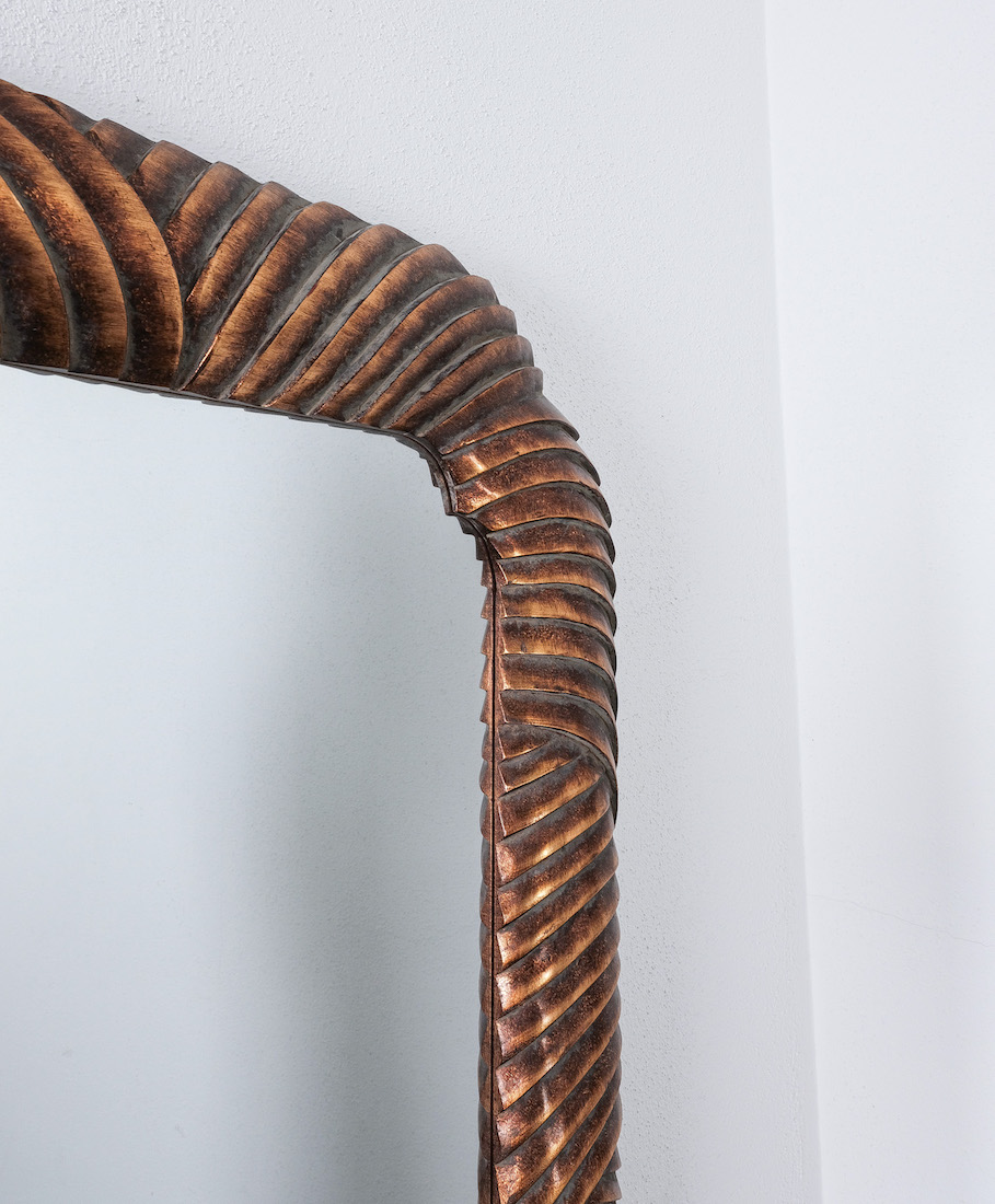Hand-carved enormous wooden frame mirror with a trompe l‘oeil effect, 1970.