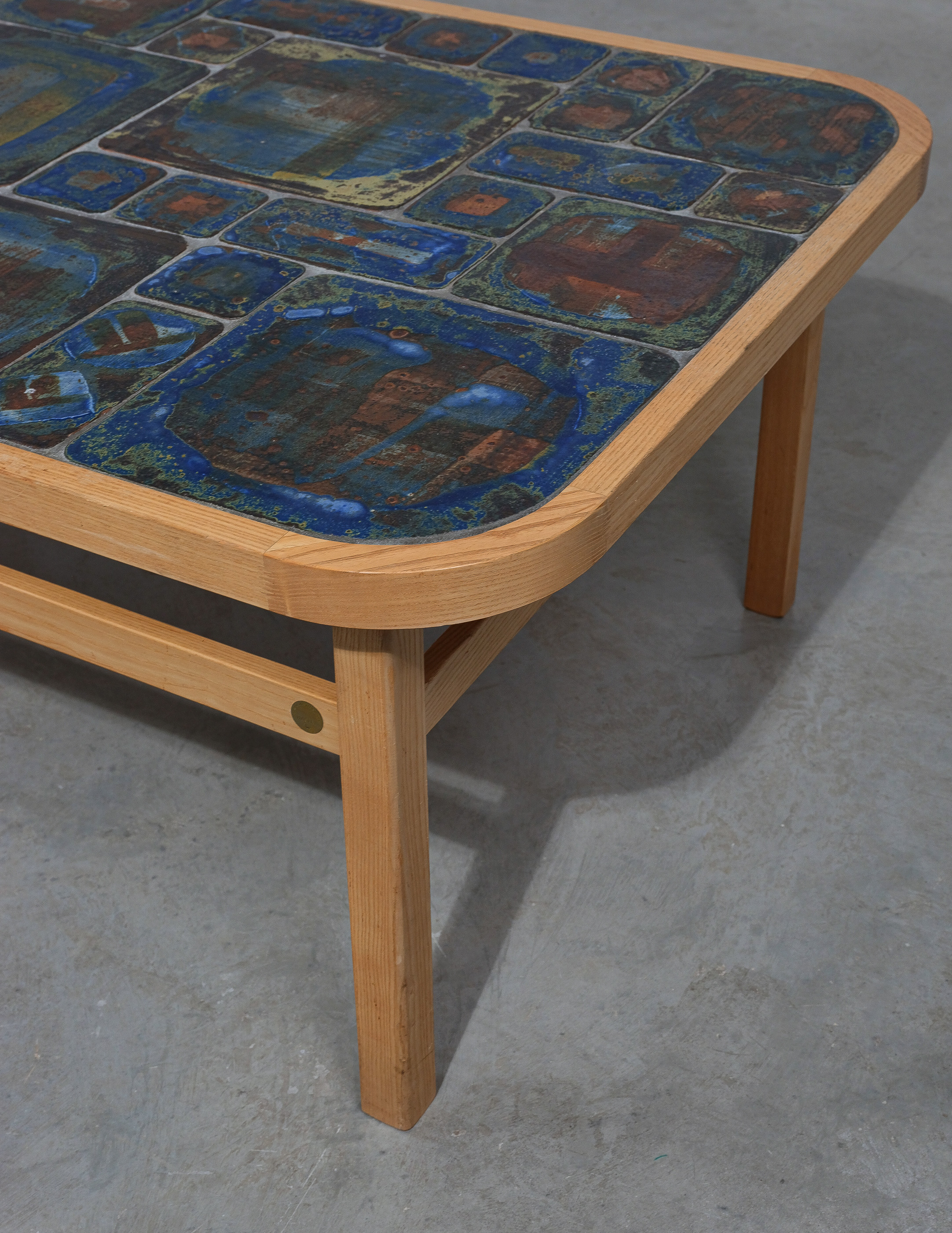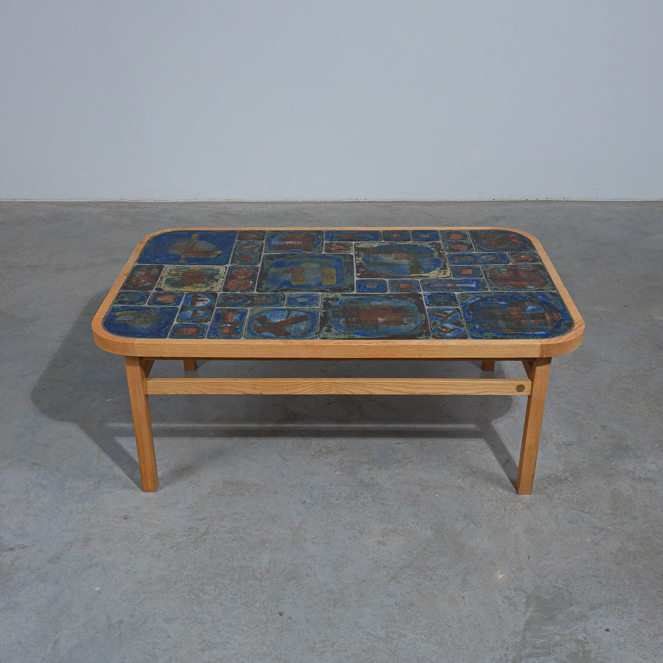 A very well balanced and harmonic large coffee table from ceramic tiles and beech-wood in good to very good condition. The heavy table top is filled with tiles from different sizes and colors. These are mainly in the range from blue, red and yellow tones. It sits on a floating wooden frame. Handcrafted and in very good condition with hardly any signs of use and time. Two dents are present which are hardly noticeable, otherwise no major damages. The piece will be crated for transport. Tue Poulsen is a renowned Danish ceramist, designer, and visual artist, best known for his brutalist studio pottery from the 1960s and 1970s. His work is often characterized by a rustic, brutalist aesthetic and is considered collectible Danish Mid-Century Modern design. He explores various styles, from large stoneware sculptures to delicate porcelain. Dimensions are: 54" x 34.25" x 21.25".